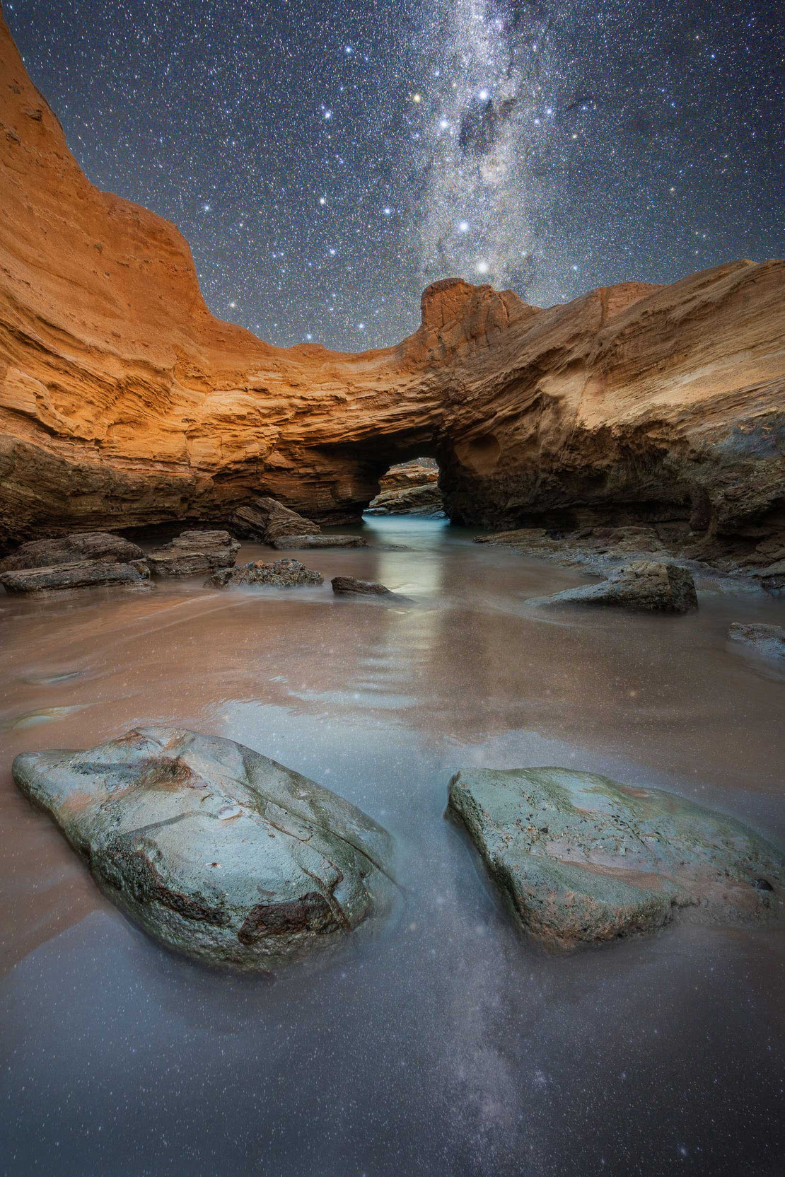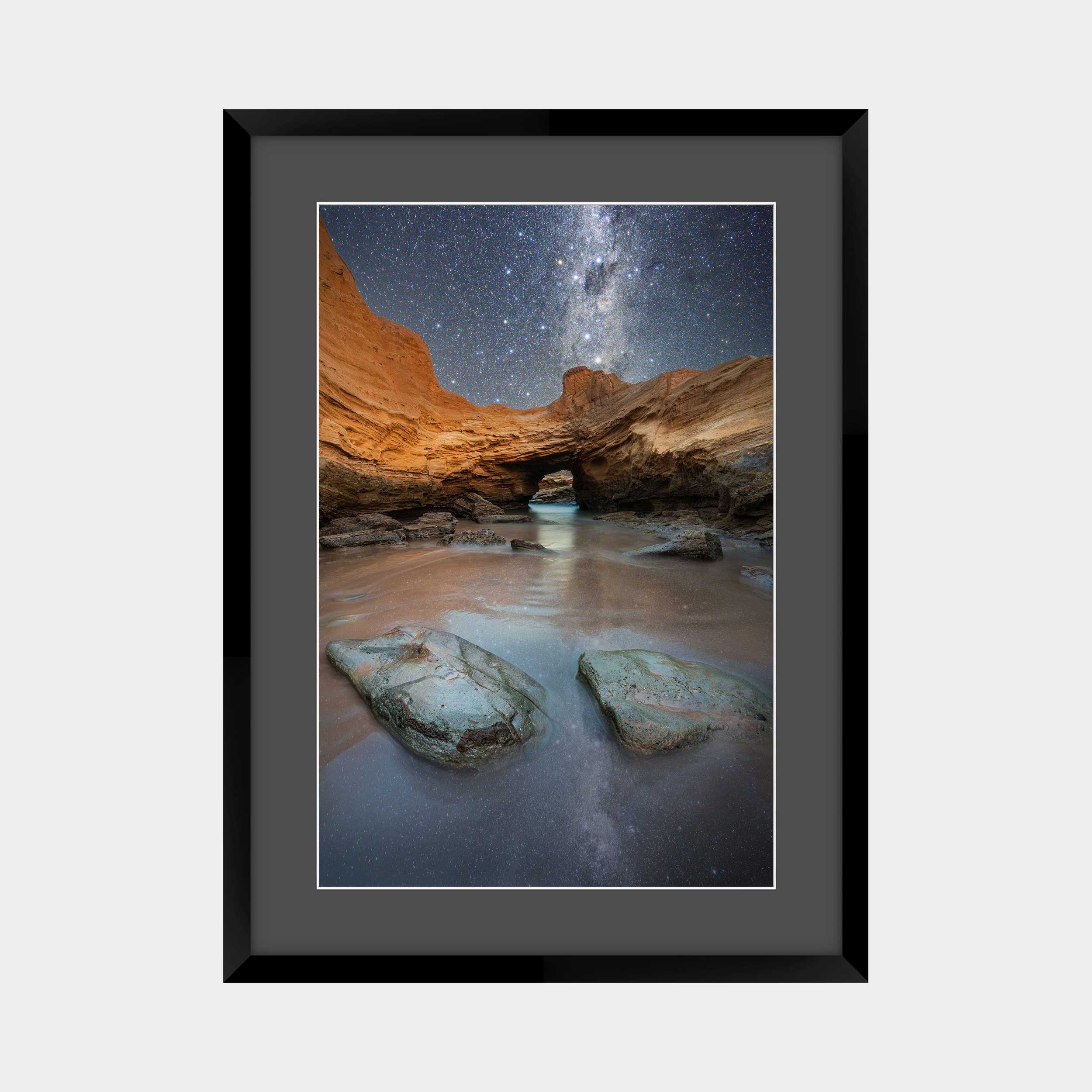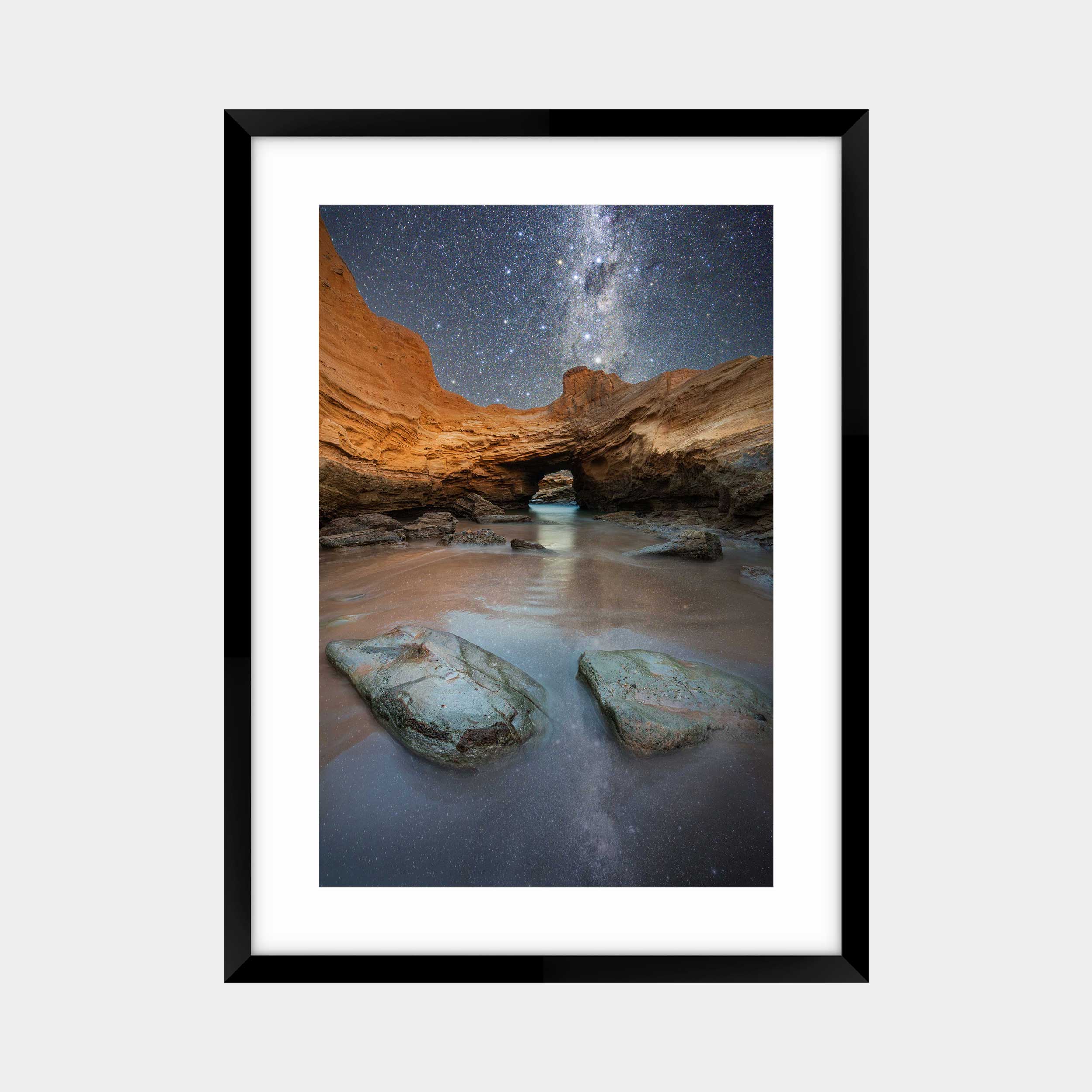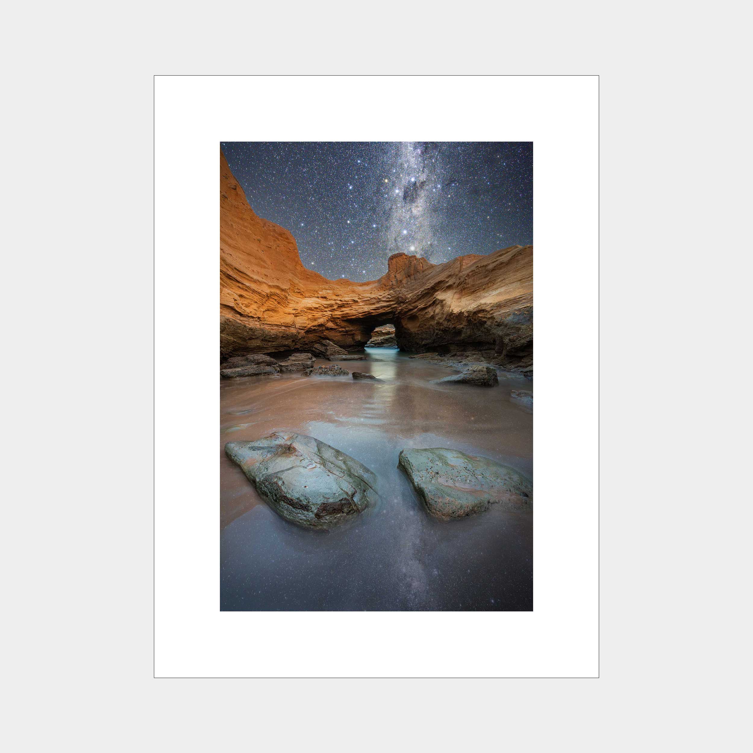 "Aireys' Celestial Archway" captures the awe-inspiring Milky Way gracefully arching over a striking rock formation on the rugged coast of Aireys Inlet, Victoria. This photograph showcases the ancient geological features under a sky ablaze with countless stars, creating a profound and timeless tableau where earthly and cosmic wonders converge.