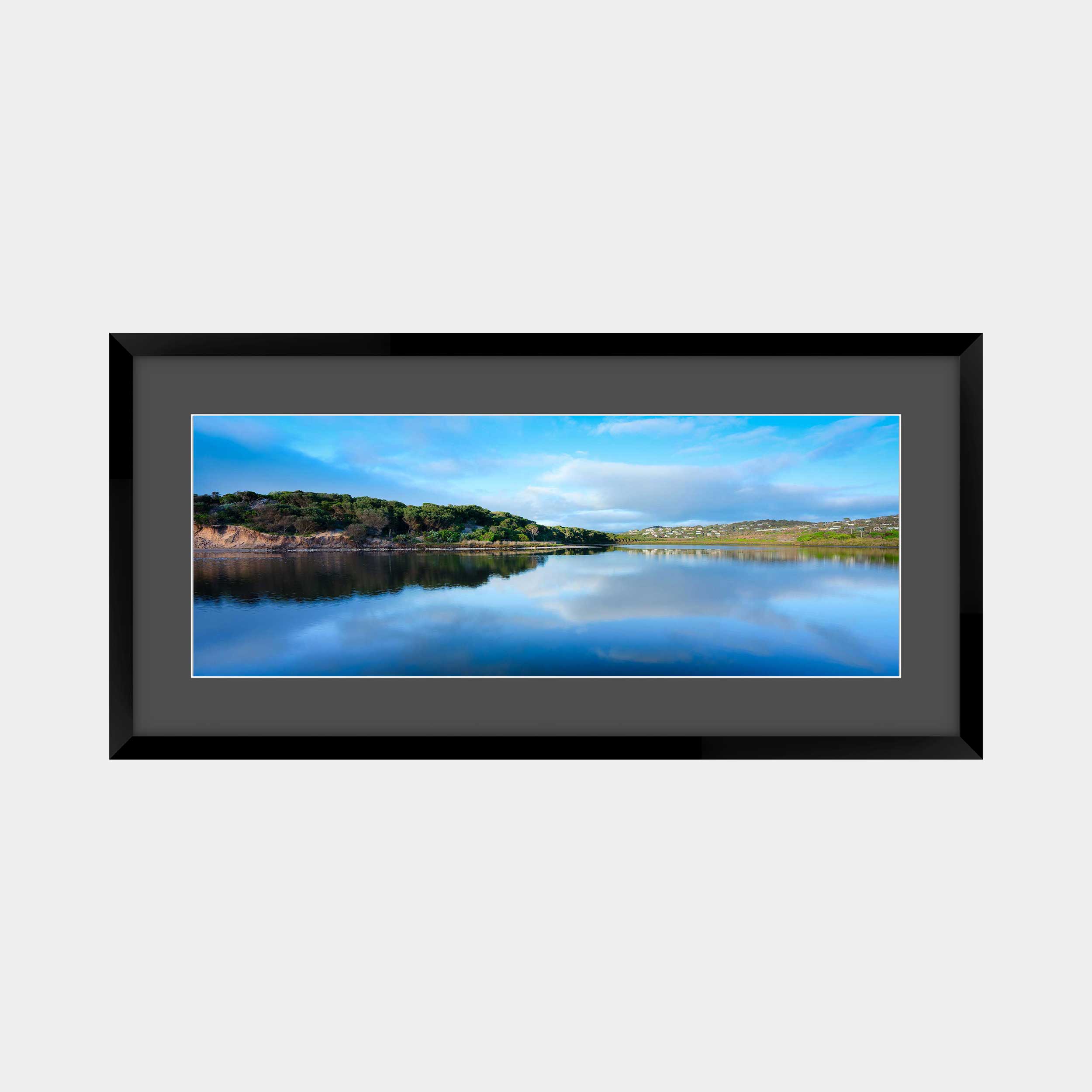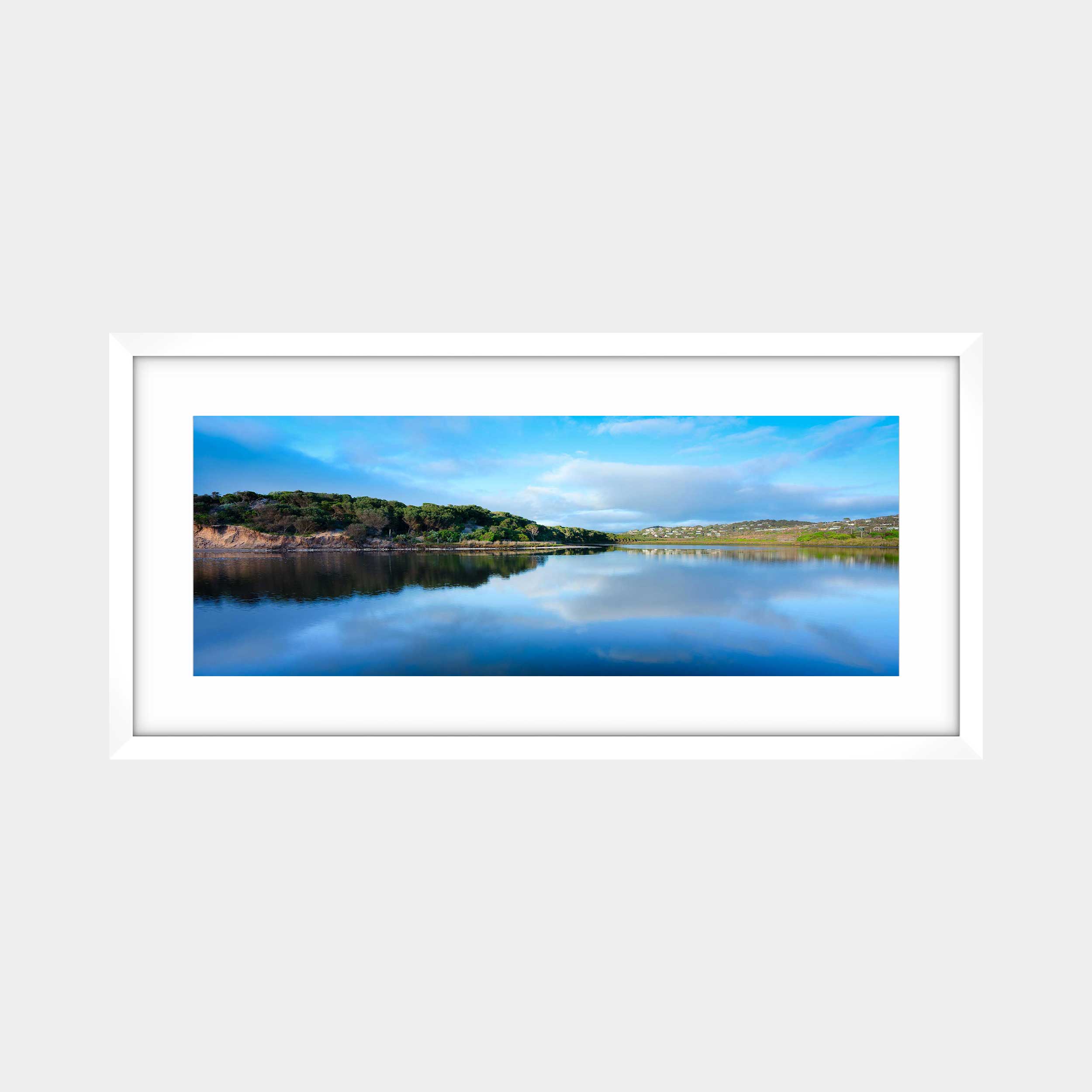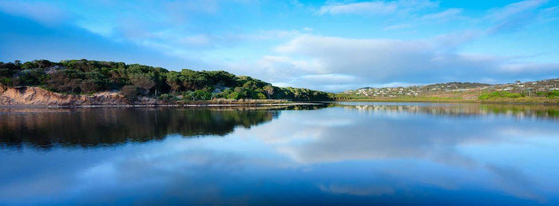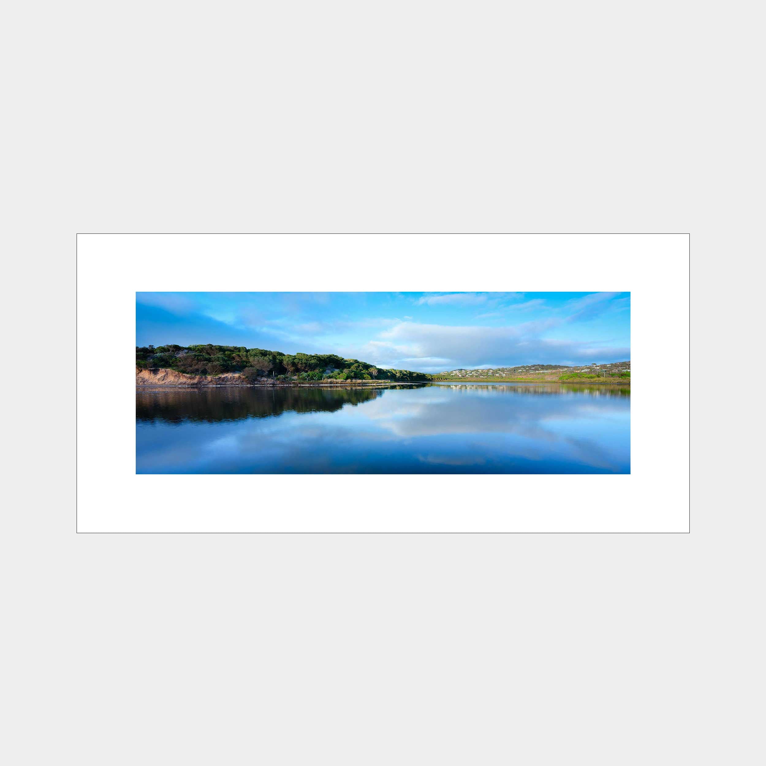 "Aireys' Serene Reflection" beautifully captures the tranquil waters of Aireys Inlet, Victoria, under a expansive blue sky. This photograph showcases the stillness of the water, perfectly mirroring the clouds and distant coastline, creating a harmonious and deeply peaceful scene that embodies the quiet charm of this coastal haven.