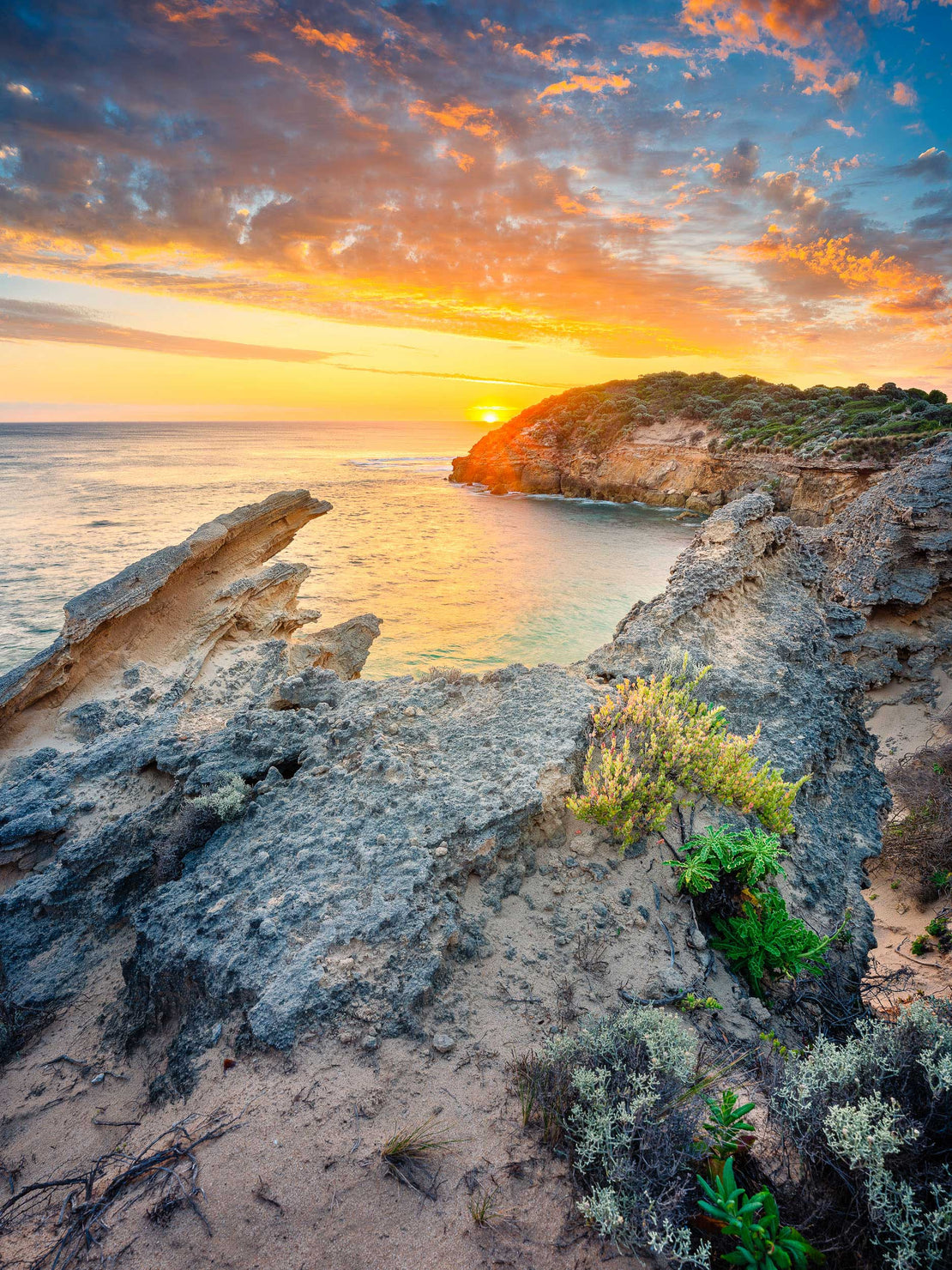 "Bridgewater's Fiery Coast" captures a dramatic sunset over the rugged coastline of Bridgewater Bay, Victoria, Australia. This vivid photograph showcases ancient, textured rock formations glowing with the warm light of dusk, contrasting beautifully with the tranquil waters of the bay and the distant horizon ablaze with color, embodying the raw beauty and peaceful end to a day on this spectacular coast.