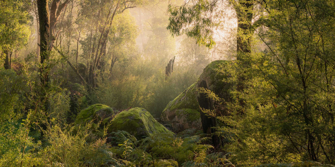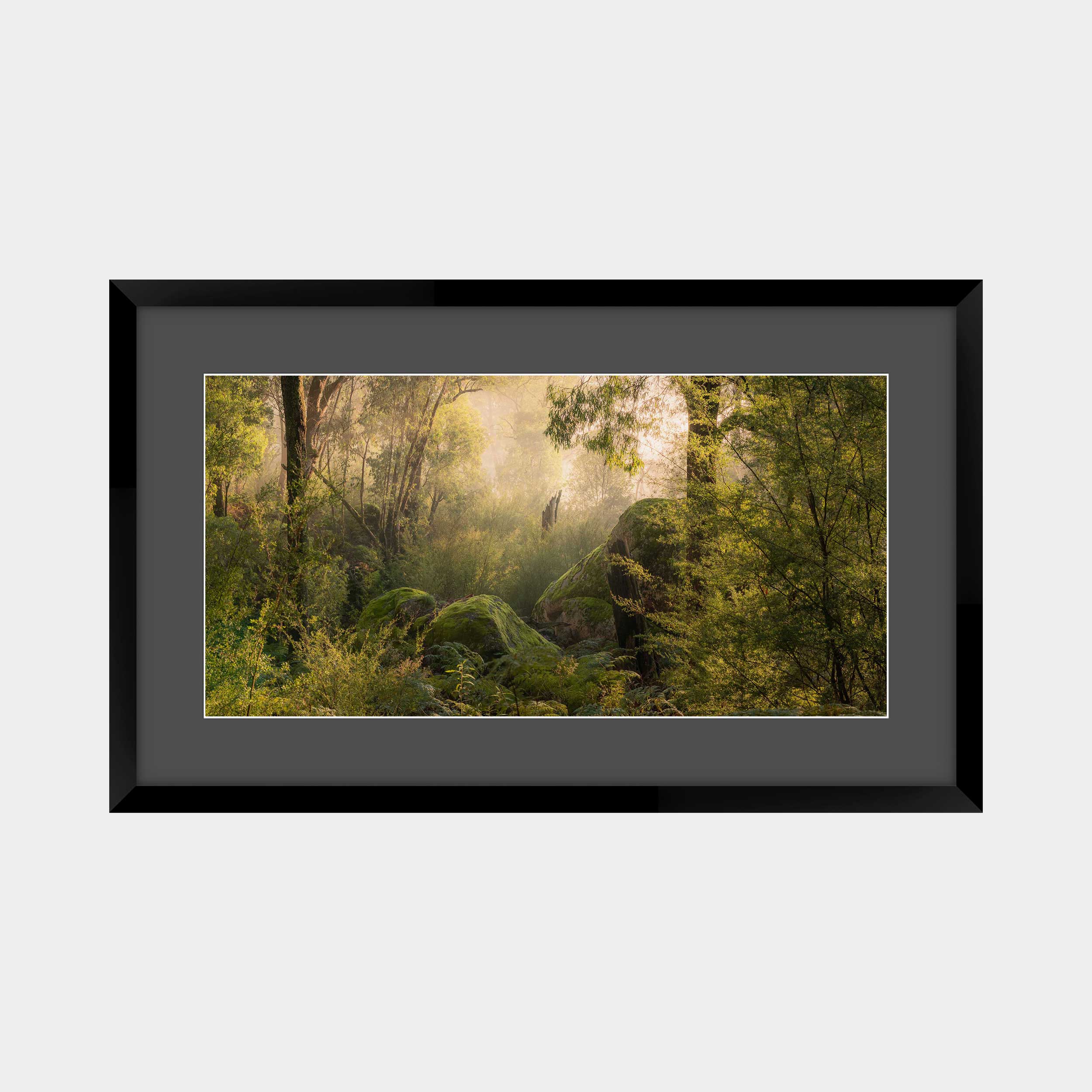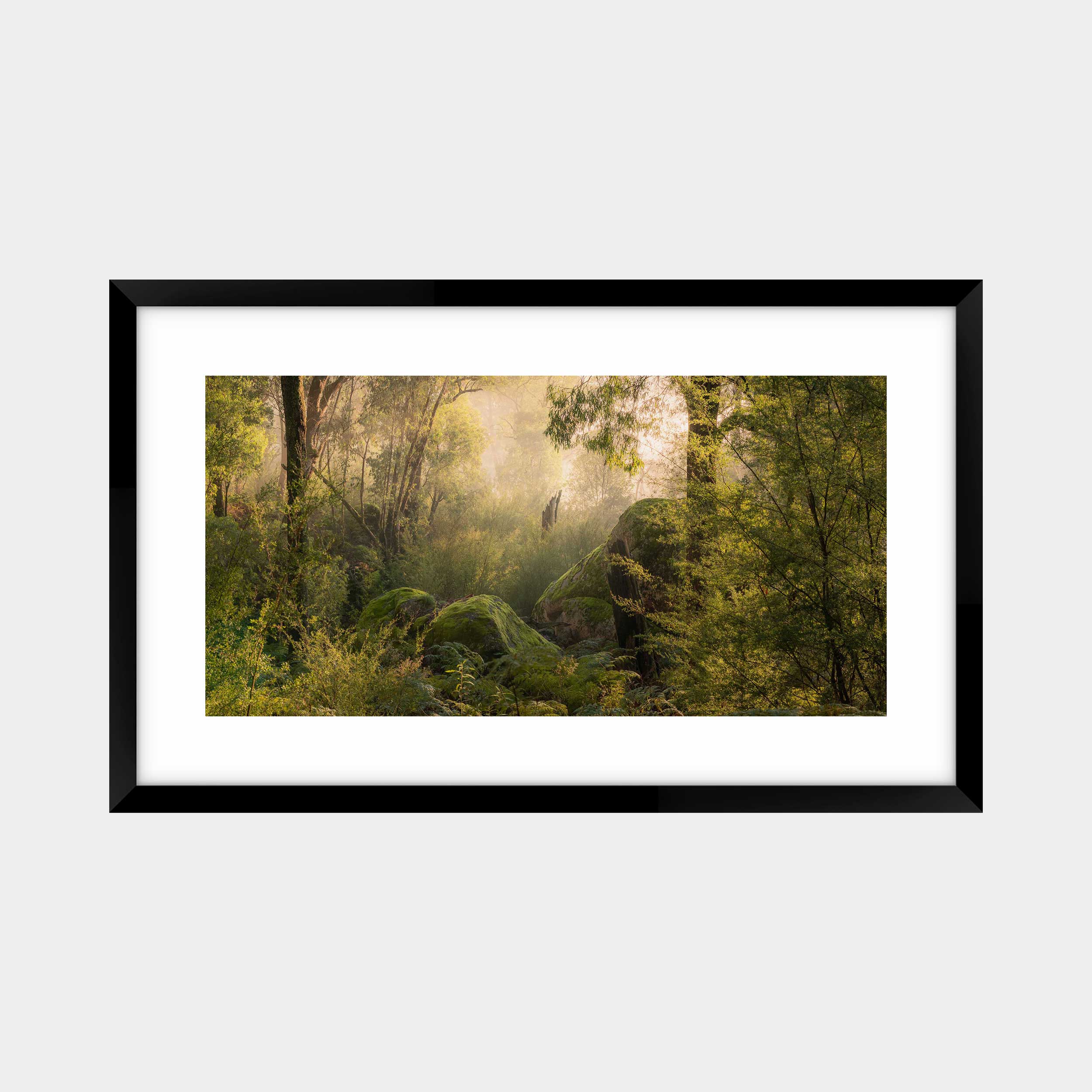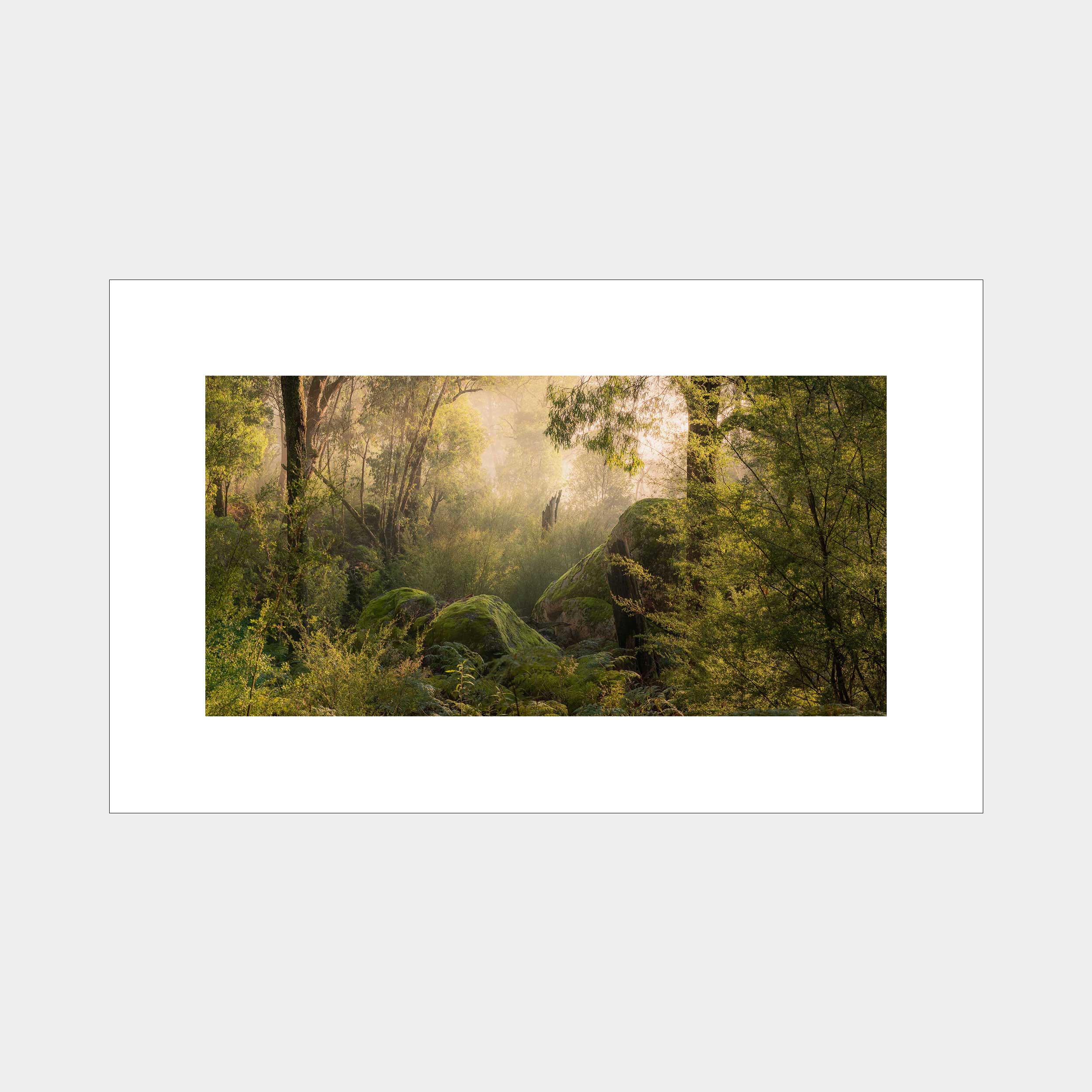 "Buffalo's Golden Whisper" captures a magical, fleeting moment within Victoria's Mount Buffalo National Park shortly after sunrise. This photograph showcases the lush, moss-covered boulders and vibrant forest under a radiant cascade of golden sunlight, revealing the ethereal beauty of a natural landscape briefly illuminated before the light receded.