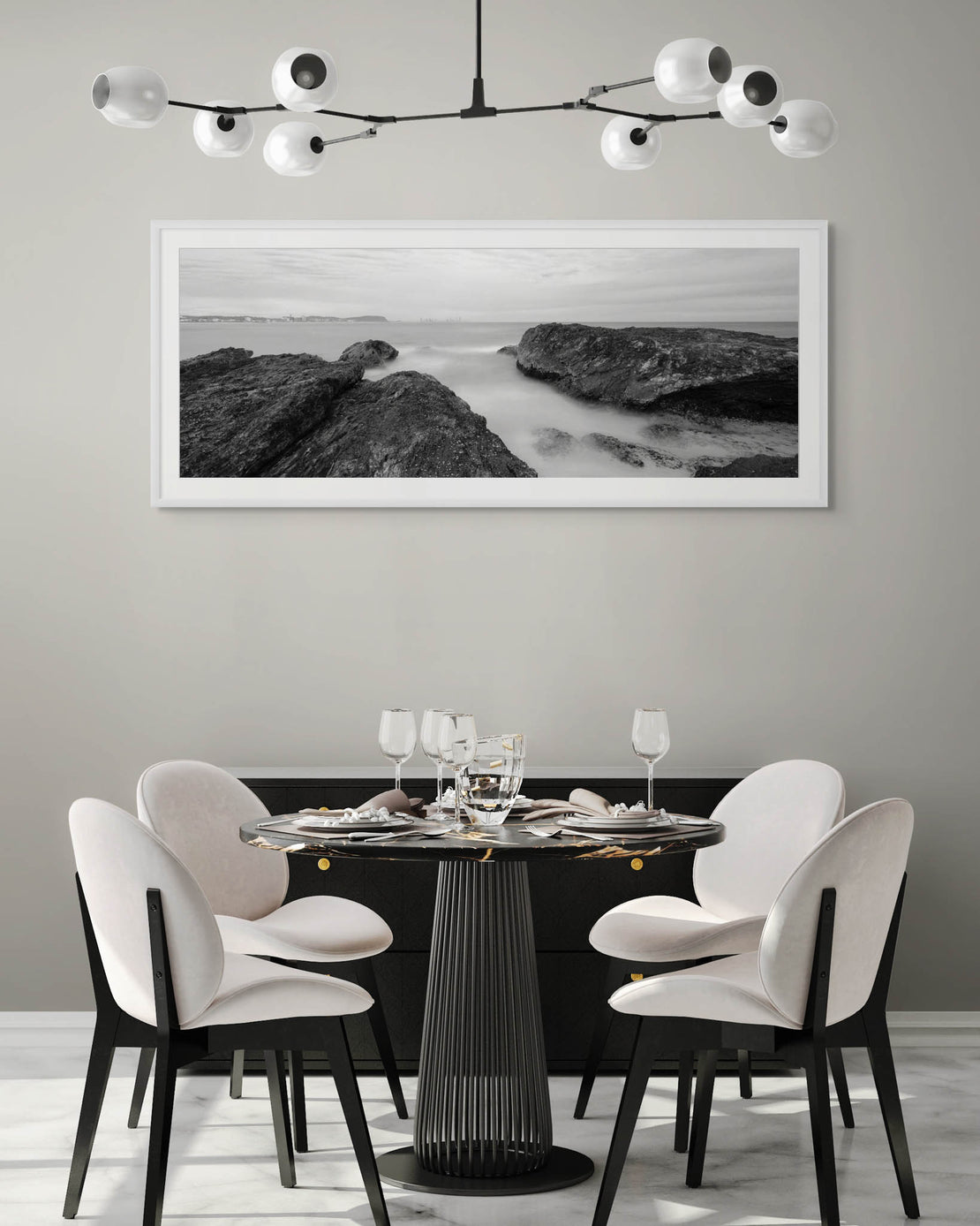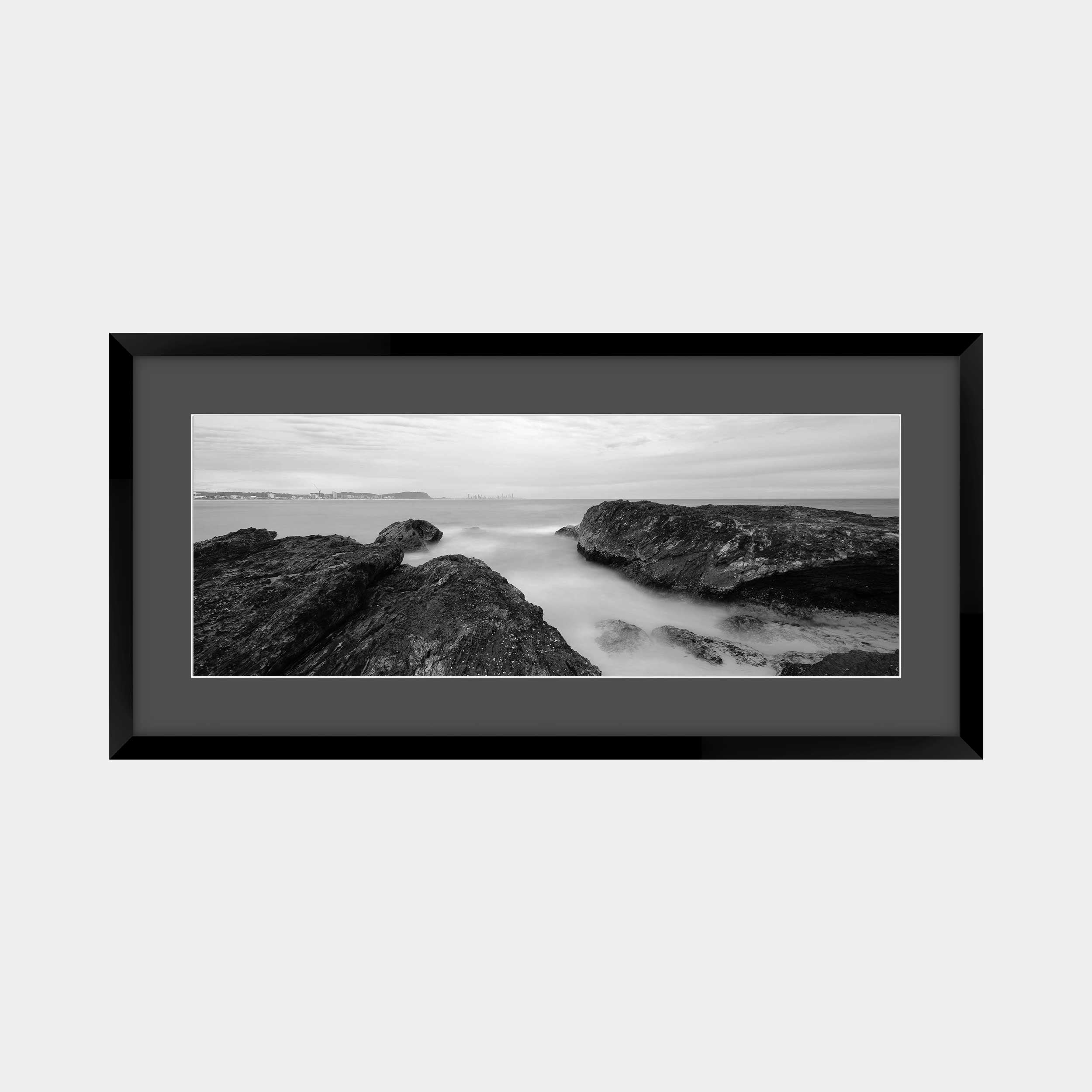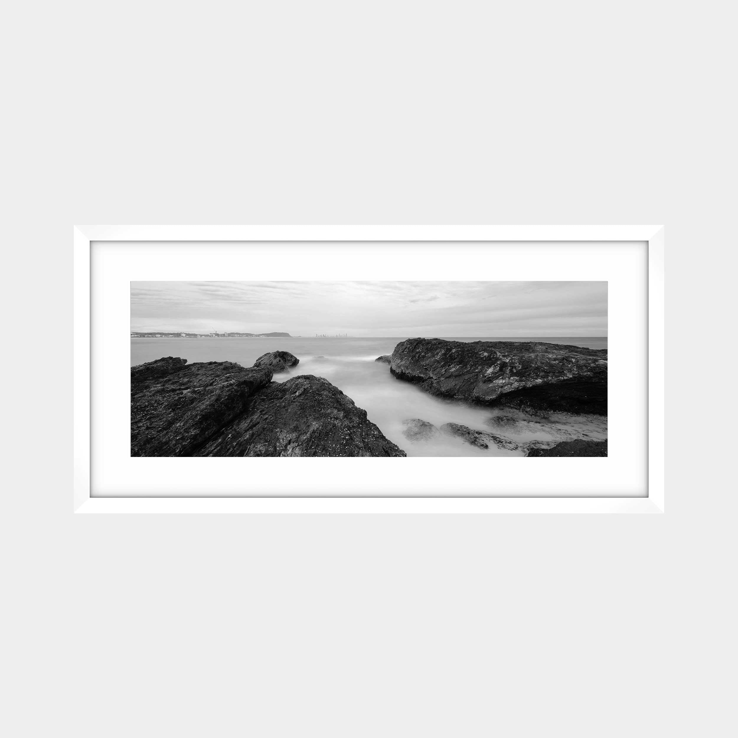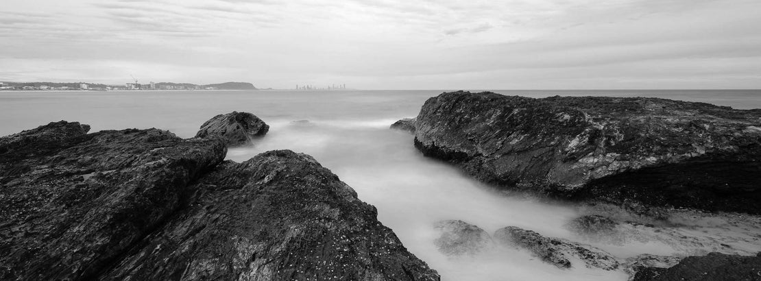 "Burleigh's Granite Guardians" captures the iconic rugged headland of Burleigh Beach in Queensland, Australia, presented in a timeless black and white panorama. This photograph highlights the dramatic rock formations standing against the softened ocean, with the distant city skyline subtly visible, creating a powerful juxtaposition of nature's enduring strength and urban presence.