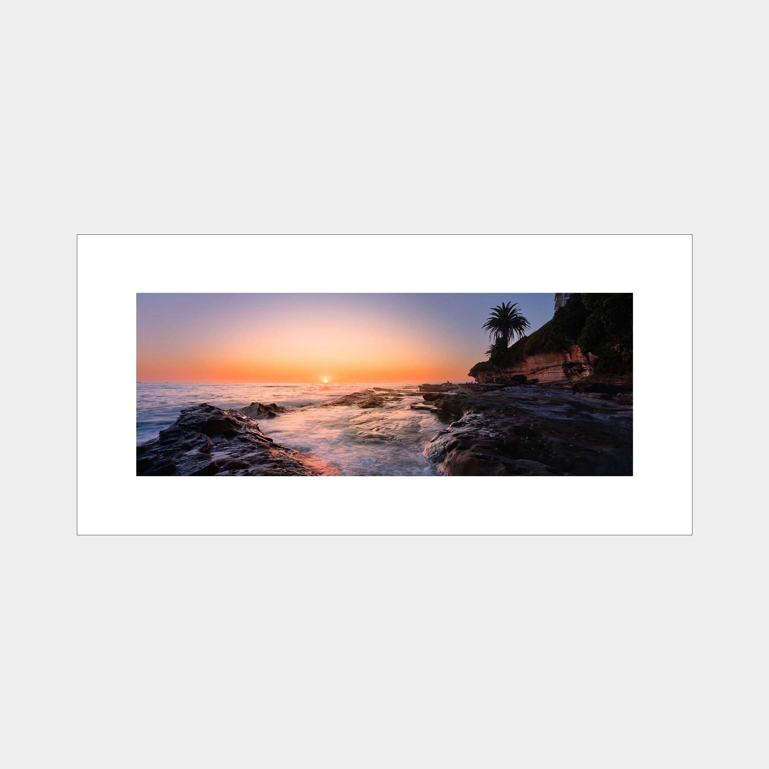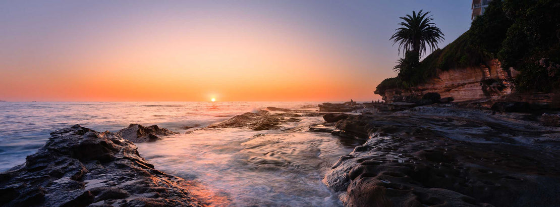 "Cronulla's Golden Horizon" captures the serene and radiant beauty of sunrise over the coastline of Cronulla, NSW, Australia. This panoramic photograph showcases rugged rock platforms leading to the ocean, bathed in the warm, golden light of the rising sun, with gentle waves creating a soft, ethereal flow, embodying a tranquil start to the day by the sea.
