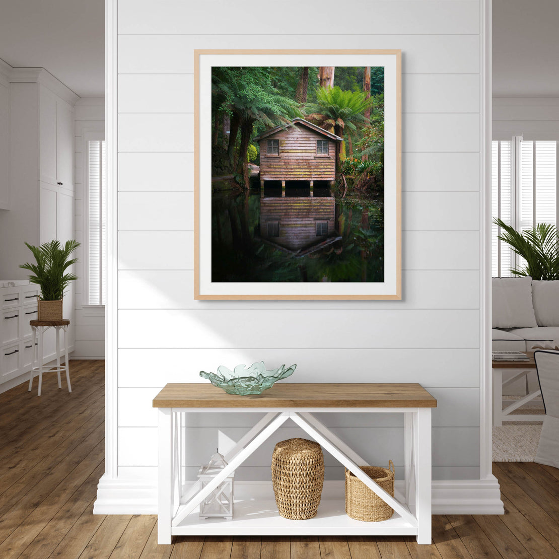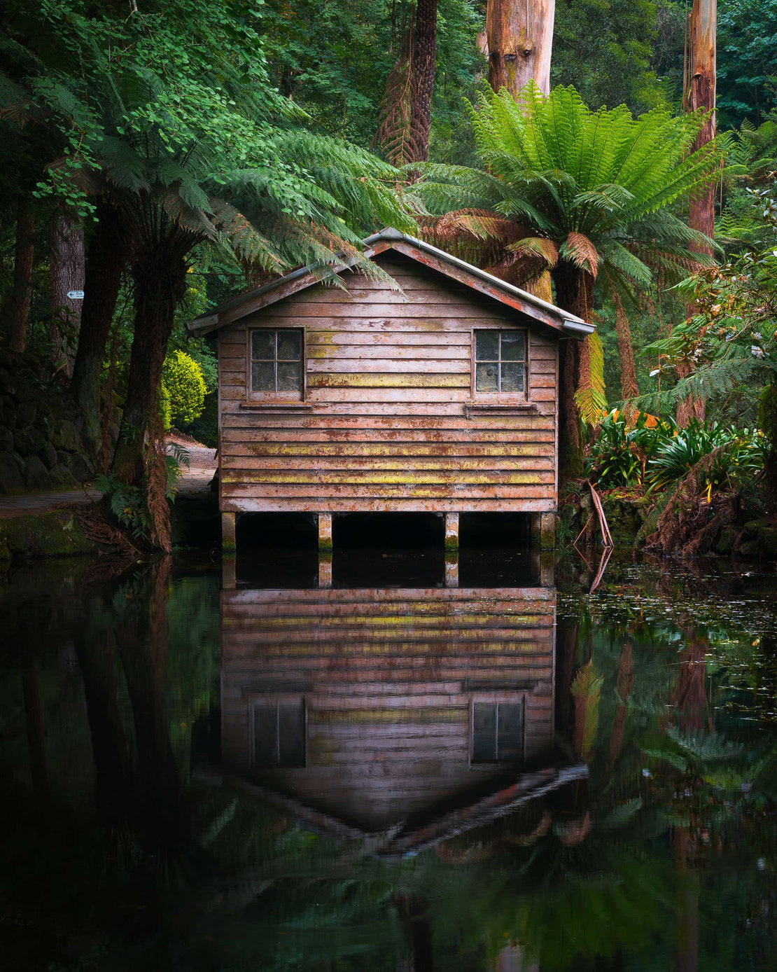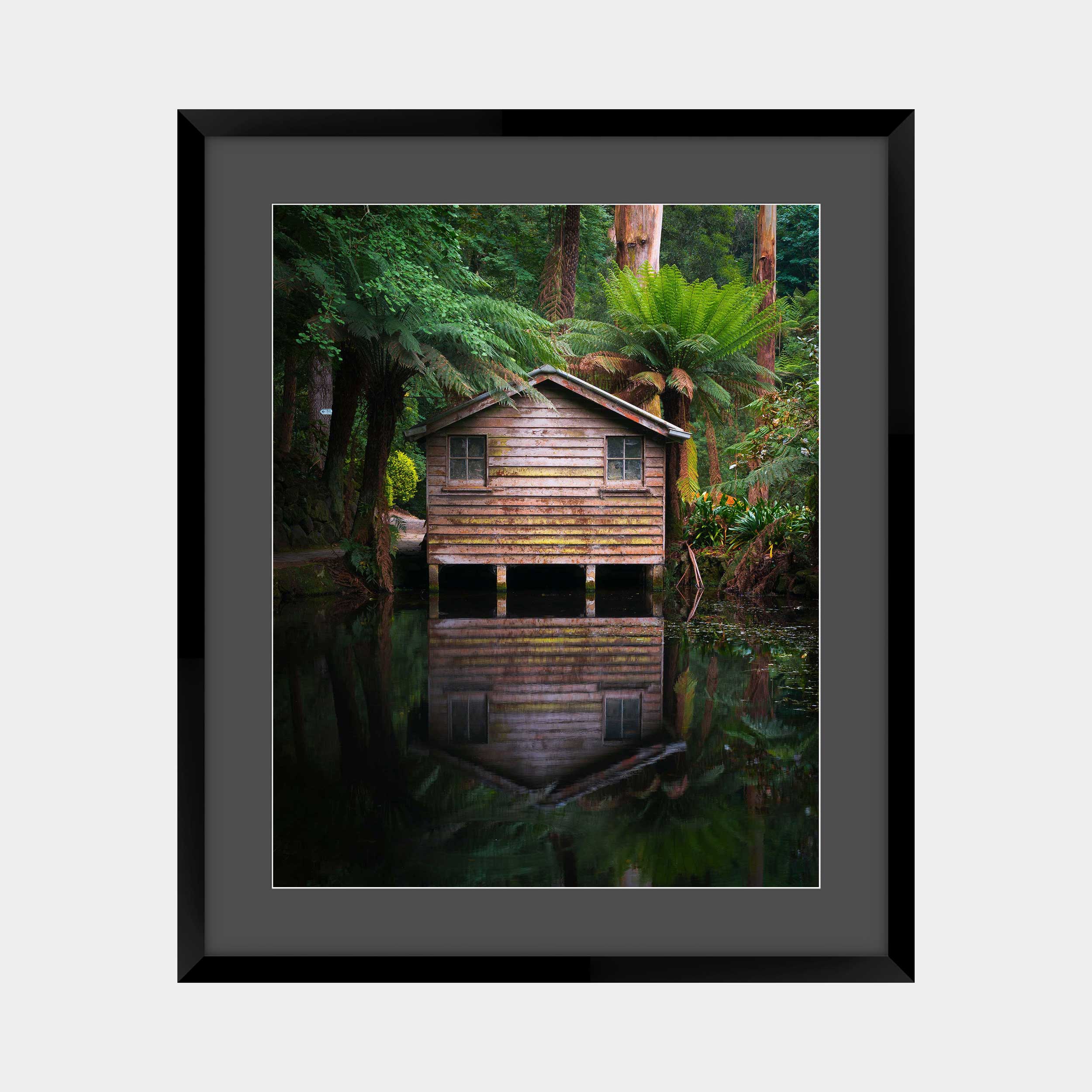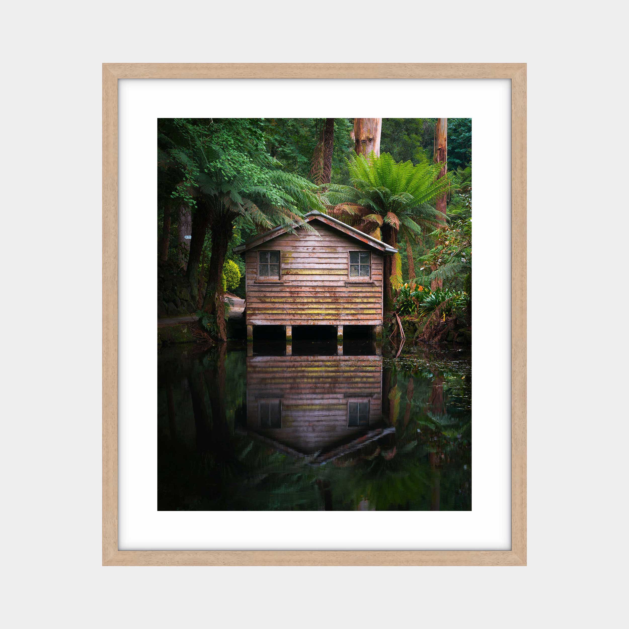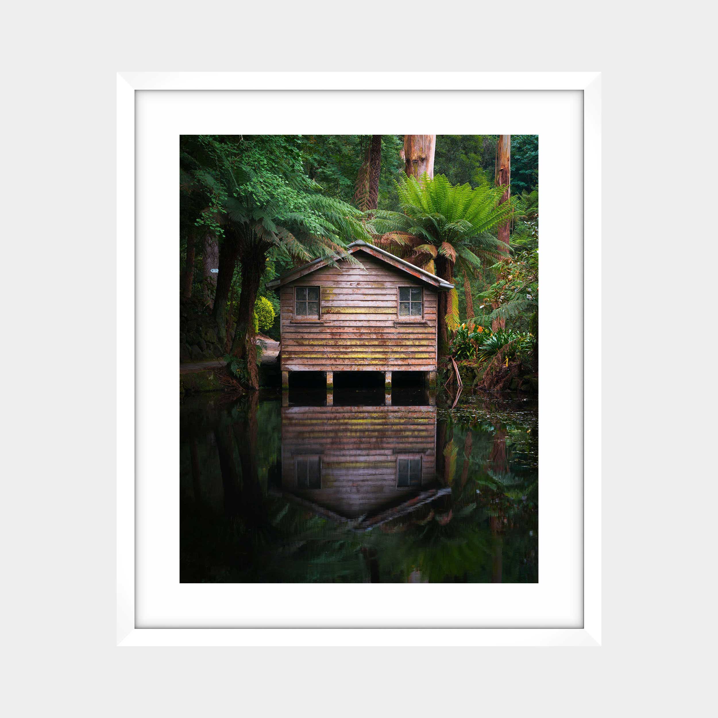 "Dandenongs' Enchanted Boathouse" captures the serene and timeless charm of the iconic boathouse within Victoria's Alfred Nicholas Memorial Gardens. Nestled amidst lush, emerald foliage and perfectly mirrored in the tranquil waters, this image invites you into a world of secluded beauty and peaceful reflection.