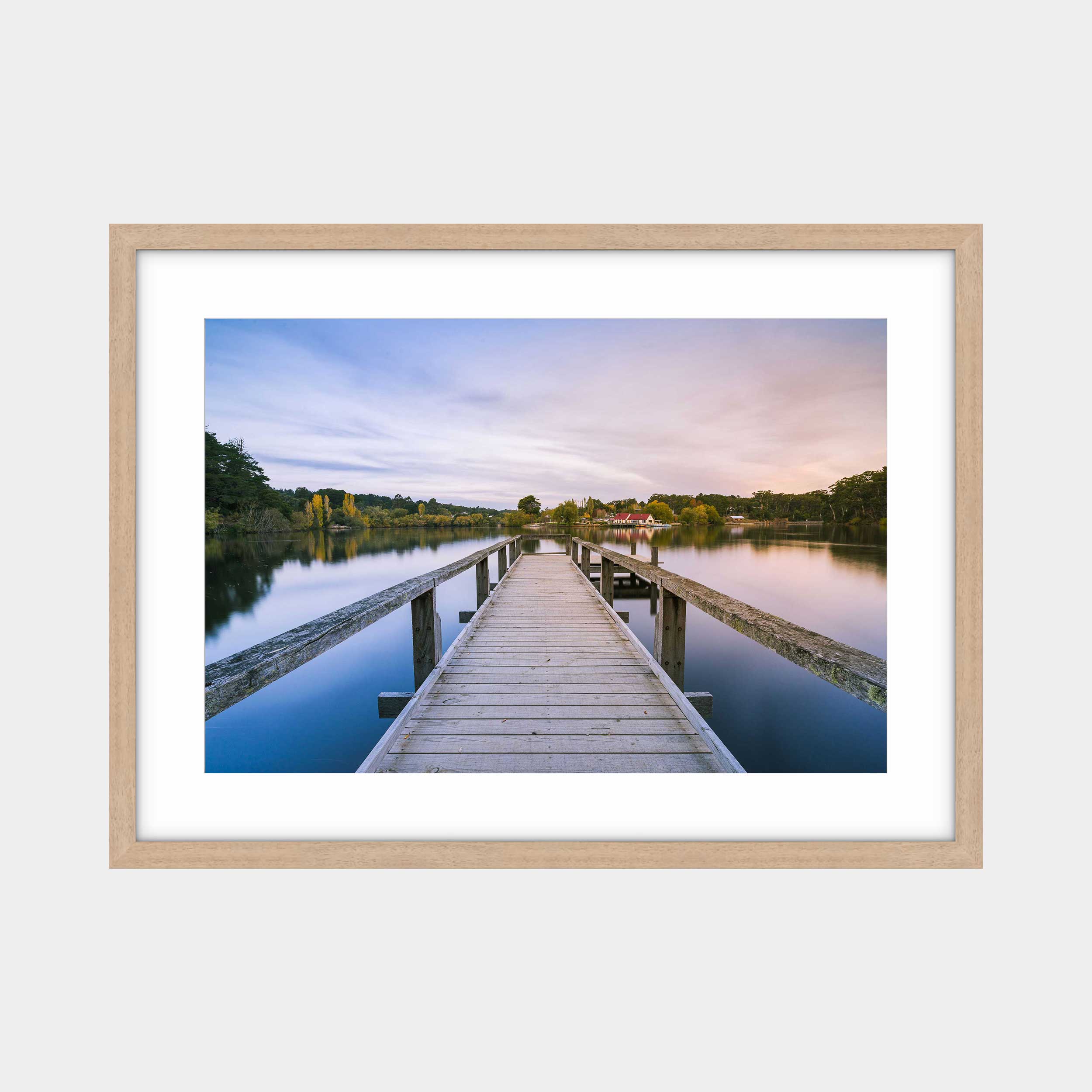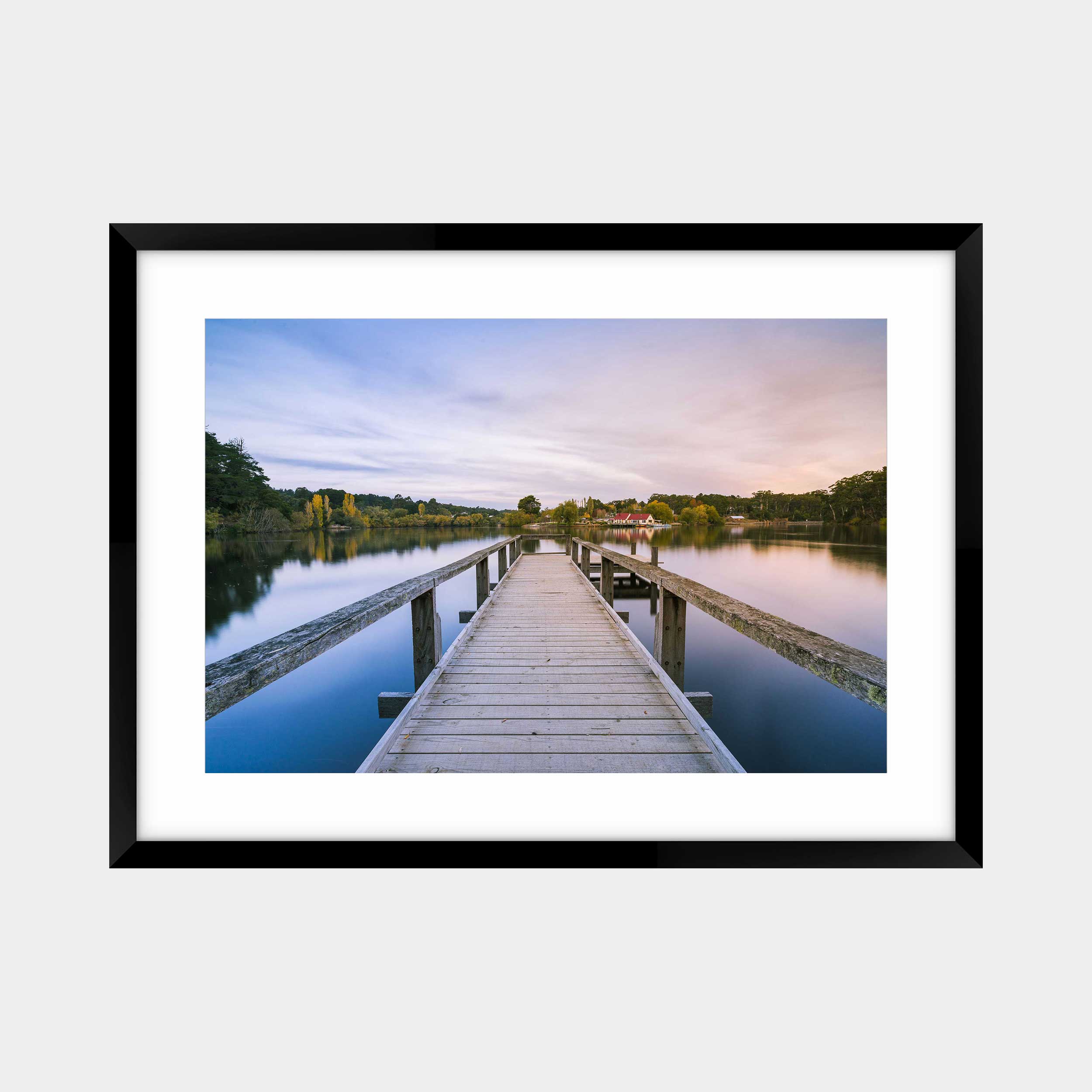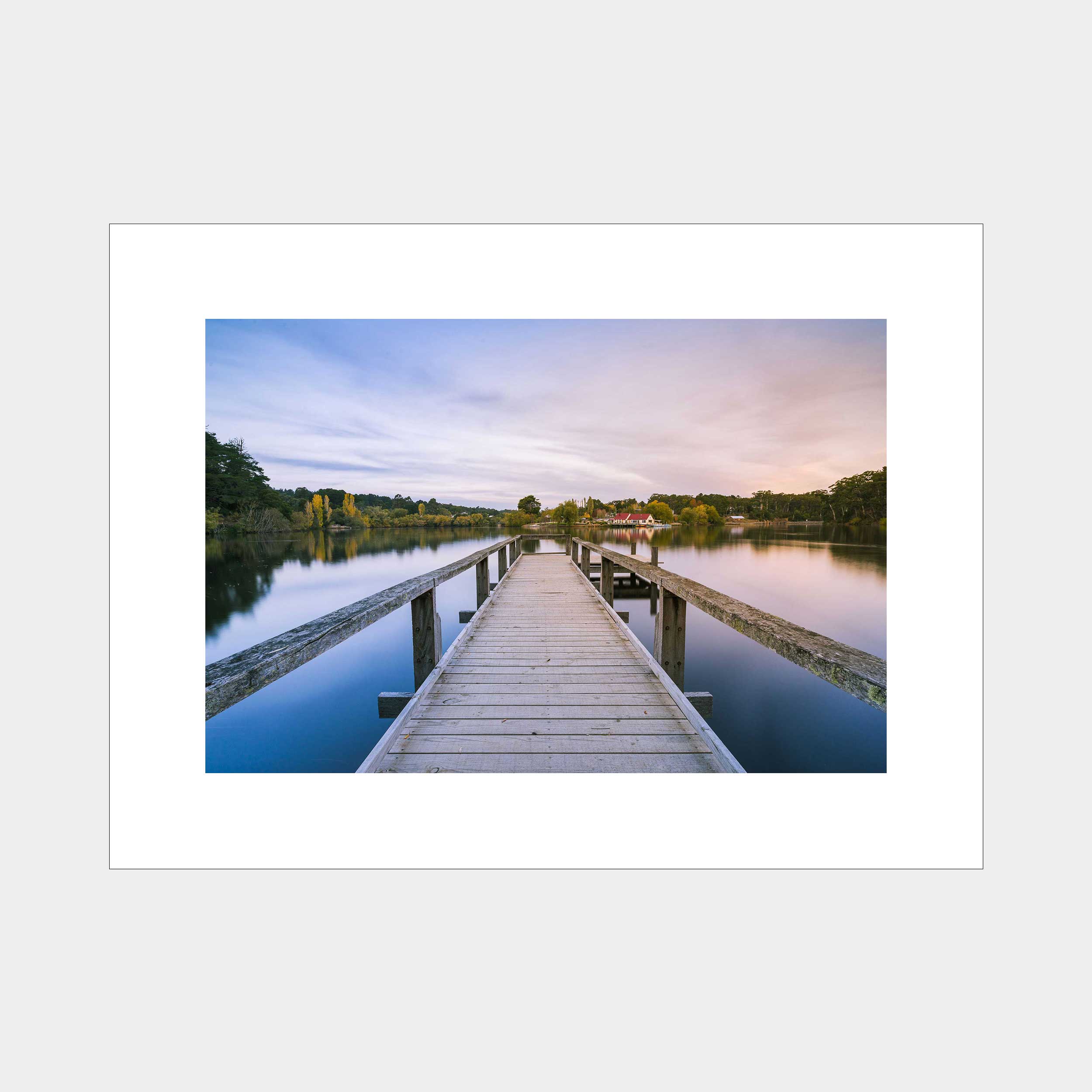 "Daylesford Dusk: Path to Serenity" captures the enchanting beauty of Lake Daylesford, Victoria, at sunset. The long, inviting pier stretches into the tranquil water, reflecting the soft, pastel hues of the twilight sky and leading the eye towards the charming boathouse. This image embodies peace, reflection, and the quiet allure of Victoria's spa country.