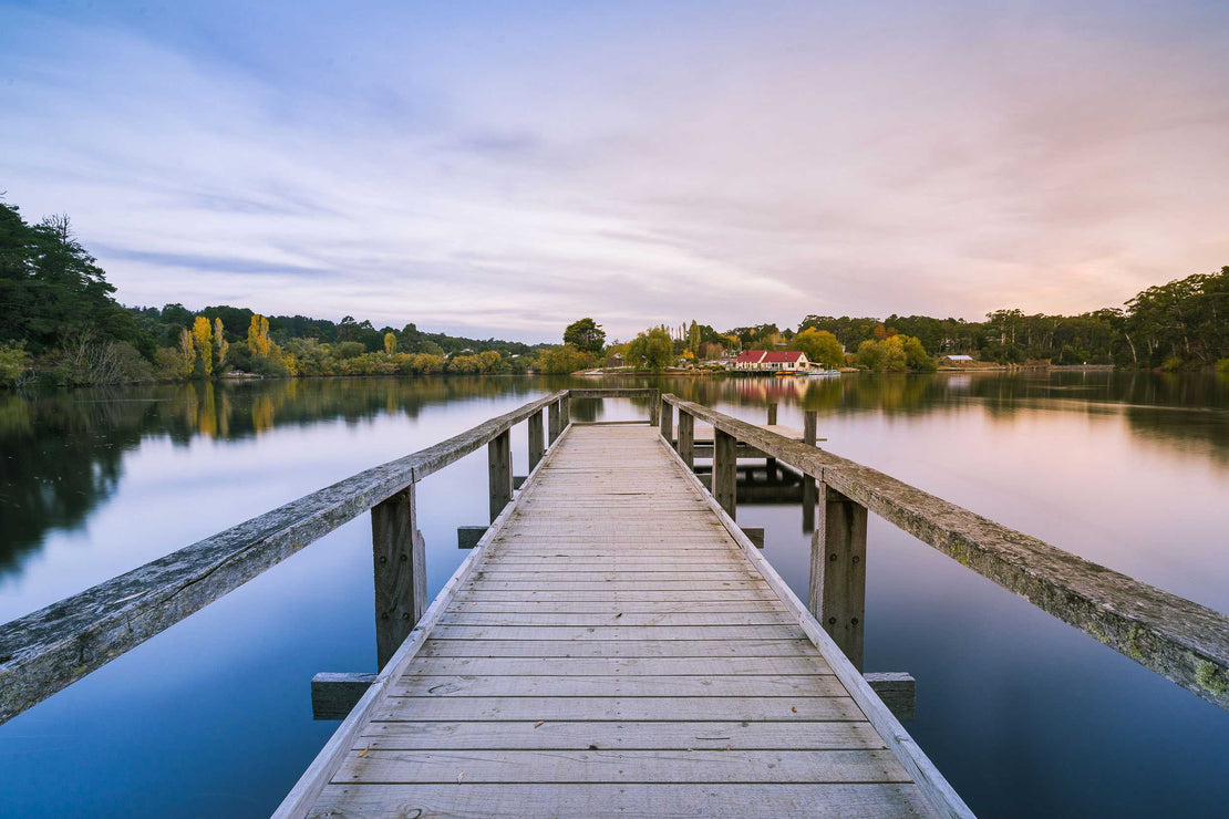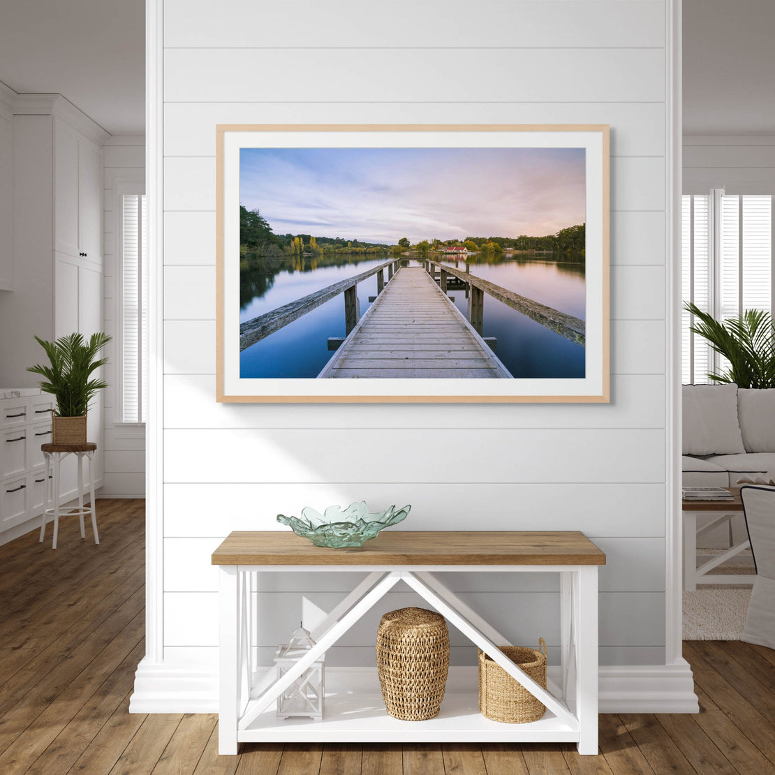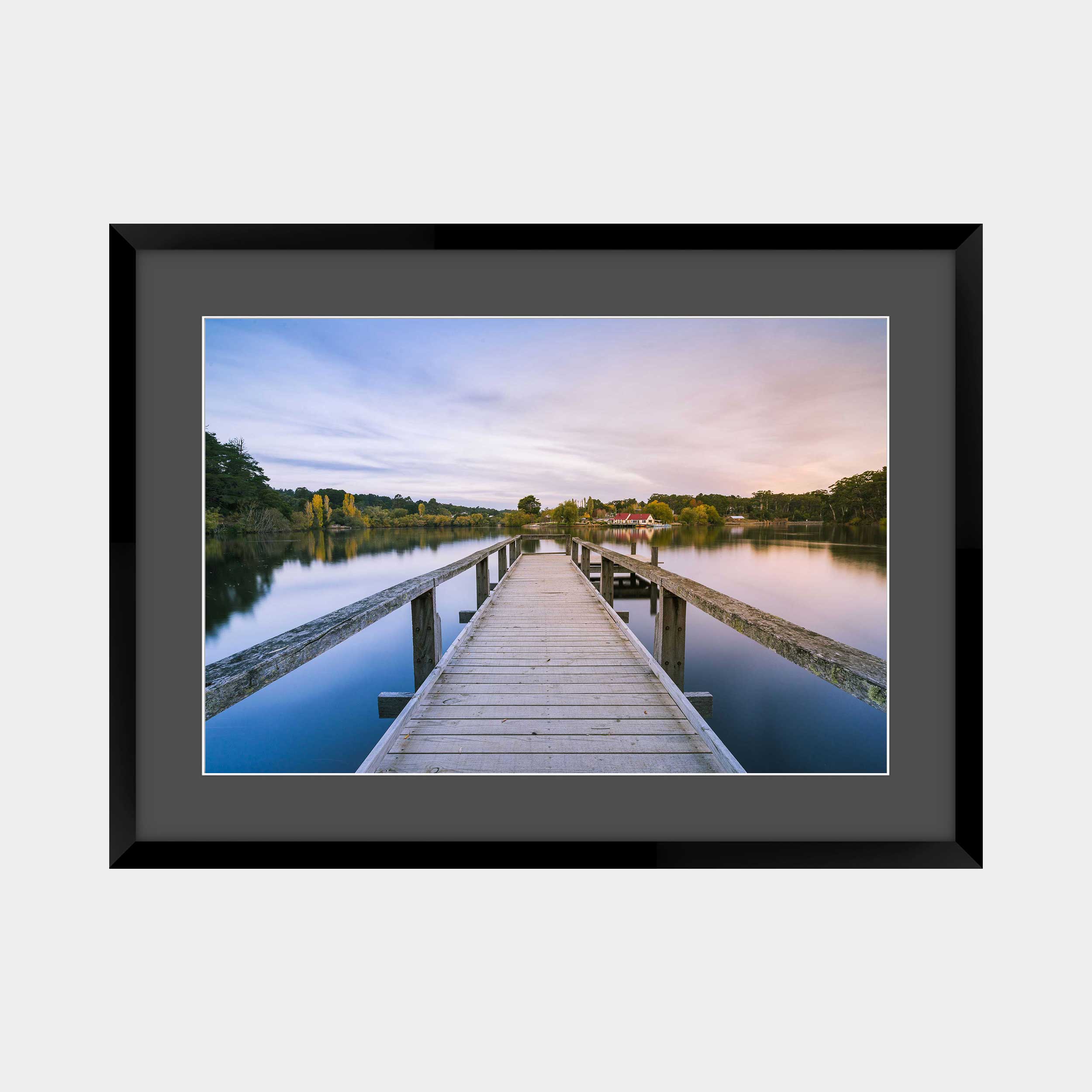 "Daylesford Dusk: Path to Serenity" captures the enchanting beauty of Lake Daylesford, Victoria, at sunset. The long, inviting pier stretches into the tranquil water, reflecting the soft, pastel hues of the twilight sky and leading the eye towards the charming boathouse. This image embodies peace, reflection, and the quiet allure of Victoria's spa country.