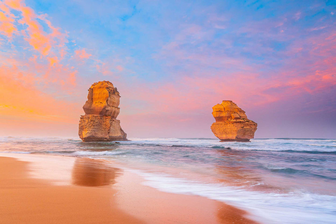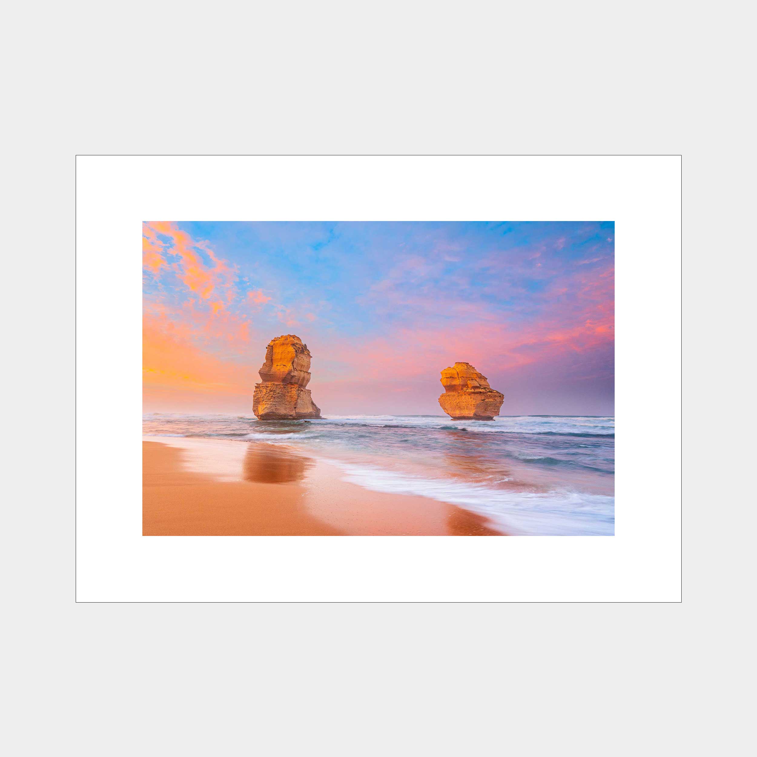 "Gibson Steps' Dawn Awakening" captures the breathtaking beauty of Victoria, Australia, from the base of Gibson Steps at sunrise. This photograph showcases the majestic limestone stacks of the Twelve Apostles from a unique beach perspective, bathed in the soft, ethereal light of dawn as waves gently caress the golden sands, inviting you into the heart of this iconic coastal landscape.
