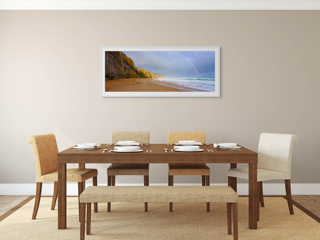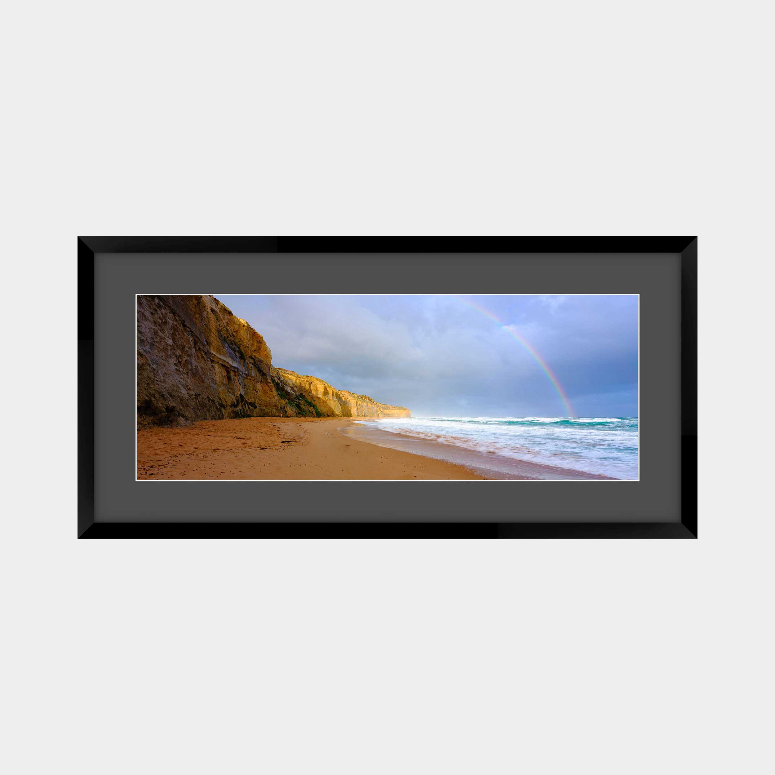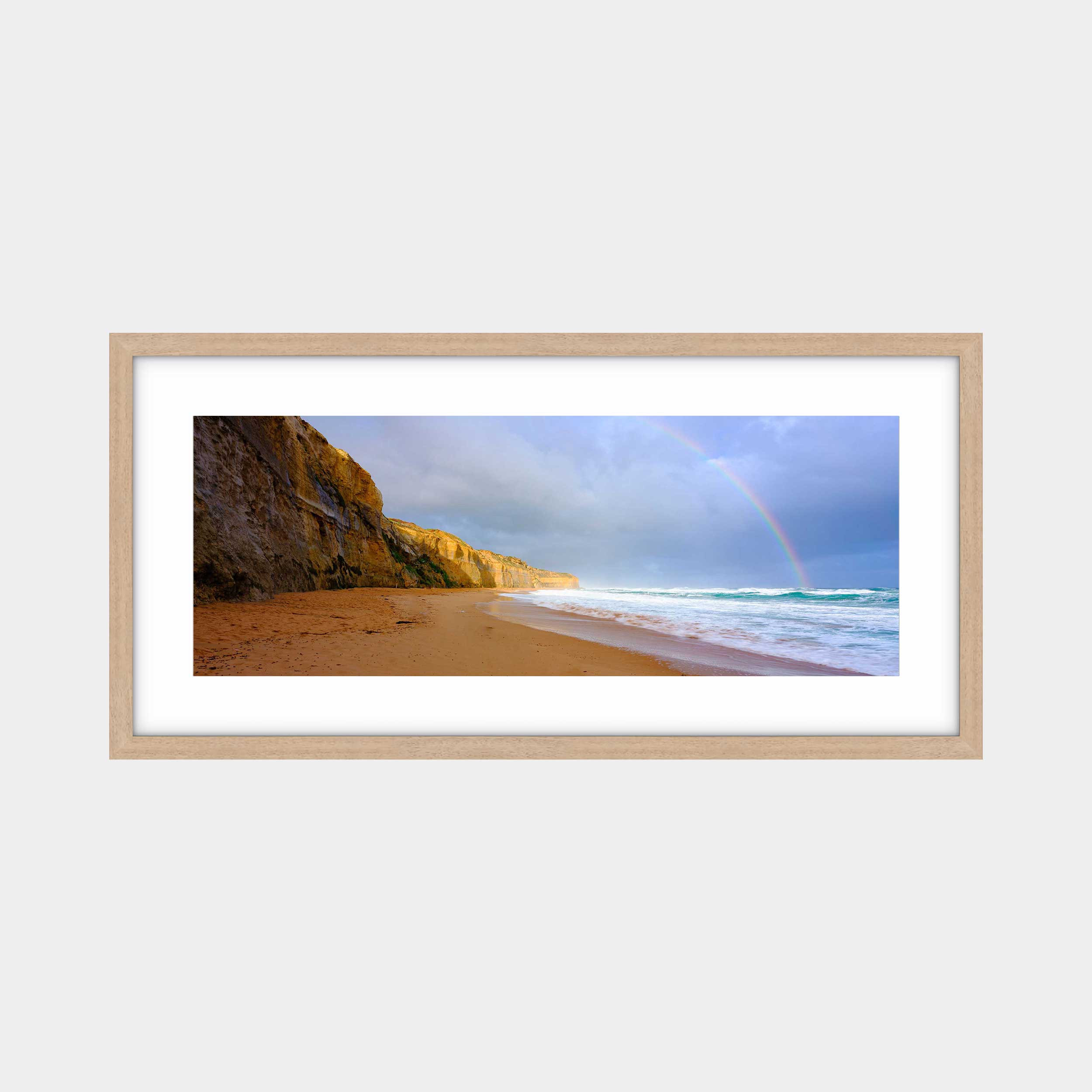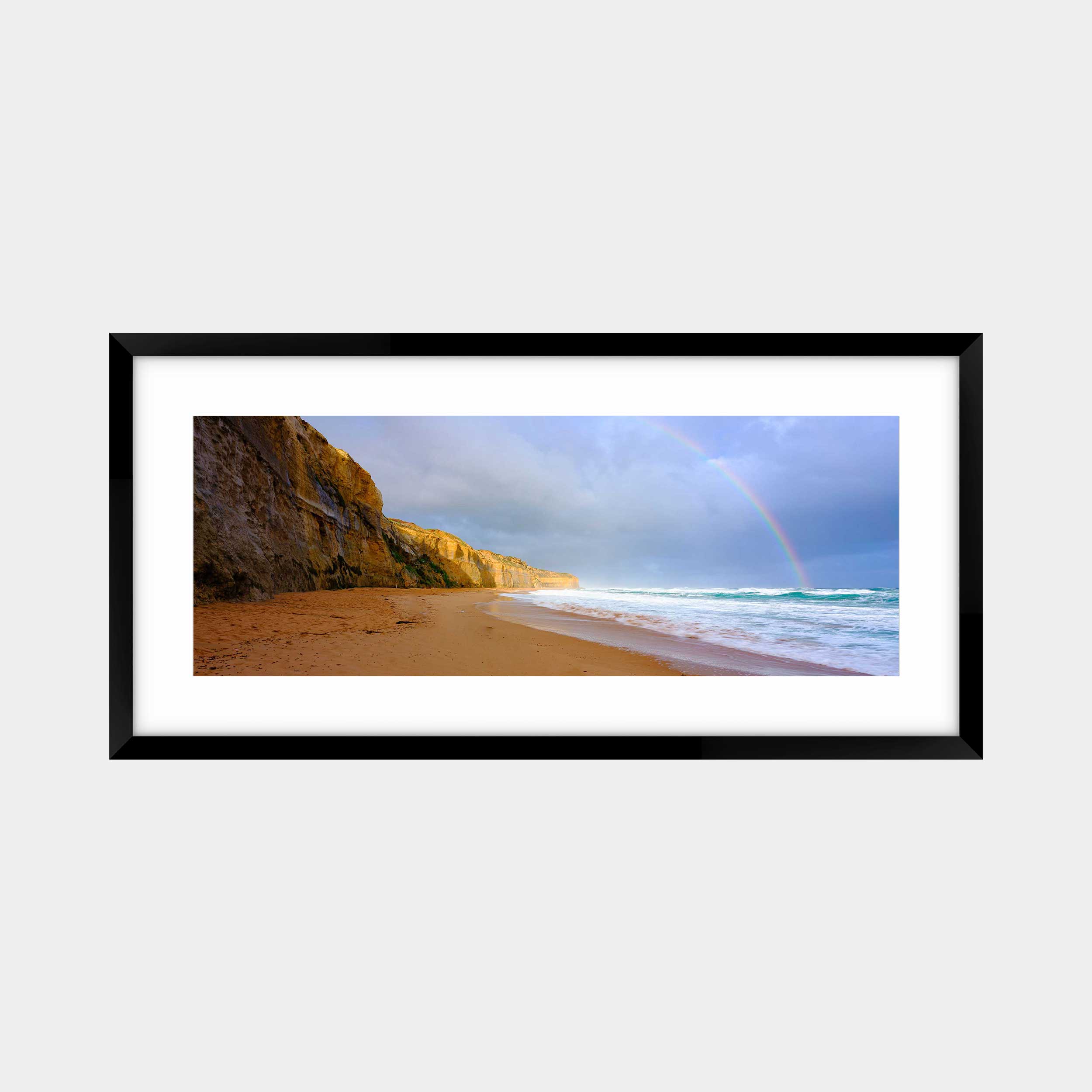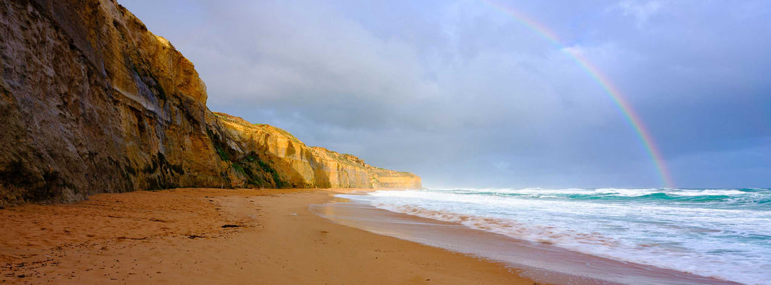"Gibson's Rainbow Coast" captures the dramatic cliffs and expansive beach of the Great Ocean Road near Gibson Steps, Victoria, crowned by a vibrant rainbow stretching across a dynamic sky. This panoramic photograph blends the warm hues of the sandstone cliffs with the frothy turquoise of the ocean waves, creating a breathtaking and hopeful scene that celebrates the iconic beauty of this rugged coastline after a storm.