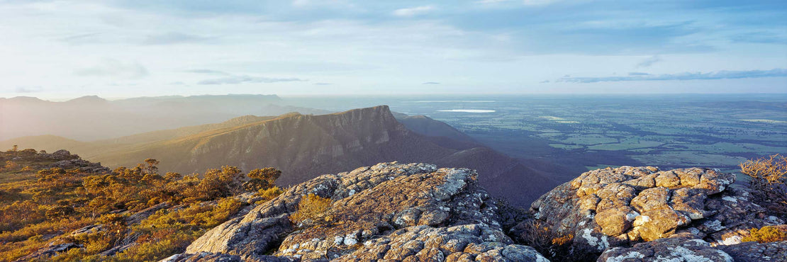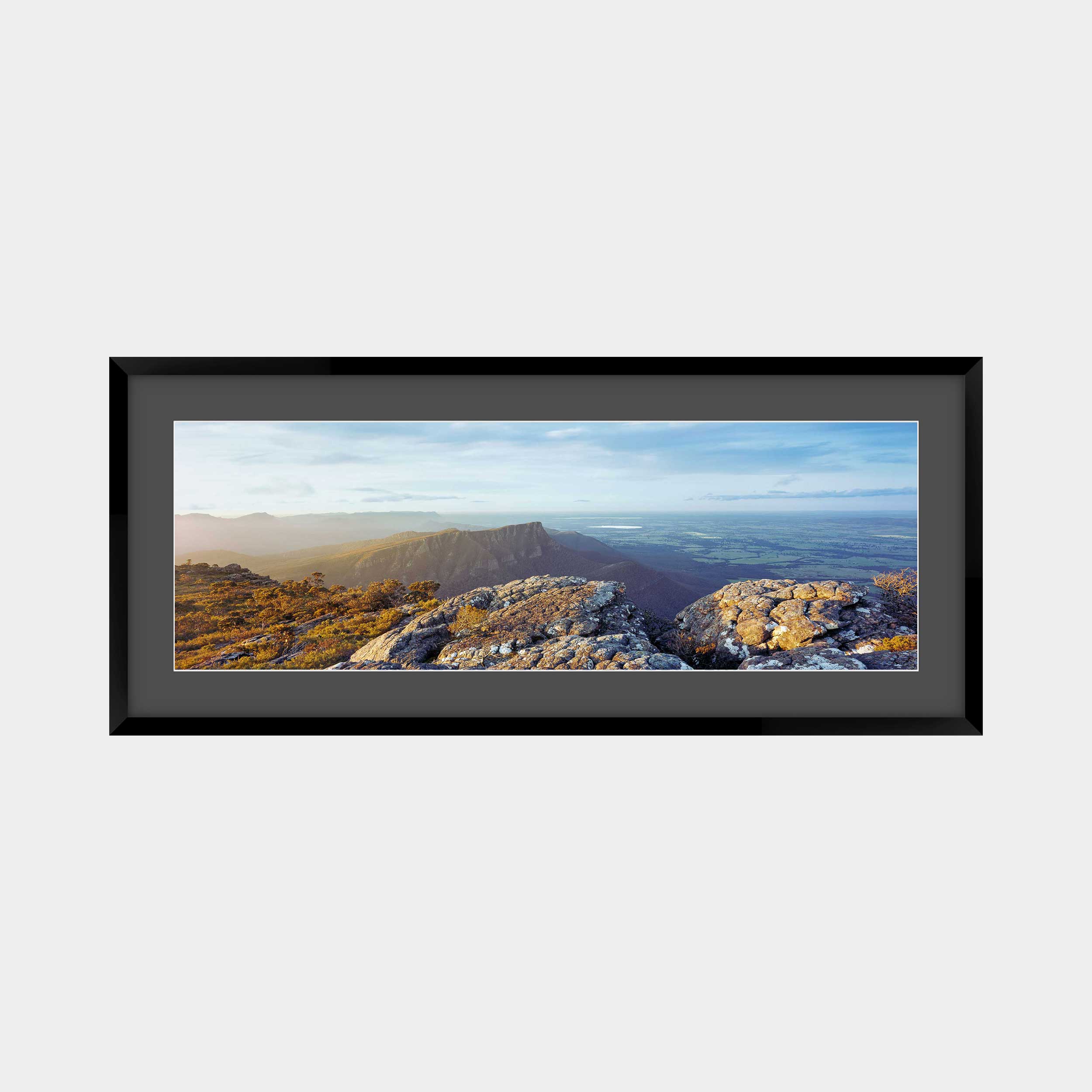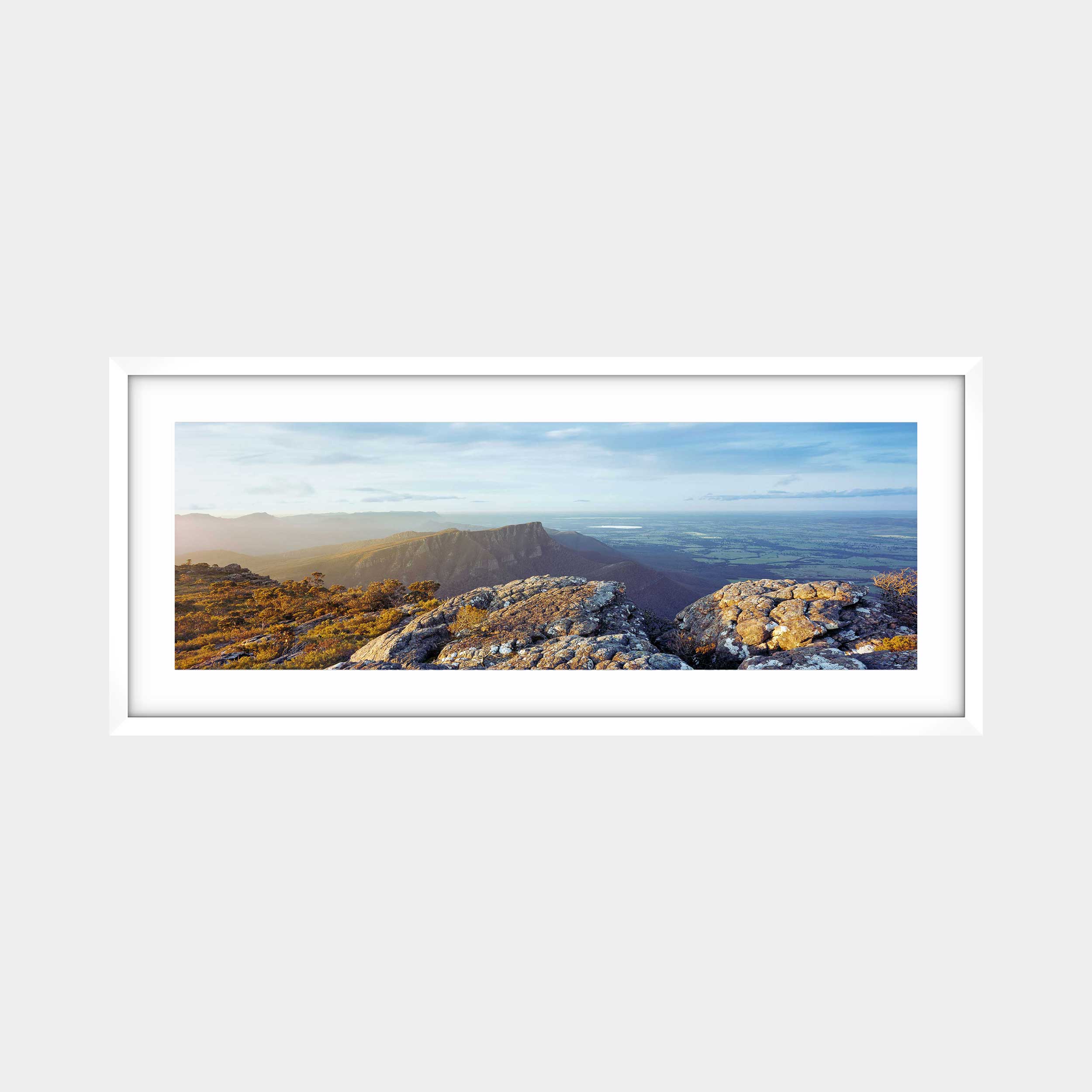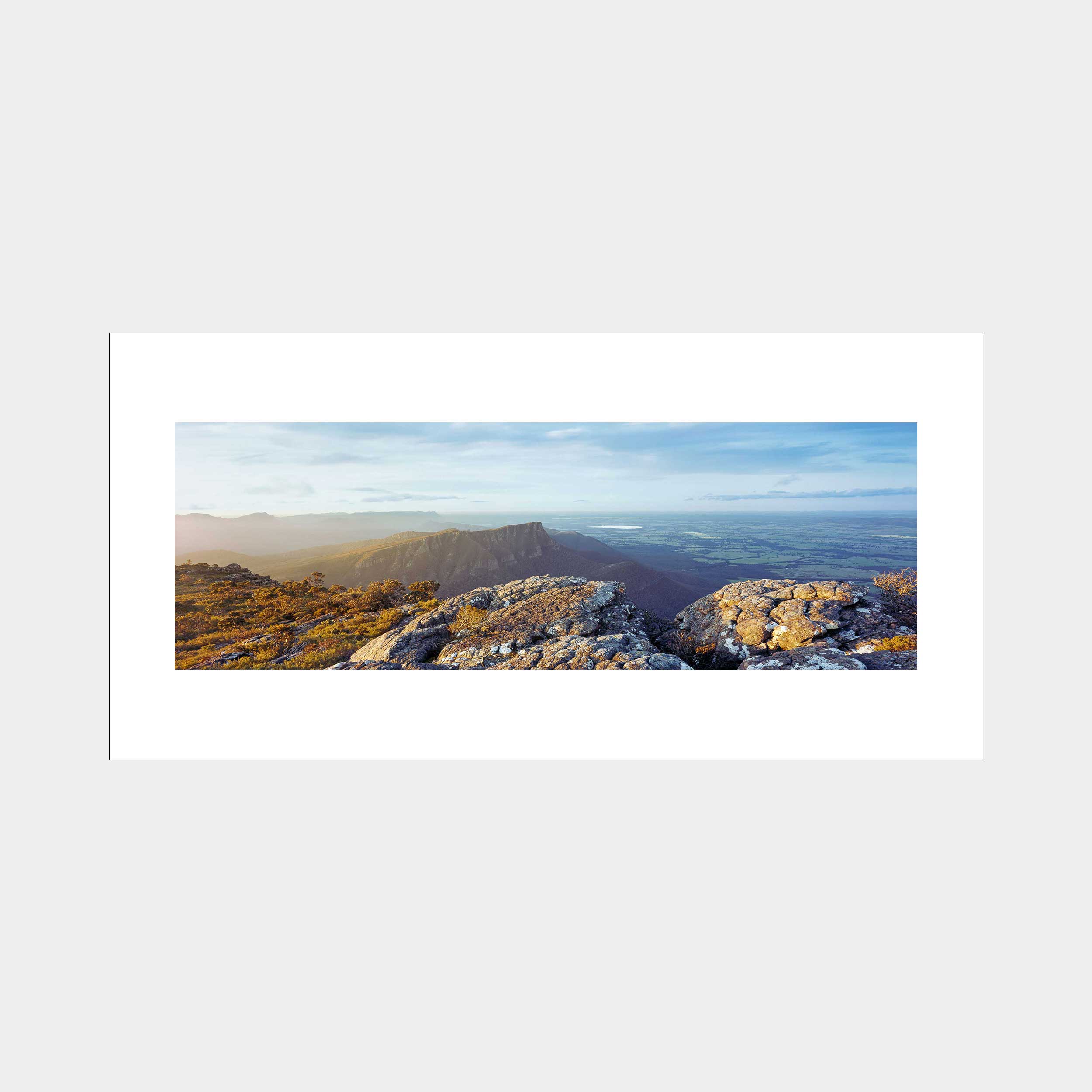 "Grampians Grandeur" presents a magnificent panoramic view from Mt. William, the highest peak in Victoria's Grampians National Park, bathed in the sublime light of sunset. Captured on a 617 panoramic film camera with Fuji Velvia film, this artwork showcases the rugged mountain ranges and vast plains below, illuminated by a sky painted in soft, ethereal hues, embodying the immense scale and ancient beauty of this iconic Australian landscape.