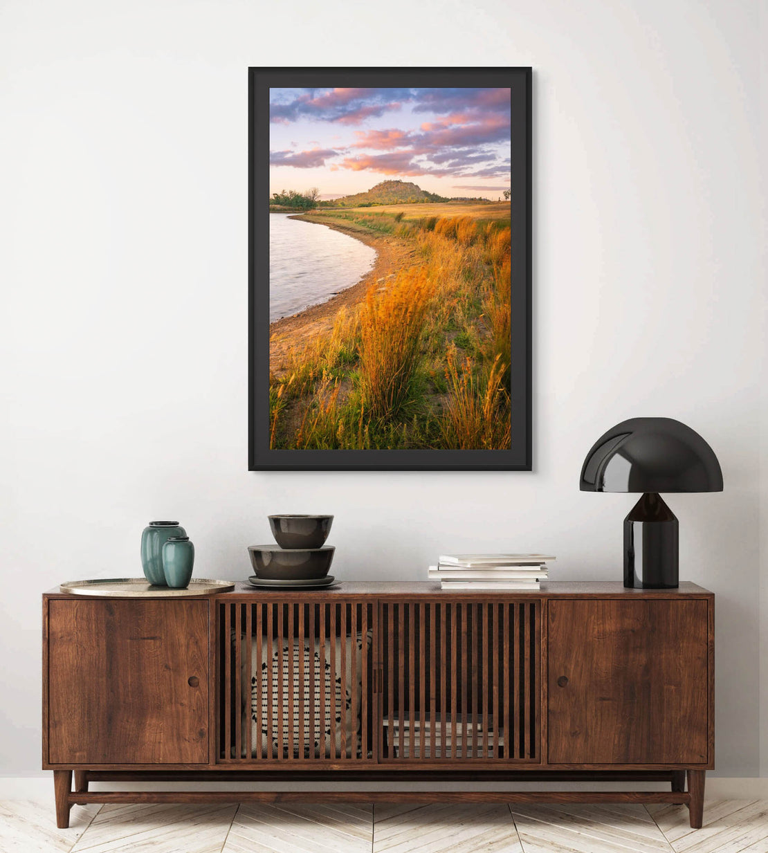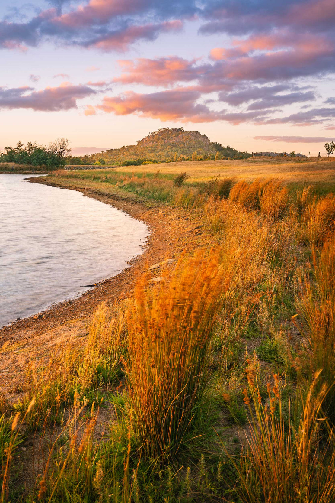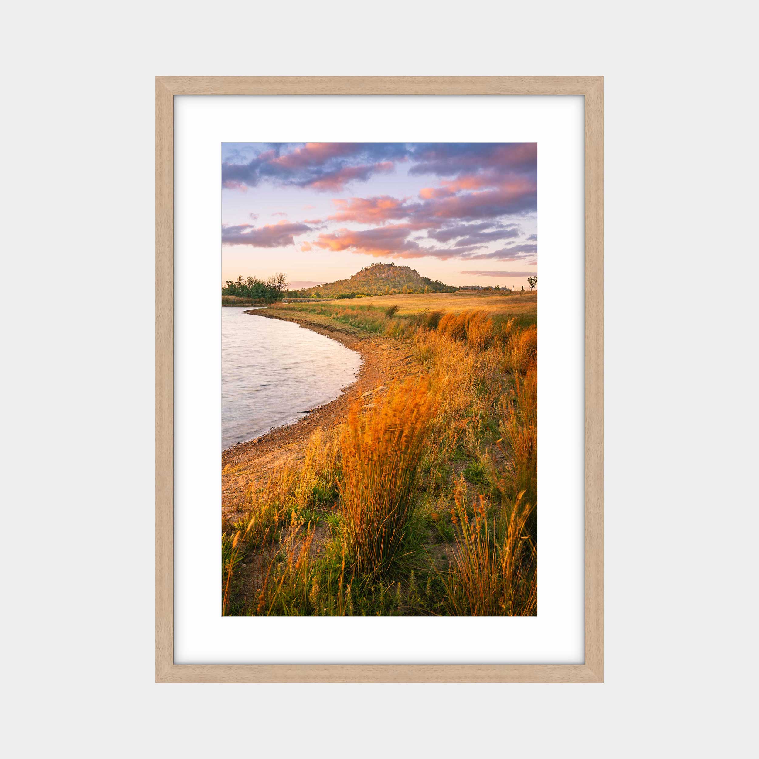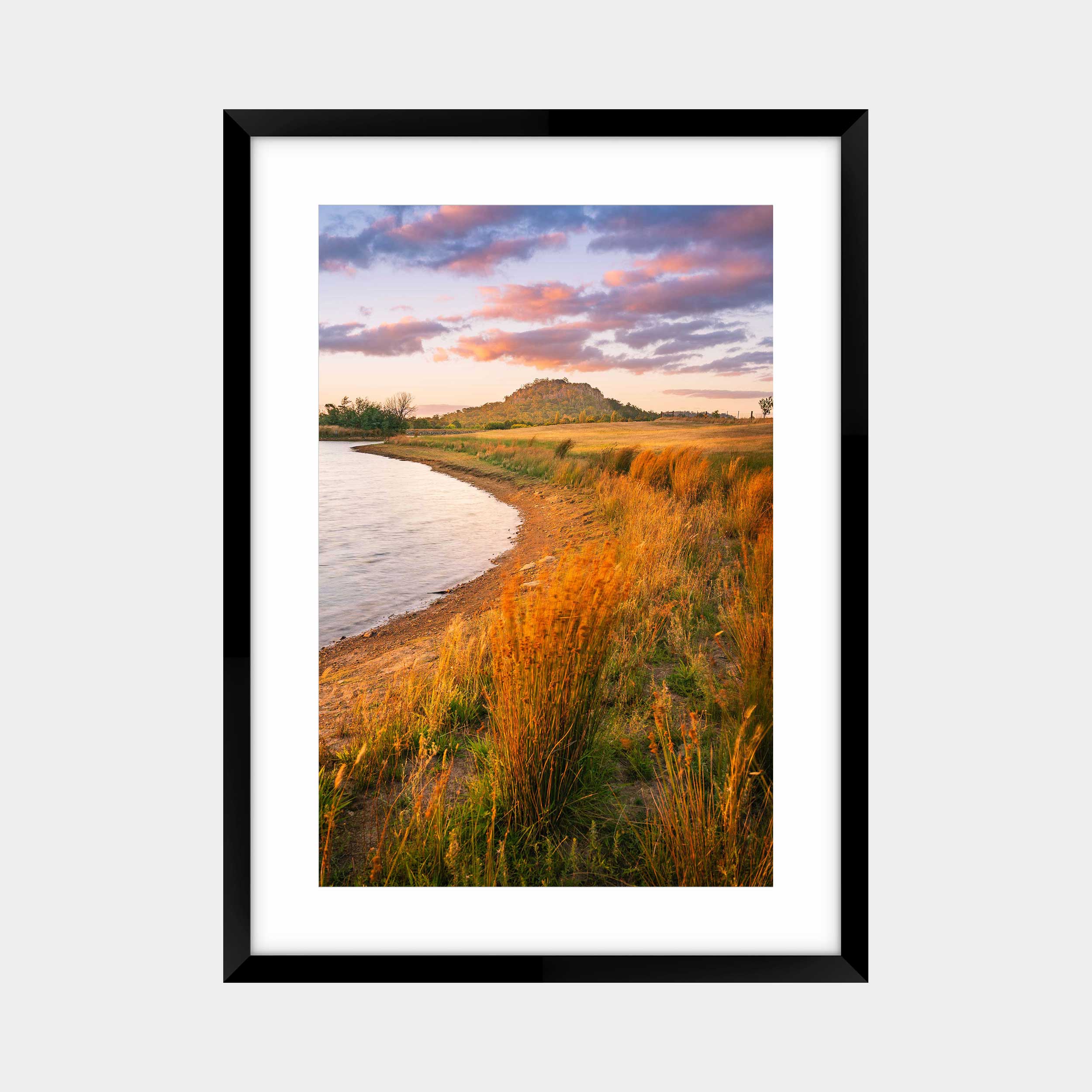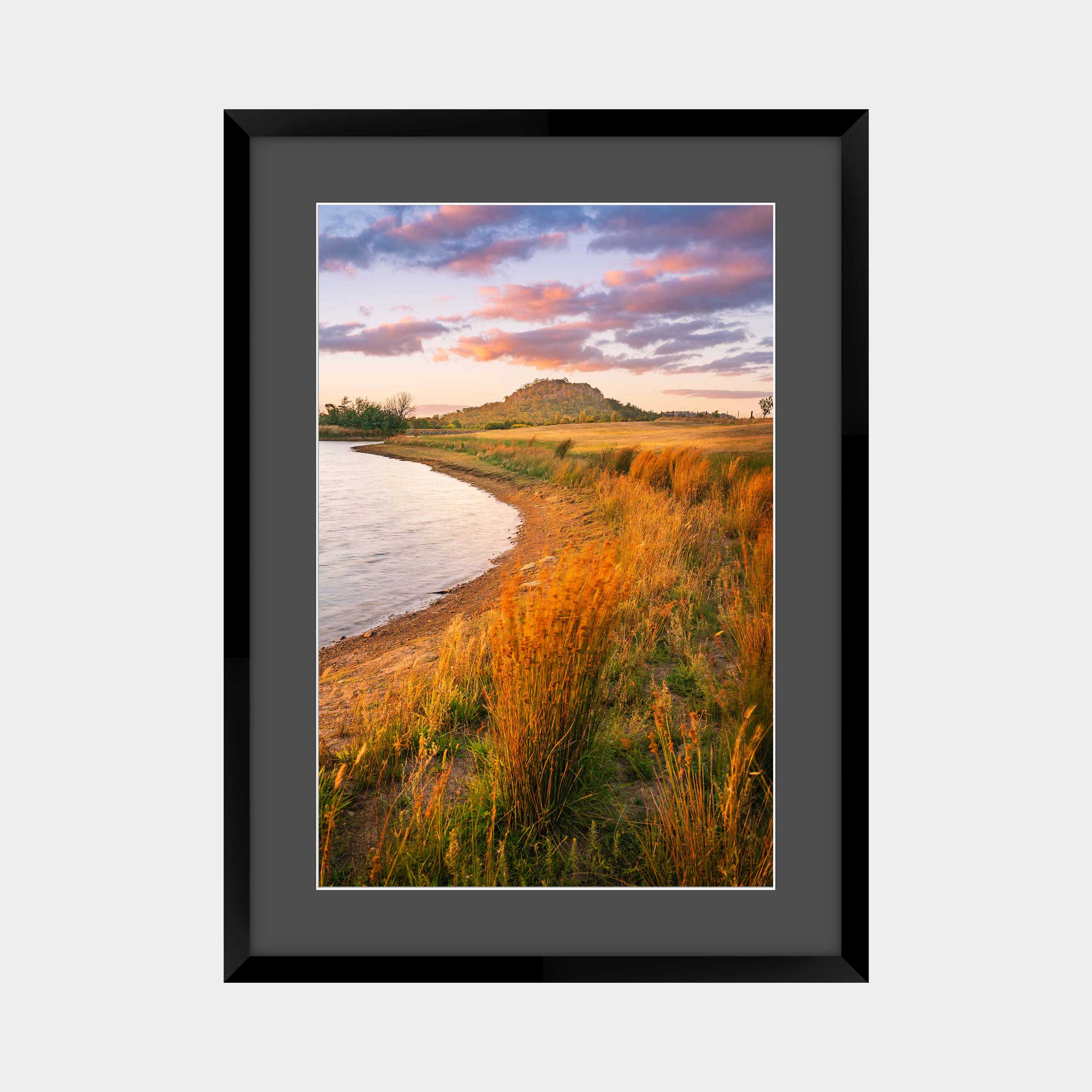 "Hanging Rock's Secret Glow" captures an exclusive perspective of Victoria's iconic Hanging Rock at sunset. From a rarely seen viewpoint, the ancient volcanic peak stands silhouetted against a sky painted with soft, ethereal twilight hues, while golden grasses frame the tranquil water, revealing a hidden serenity of this mysterious landmark.