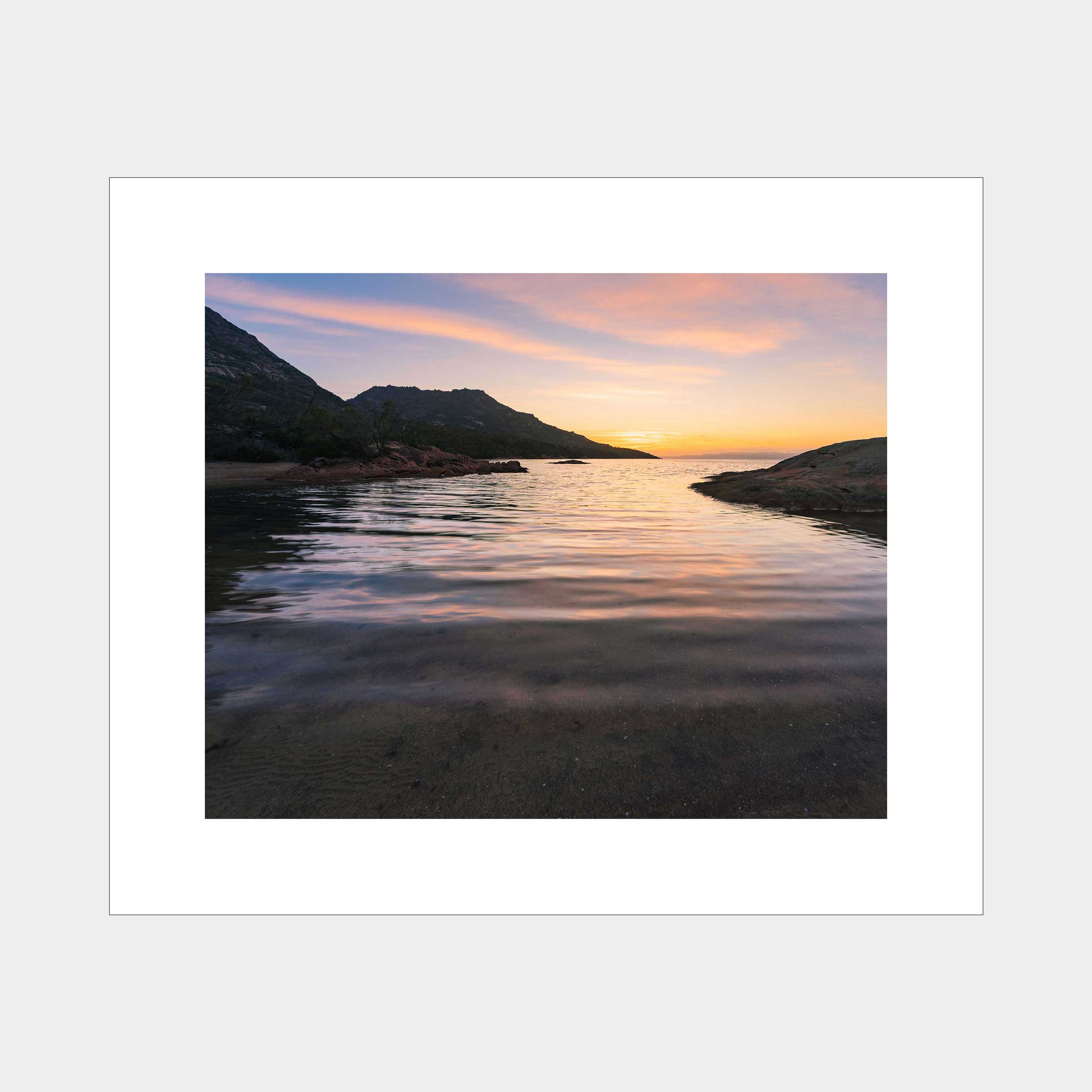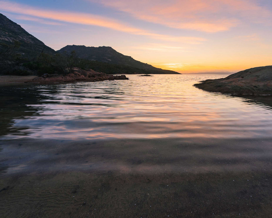 "Honeymoon Glow: Tasmanian Sunset" captures the captivating beauty of Honeymoon Bay, Tasmania, as dusk paints the sky and water in a palette of warm, inviting hues. The tranquil bay reflects the soft light, offering a serene glimpse into one of Tasmania's most picturesque coastal gems.