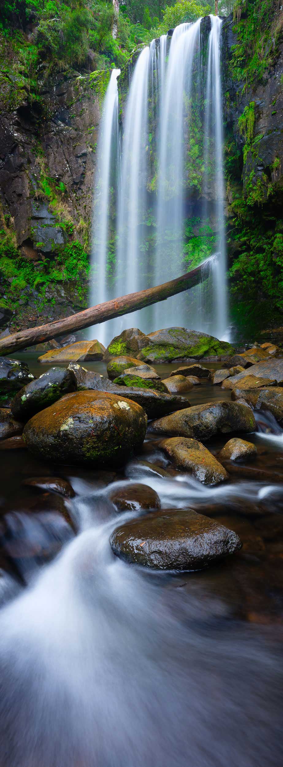 "Hopetoun's Emerald Plunge" captures the magnificent Hopetoun Falls in Victoria's ancient Otways Forest, showcasing the raw power and serene beauty of its cascading waters. This captivating vertical photograph highlights the silky flow of the waterfall against a backdrop of vibrant green moss and lush rainforest foliage, with rugged rocks and flowing streams in the foreground, immersing you in the heart of this pristine Australian wilderness.