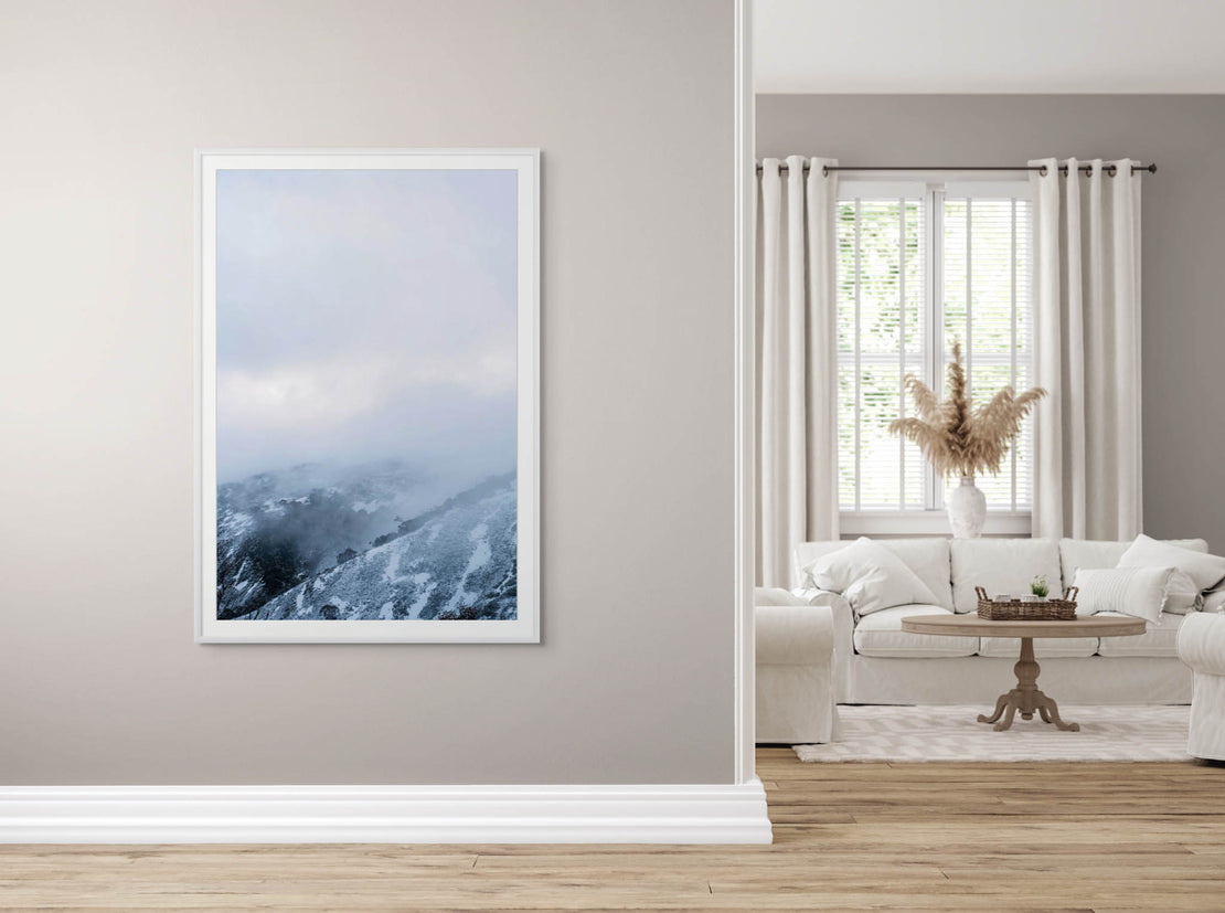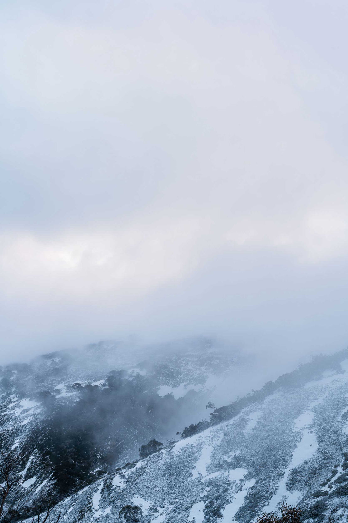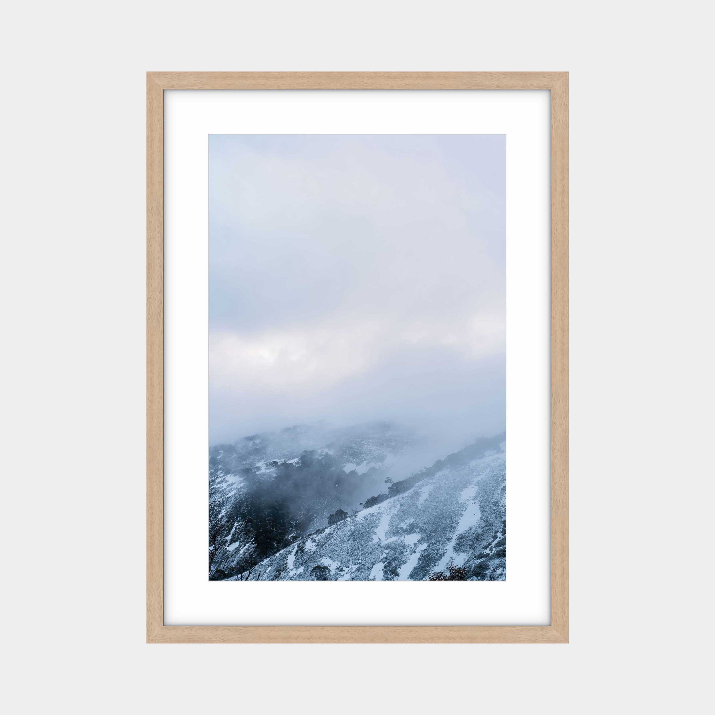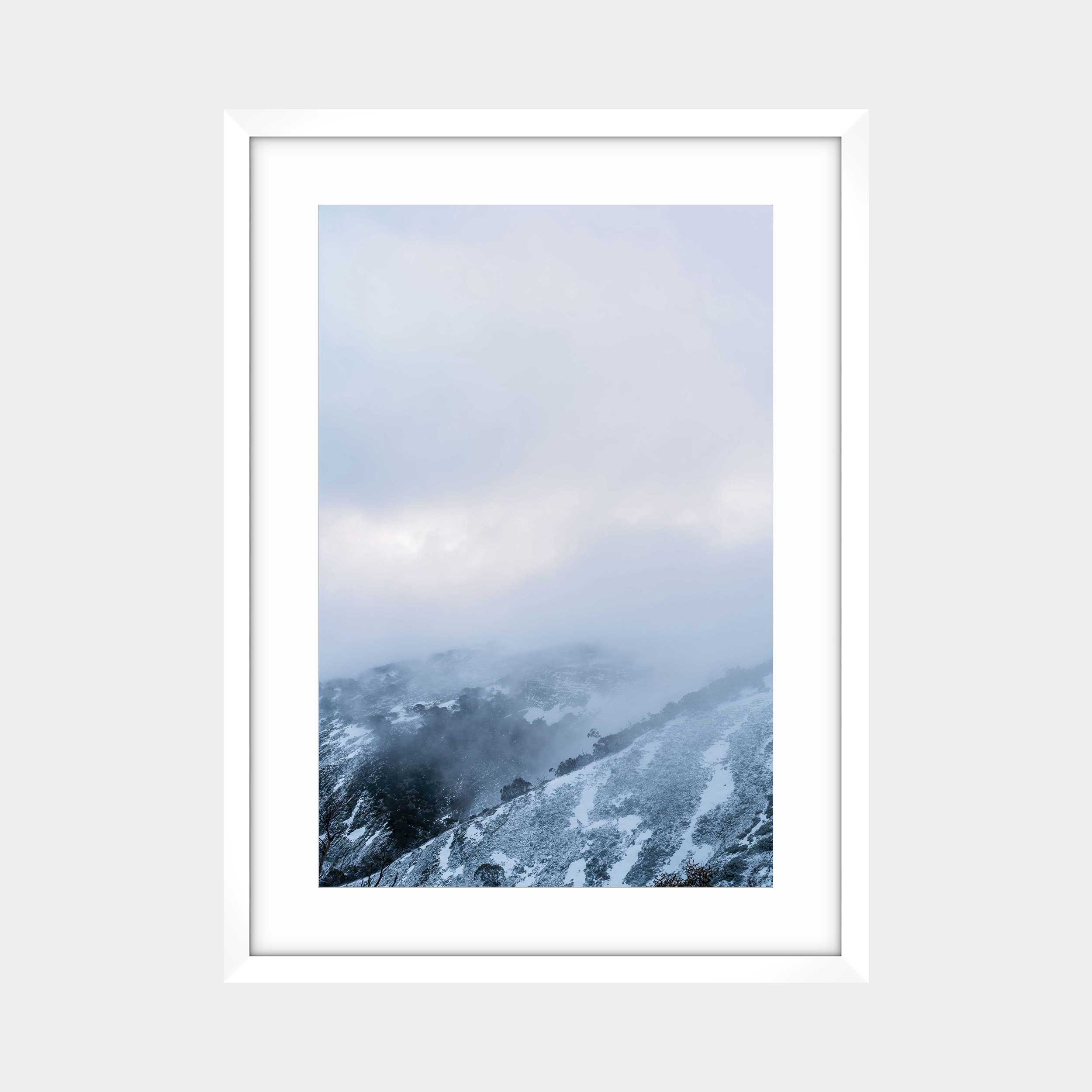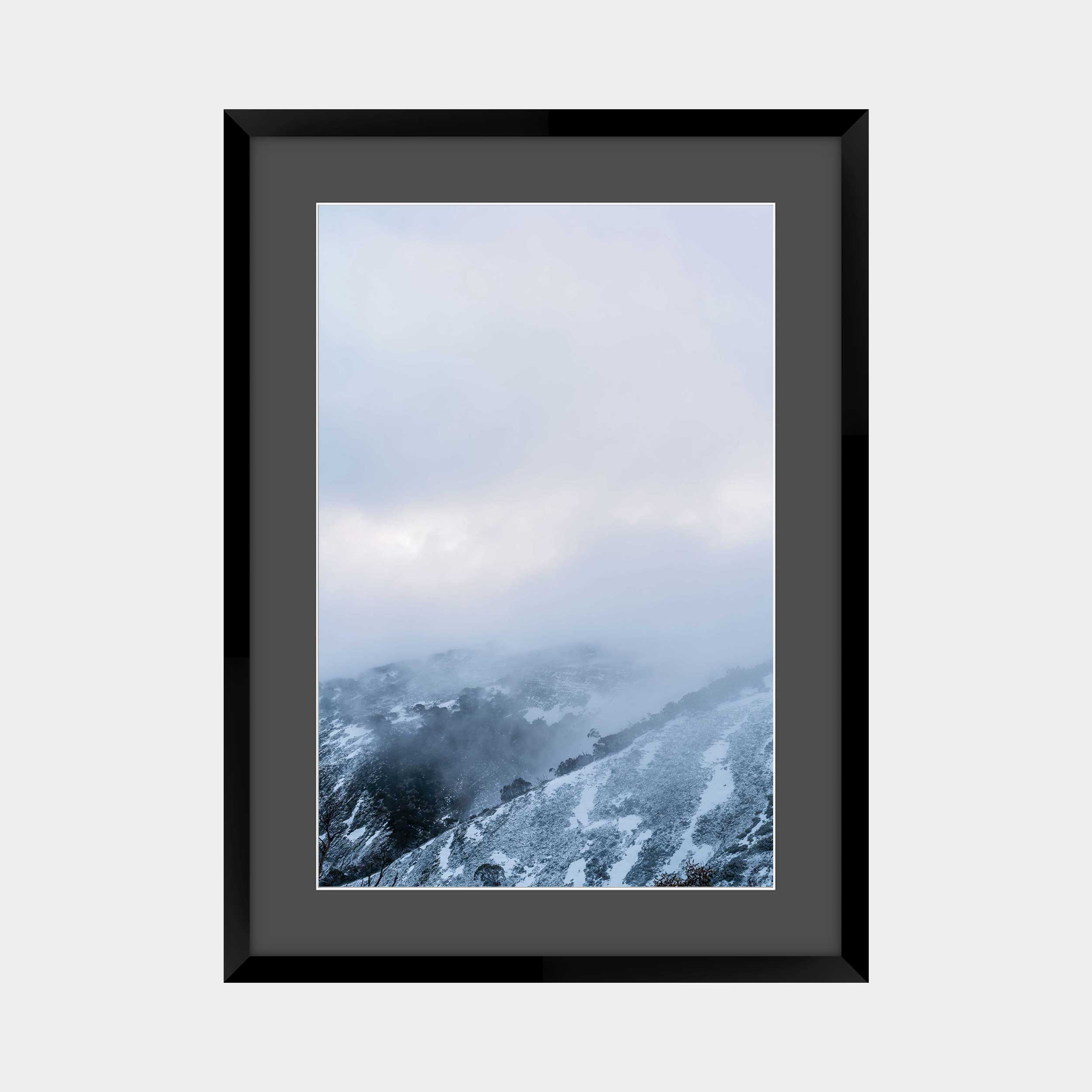 "Hotham's Misty Embrace" captures the ethereal and dramatic atmosphere of Mount Hotham in Victoria, Australia, on a day when the high peaks are shrouded in swirling mist and fresh snow. This photograph showcases the rugged mountain slopes disappearing into soft clouds, evoking a sense of raw, untamed beauty and the profound tranquility of an alpine landscape veiled in mystery.