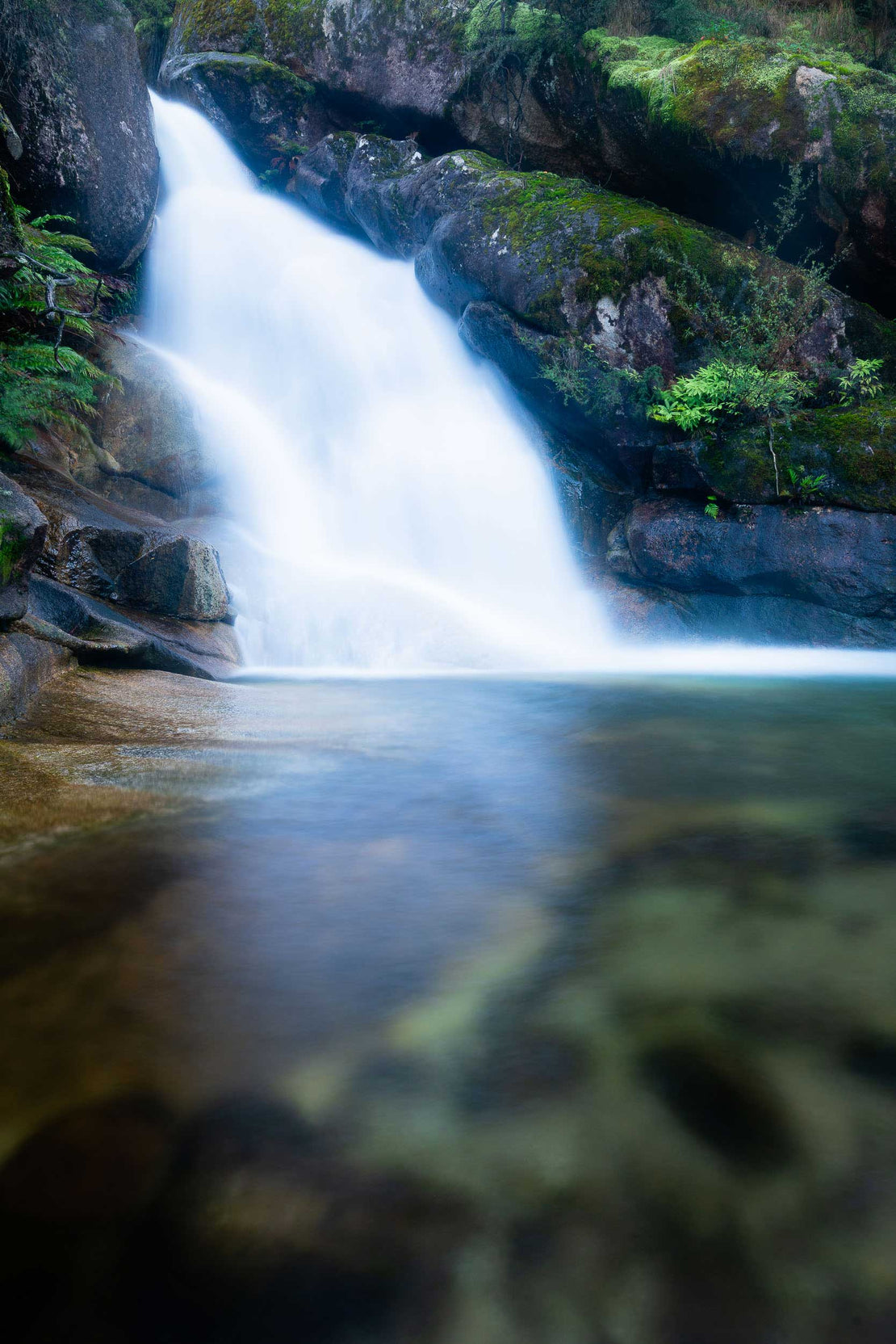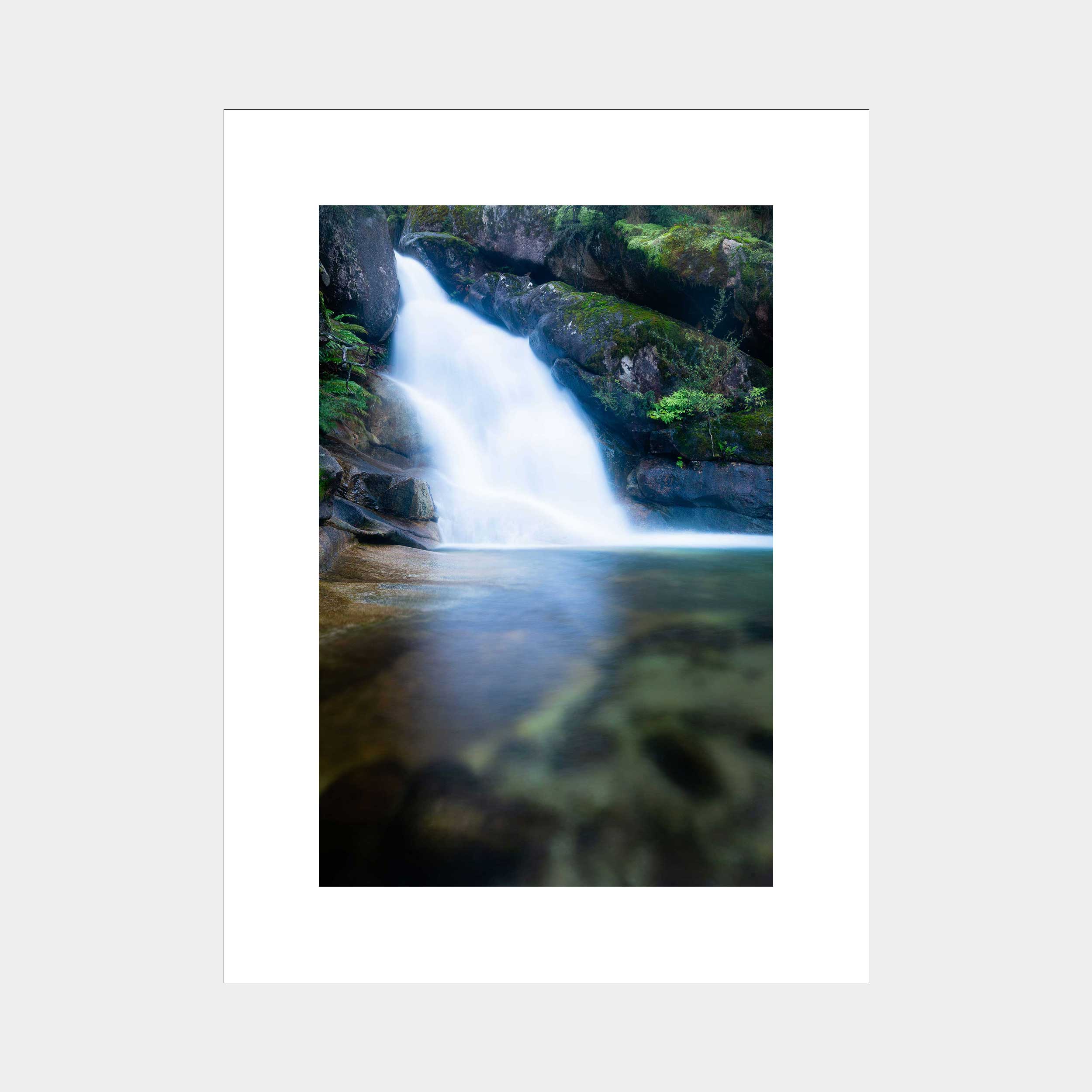"Lady Bath's Emerald Veil" captures the pristine beauty of Lady Bath Falls within Victoria's majestic Mount Buffalo National Park. This photograph showcases the delicate cascade of water amidst a vibrant tapestry of lush green ferns and moss-covered boulders, inviting viewers into the heart of a tranquil, ancient rainforest ecosystem.