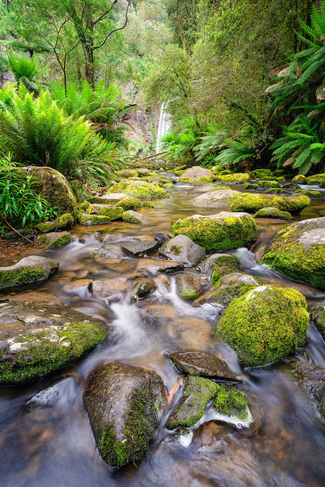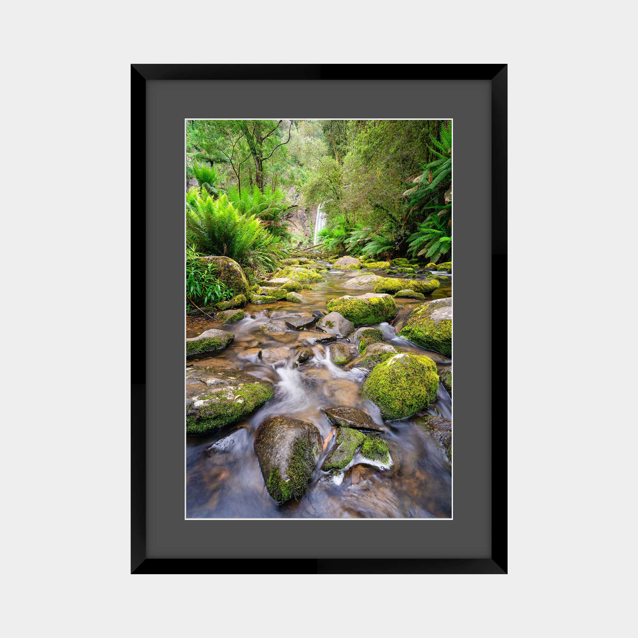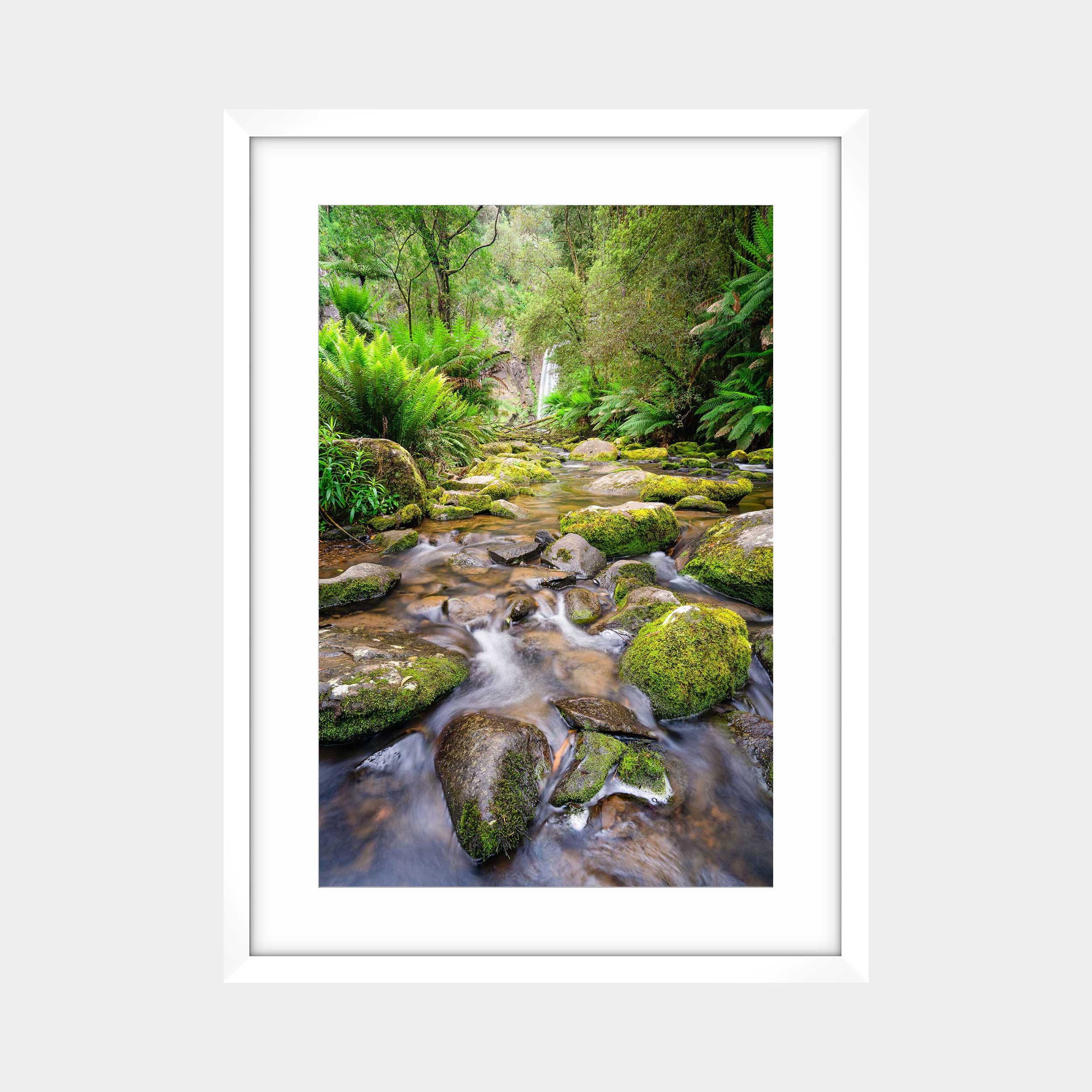 "Otway's Mossy Path: Flow to Serenity" invites you into the enchanting depths of Victoria's Otway Ranges, leading the eye along a gentle stream adorned with moss-covered rocks towards the distant, veiled beauty of Hopetoun Falls. This photograph captures the immersive tranquility and verdant richness of an ancient rainforest, a journey of natural wonder.