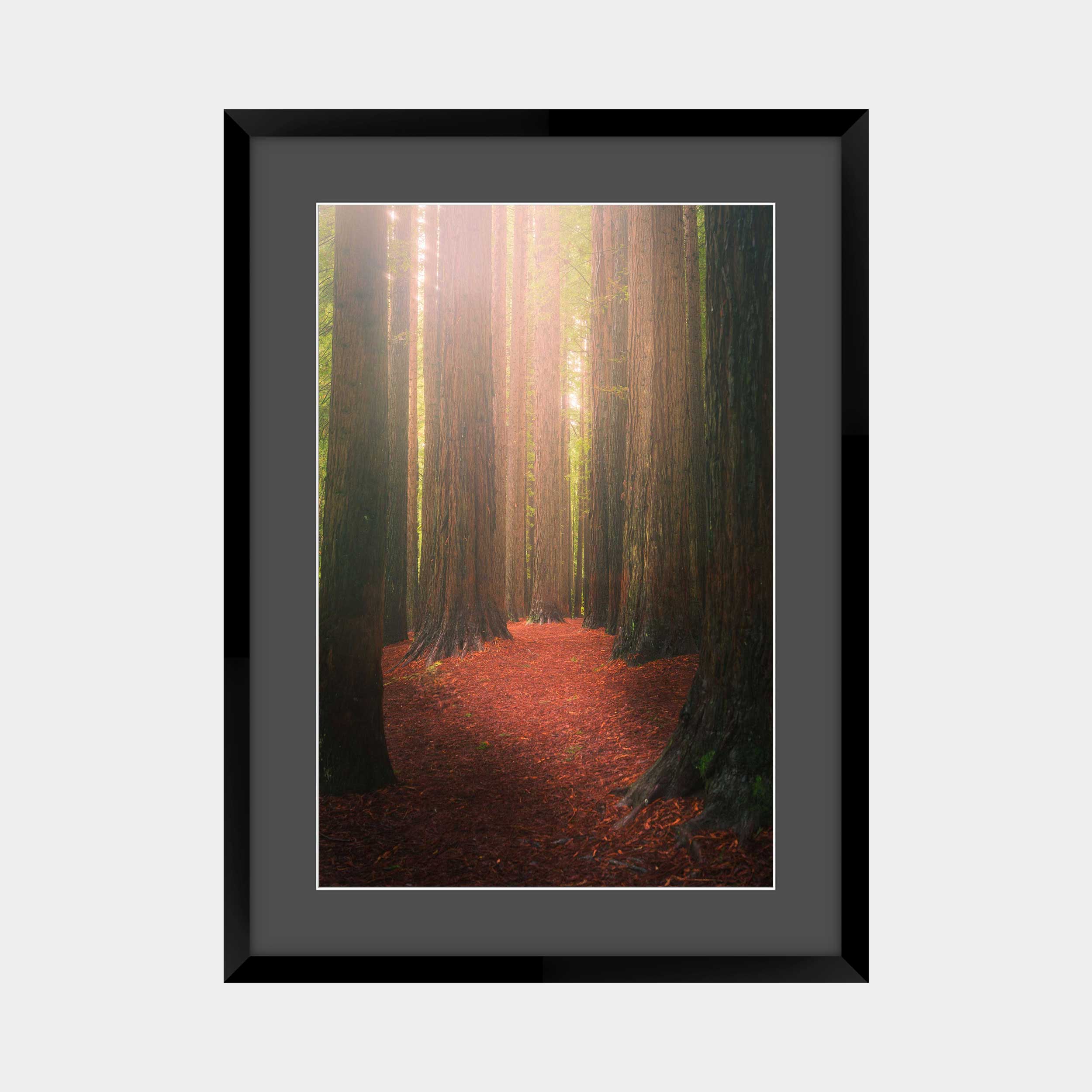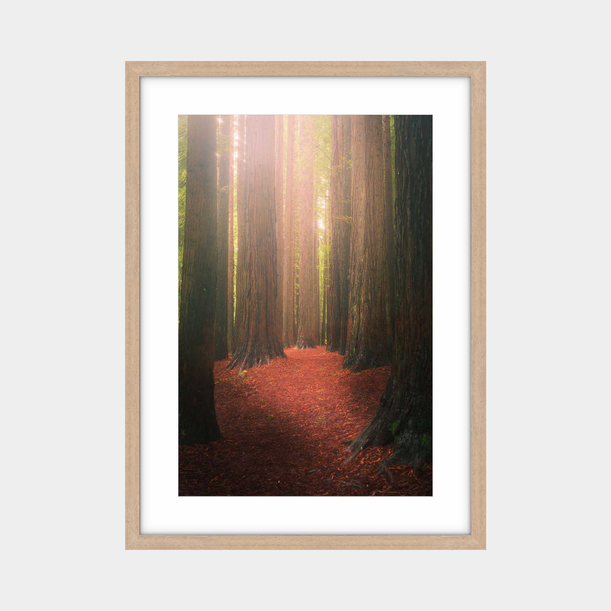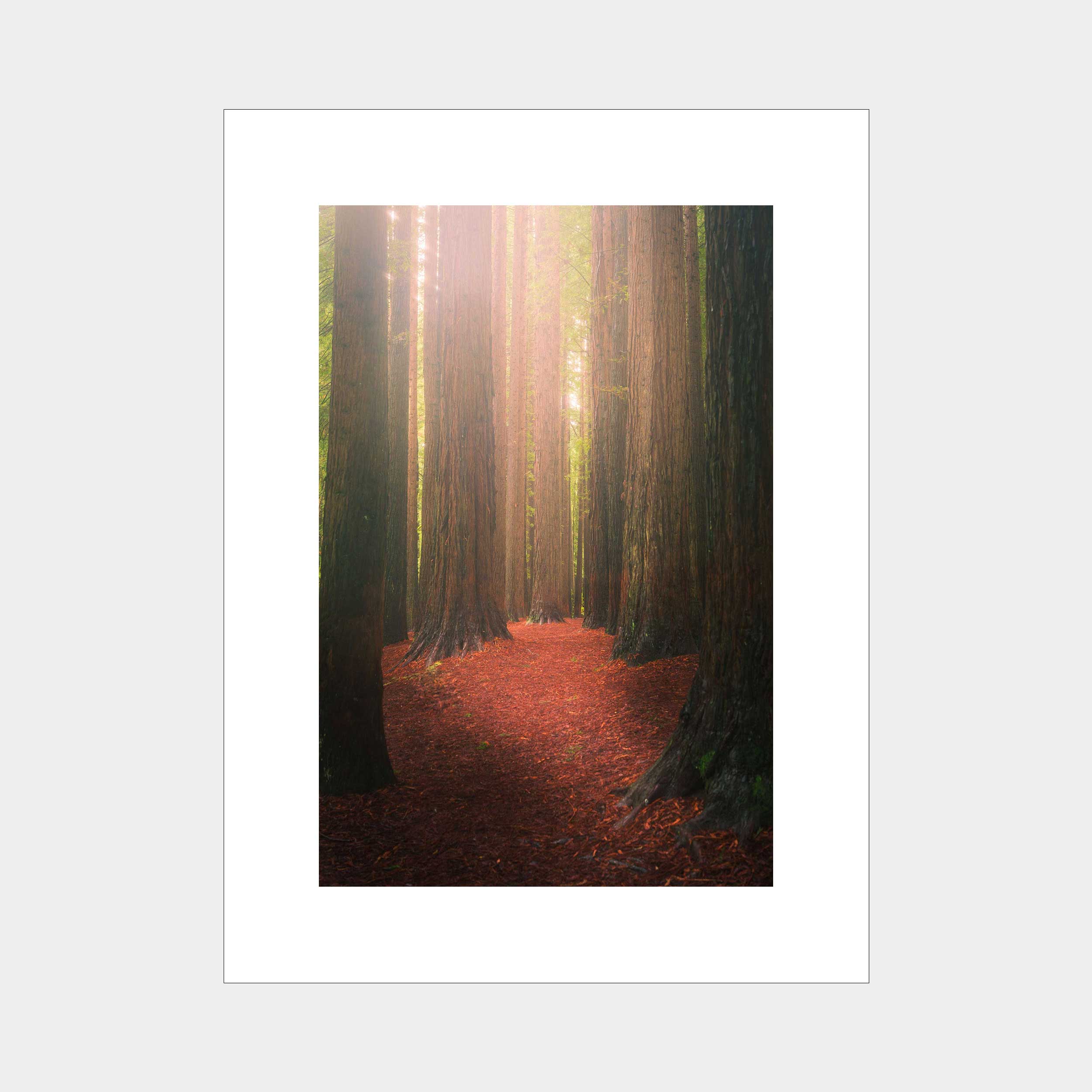 "Otways' Redwood Giants" captures the awe-inspiring presence of the Californian Redwoods in Victoria's Otway National Park. This photograph invites you into a mystical forest where towering trees reach for the heavens, and light filters through a gentle mist, illuminating the rust-red forest floor and evoking a profound sense of peace and ancient wonder.