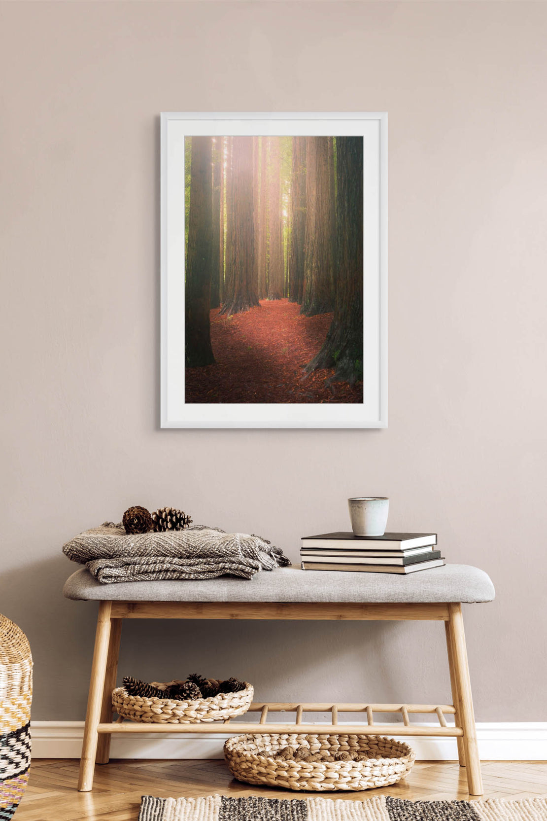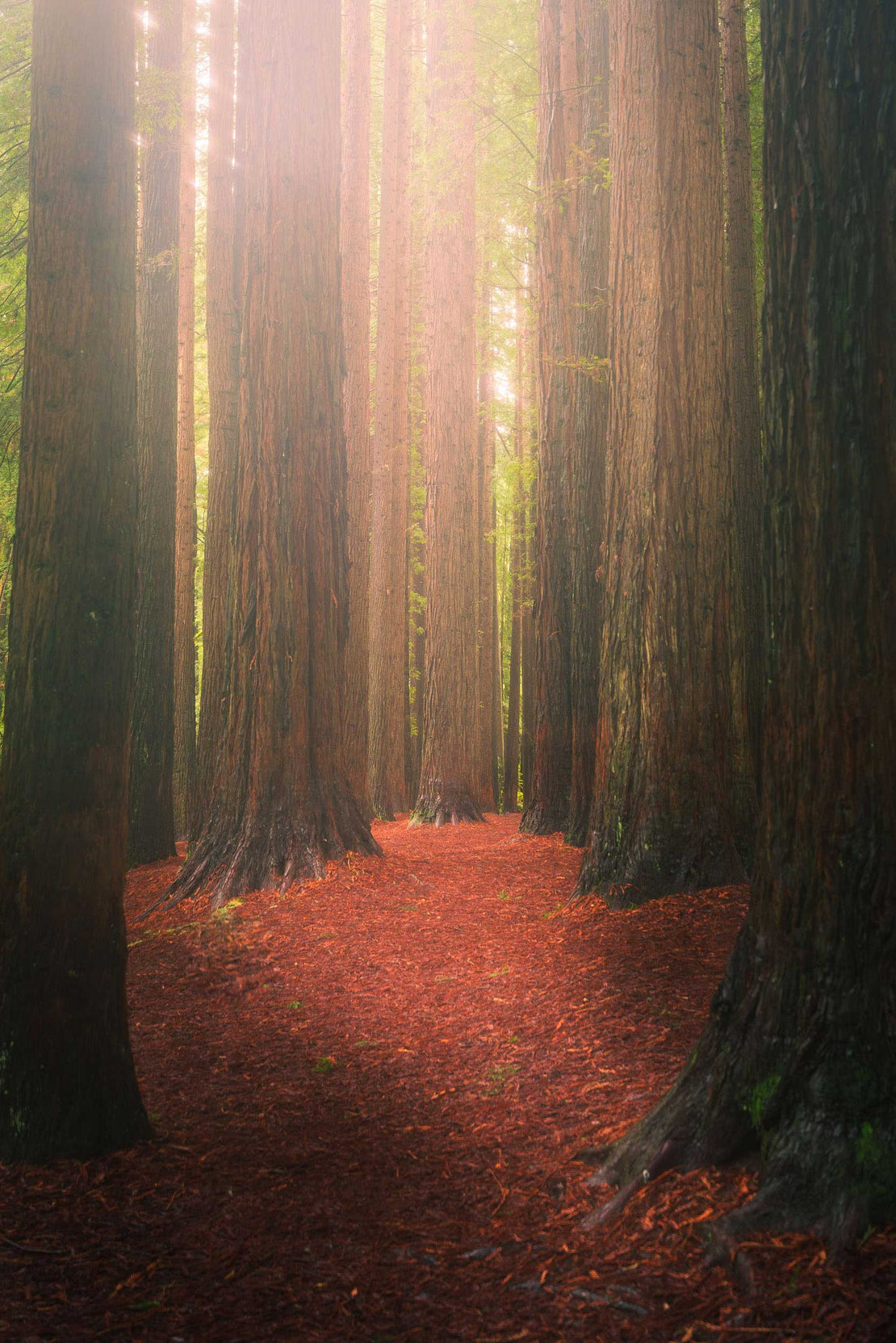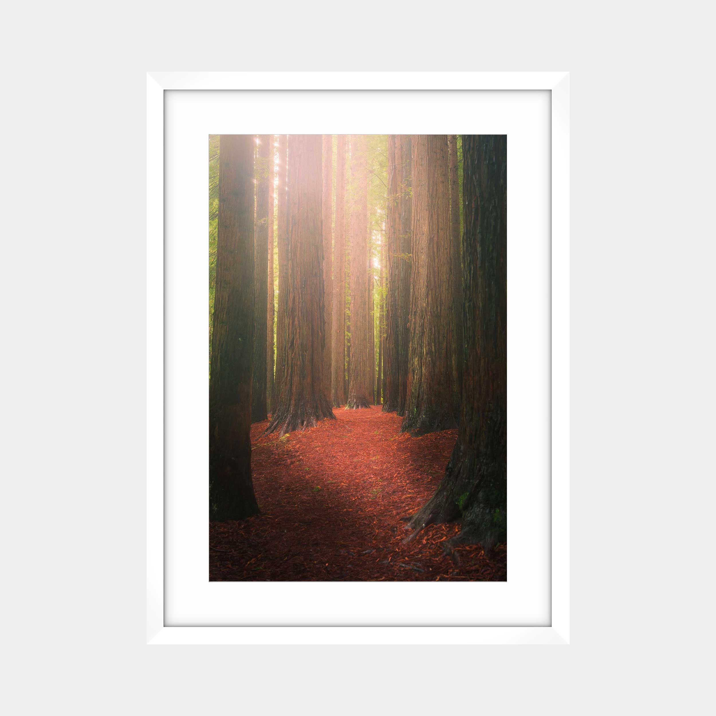 "Otways' Redwood Giants" captures the awe-inspiring presence of the Californian Redwoods in Victoria's Otway National Park. This photograph invites you into a mystical forest where towering trees reach for the heavens, and light filters through a gentle mist, illuminating the rust-red forest floor and evoking a profound sense of peace and ancient wonder.