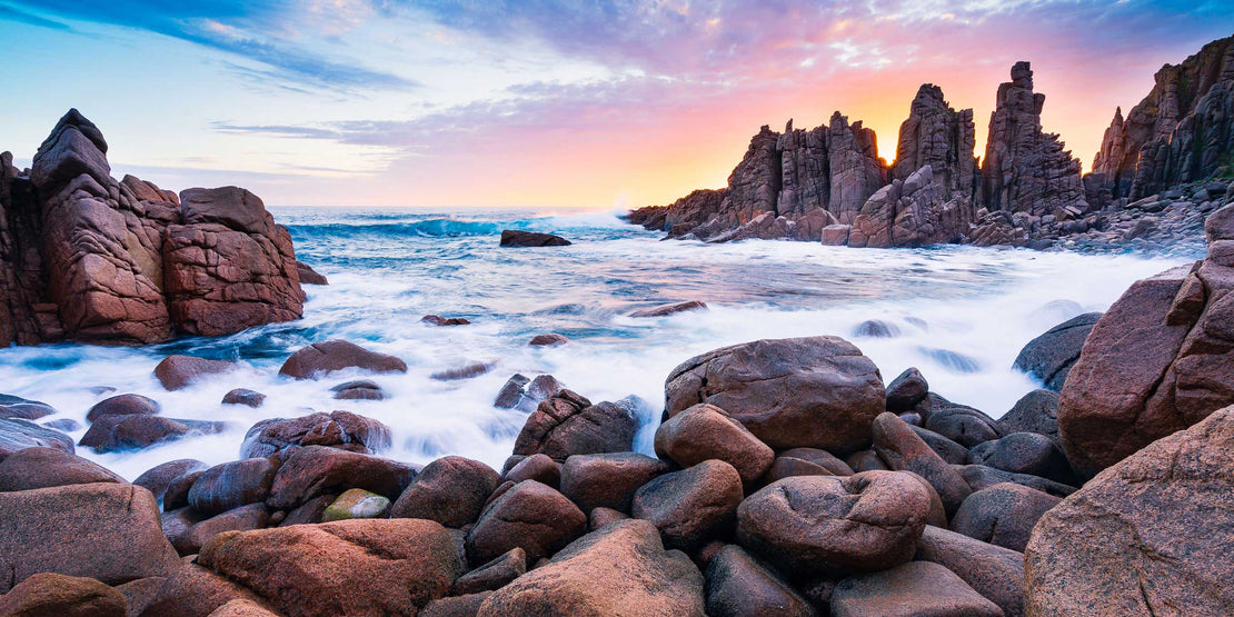 "Pinnacles' Fiery Embrace" captures the dramatic grandeur of The Pinnacles on Phillip Island, Victoria, as the setting sun ignites the rugged rock formations and paints the sky in a breathtaking symphony of color. Witness the power of the ocean as waves crash against the ancient coastline, a timeless spectacle of nature's raw beauty.