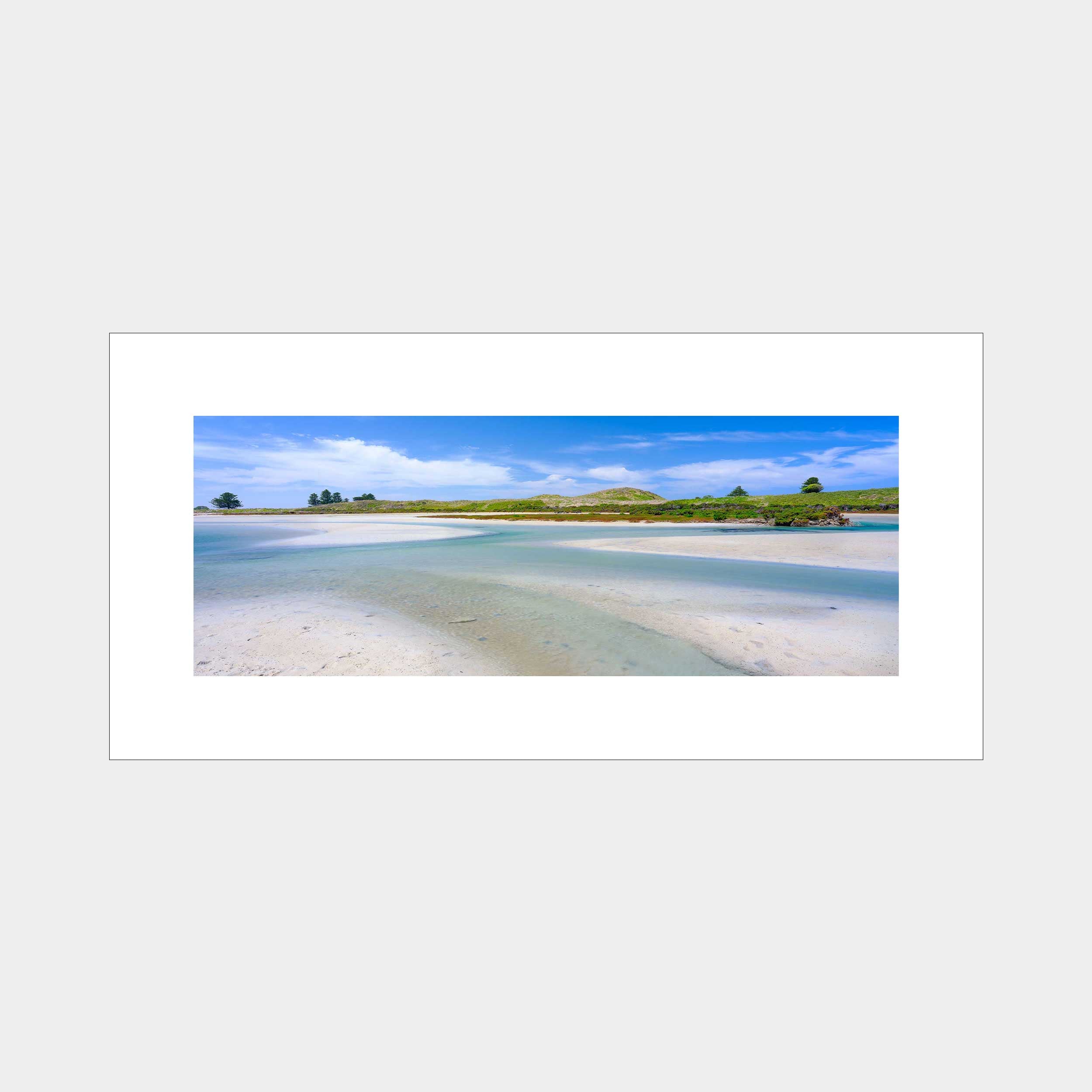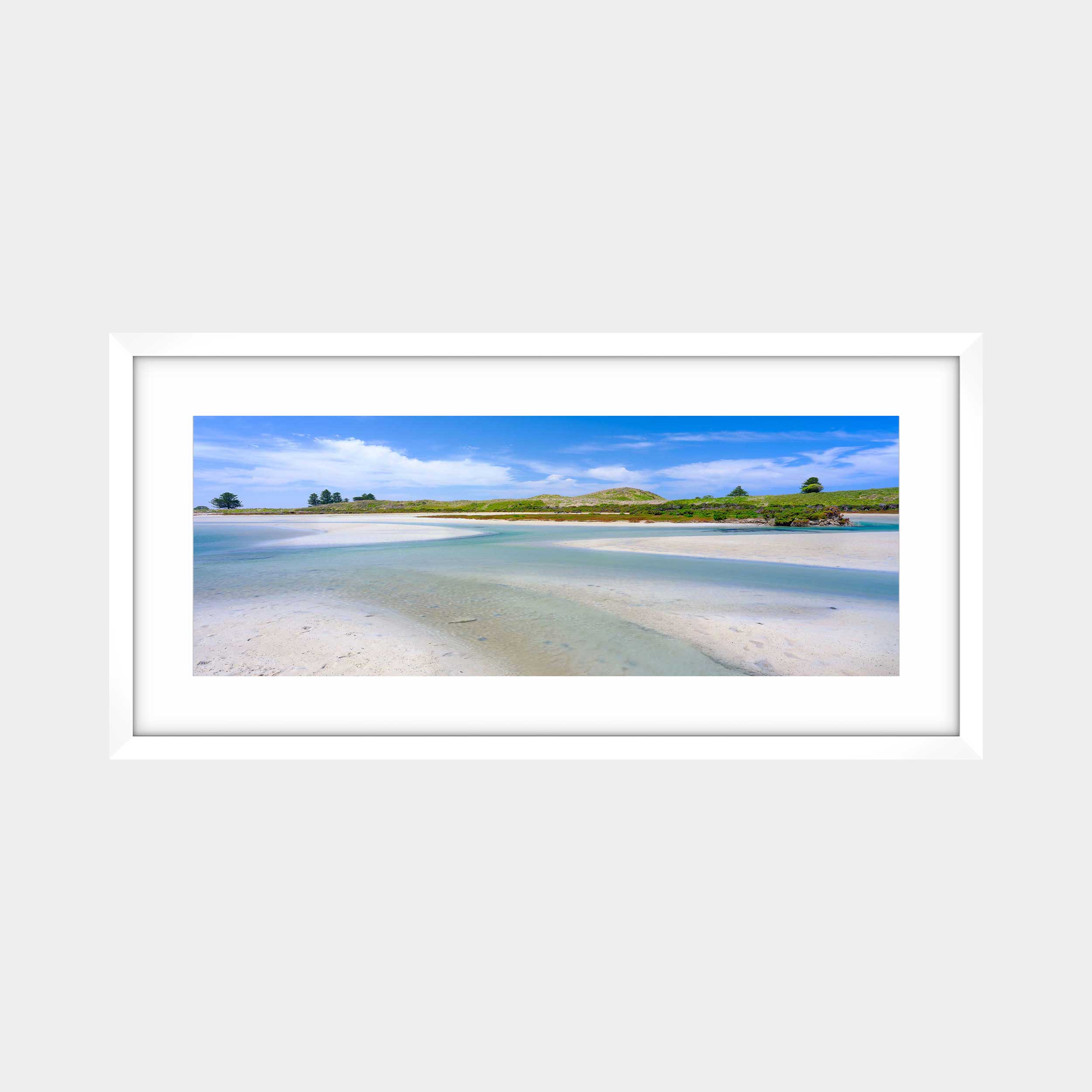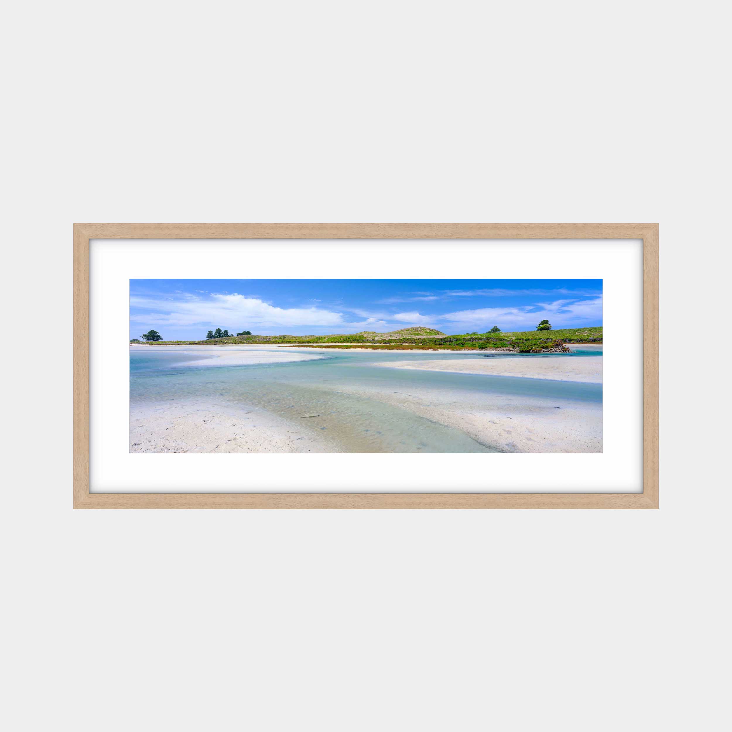 "Port Fairy Estuary" captures the serene and picturesque coastal landscape of Port Fairy, Victoria, showcasing a tranquil estuary winding through pristine white sands. This vibrant panoramic photograph highlights the delicate patterns of the flowing water, the gentle dunes covered in sparse green vegetation, and the bright blue sky, embodying the peaceful and untouched beauty of this charming Australian coastal town.