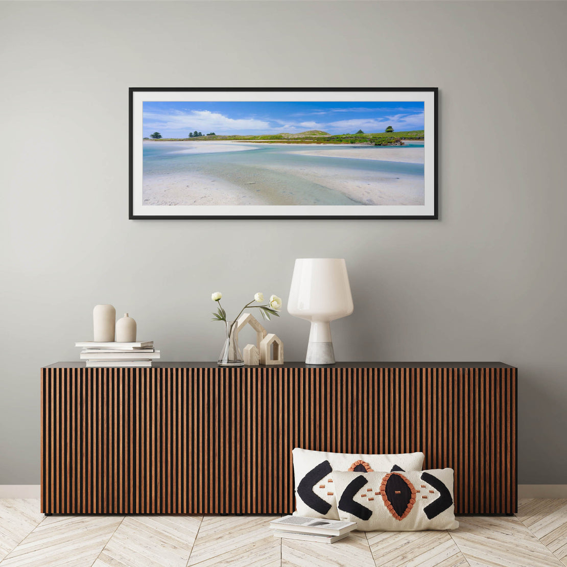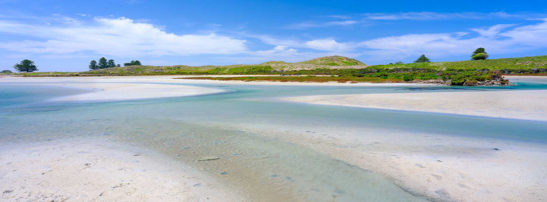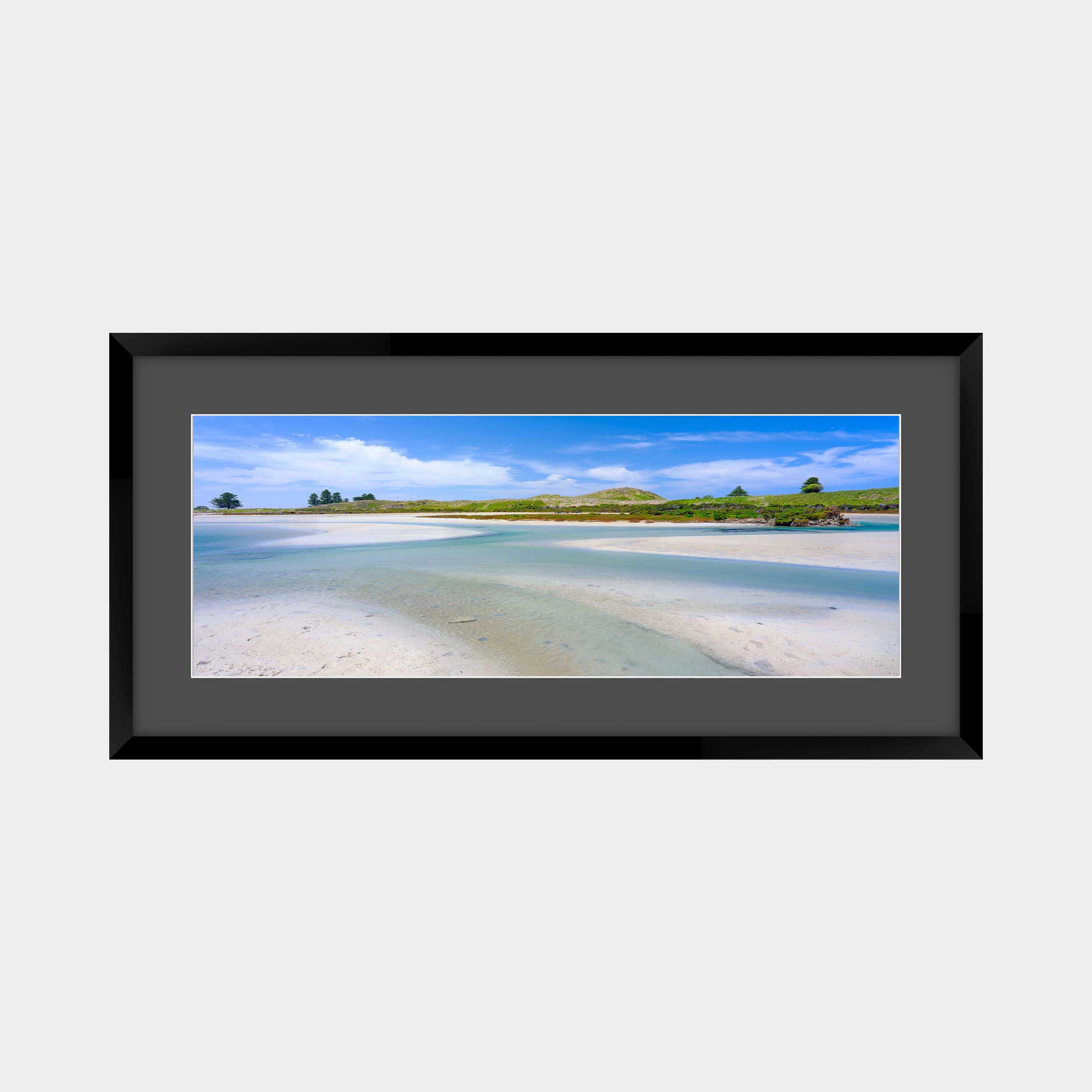 "Port Fairy Estuary" captures the serene and picturesque coastal landscape of Port Fairy, Victoria, showcasing a tranquil estuary winding through pristine white sands. This vibrant panoramic photograph highlights the delicate patterns of the flowing water, the gentle dunes covered in sparse green vegetation, and the bright blue sky, embodying the peaceful and untouched beauty of this charming Australian coastal town.