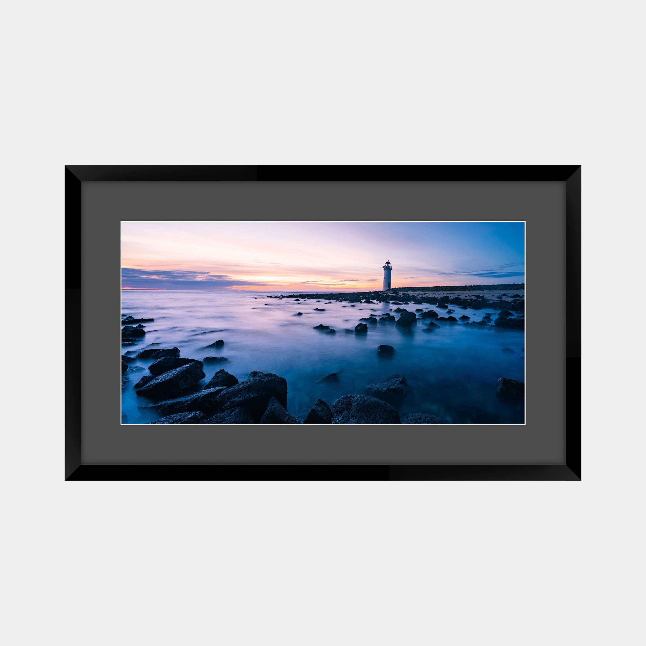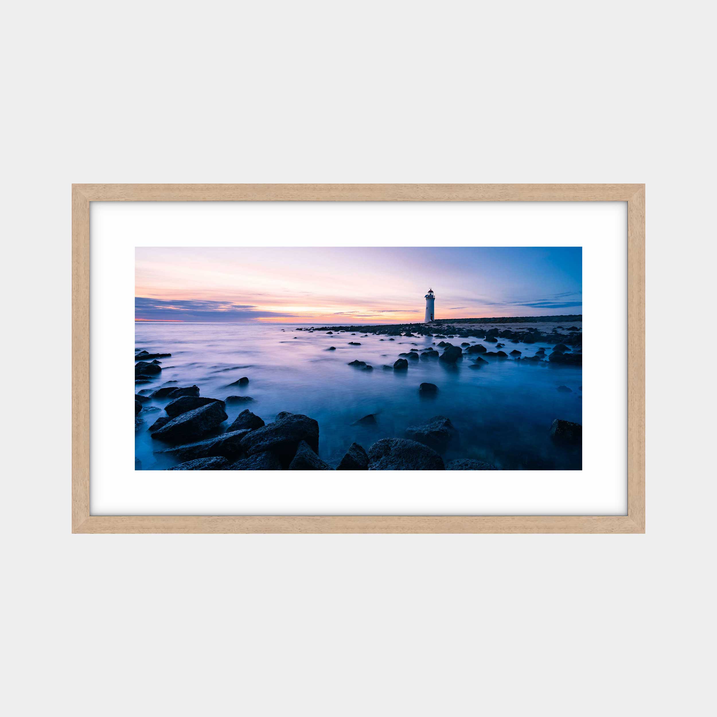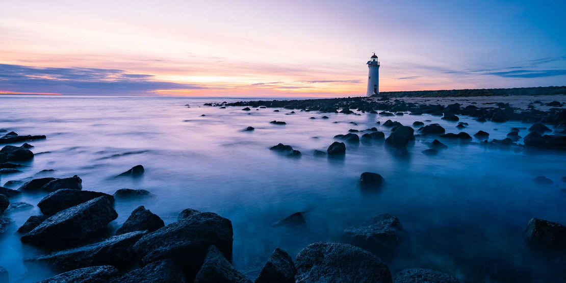 "Port Fairy's Coastal Sentinel" captures the serene beauty of the Port Fairy Lighthouse in Victoria, Australia, as the first light of sunrise washes over the rugged coastline. The iconic white tower stands steadfast against a sky painted with soft, emerging hues, while the long exposure of the ocean creates a calming, ethereal flow over the dark, textured rocks below, inviting tranquility into your space.