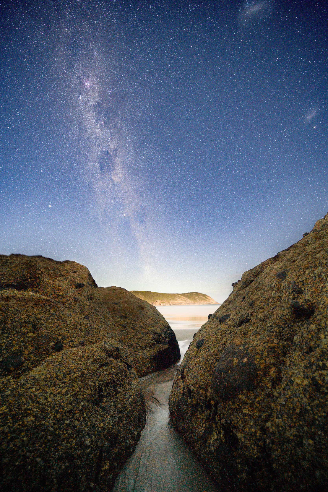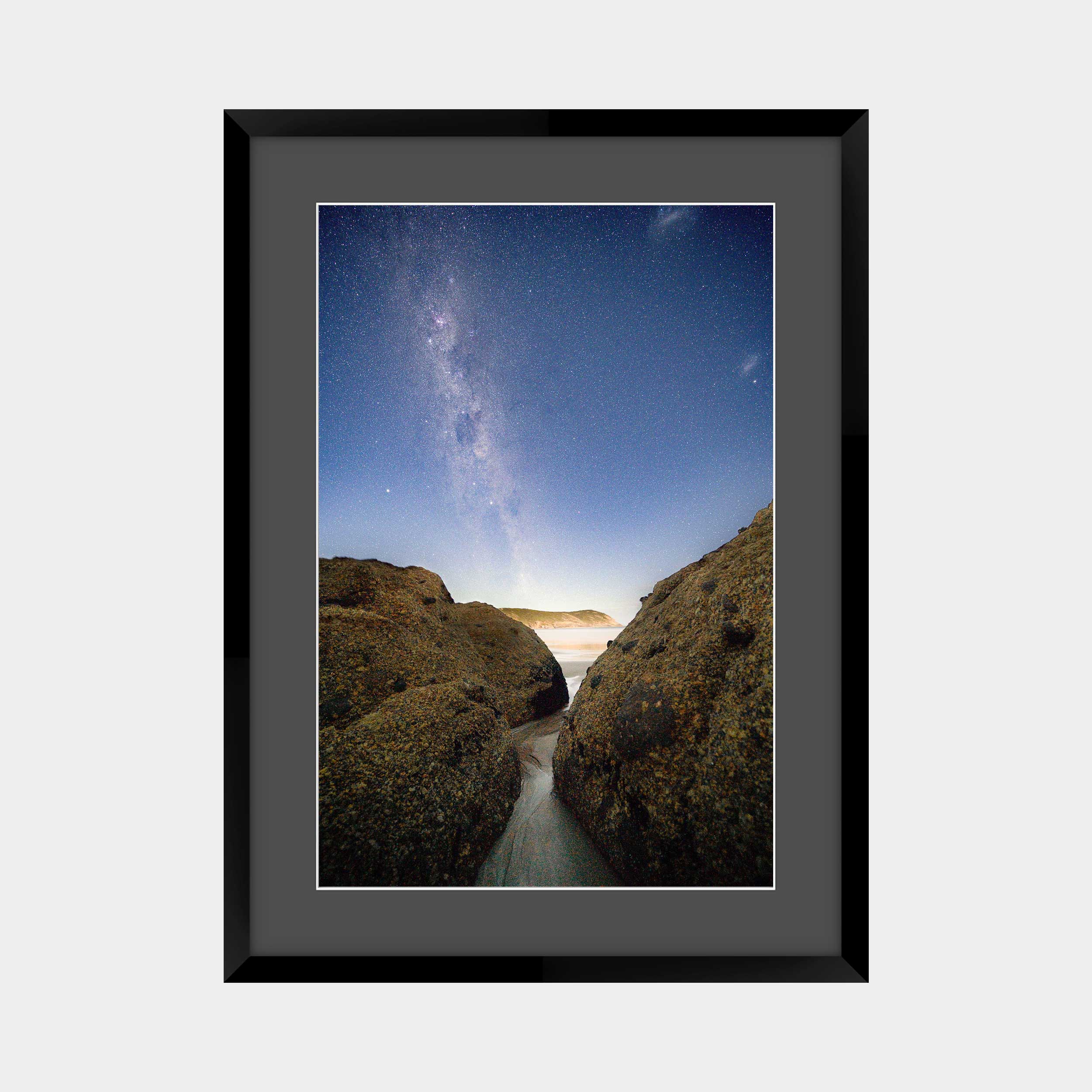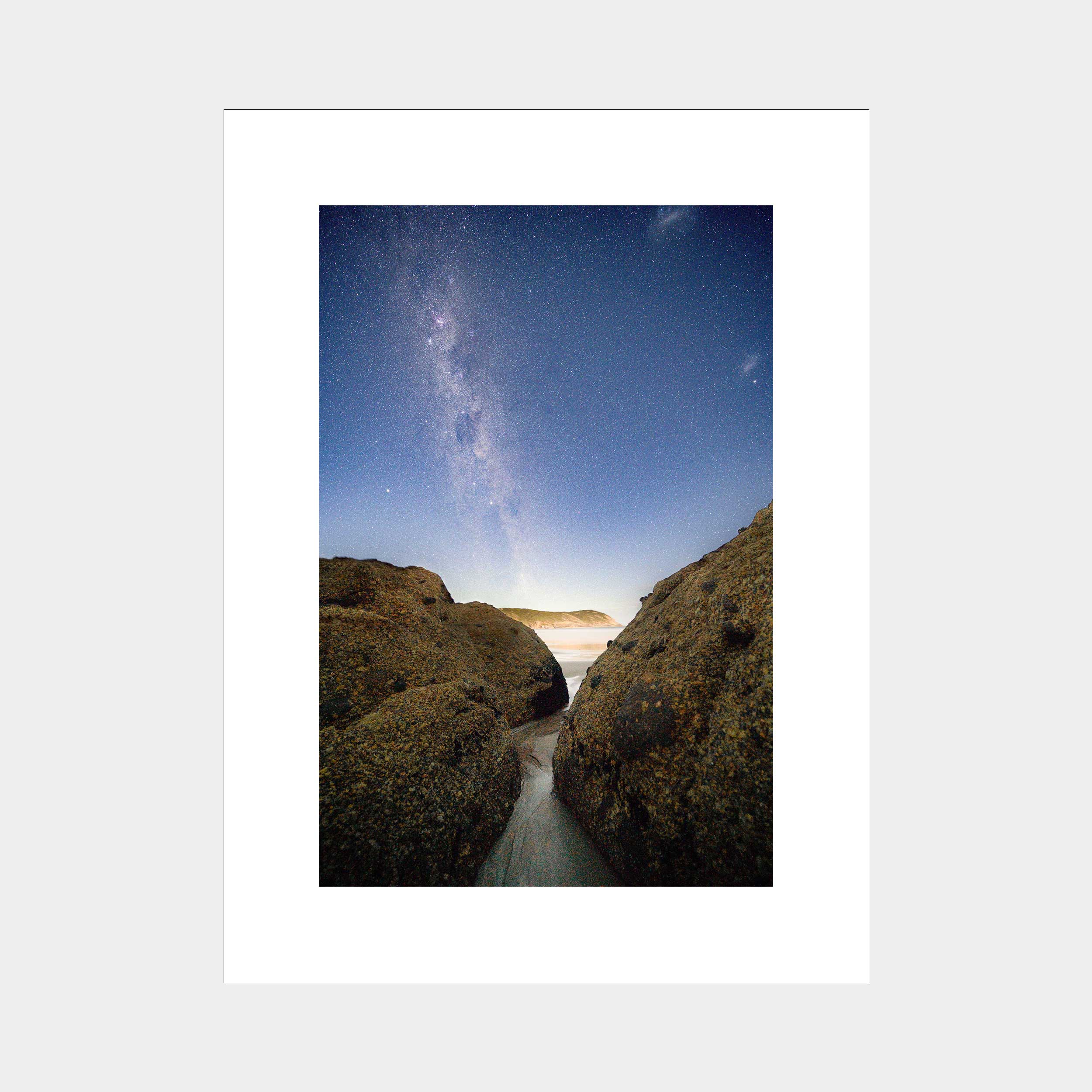 "Promontory's Cosmic Gateway" captures a truly spectacular night sky over the rugged coastline of Wilsons Promontory National Park, Victoria. This photograph features the majestic band of the Milky Way arcing powerfully above ancient rock formations and a distant beach, revealing the profound connection between earth and cosmos in one of Australia's most pristine wilderness areas.