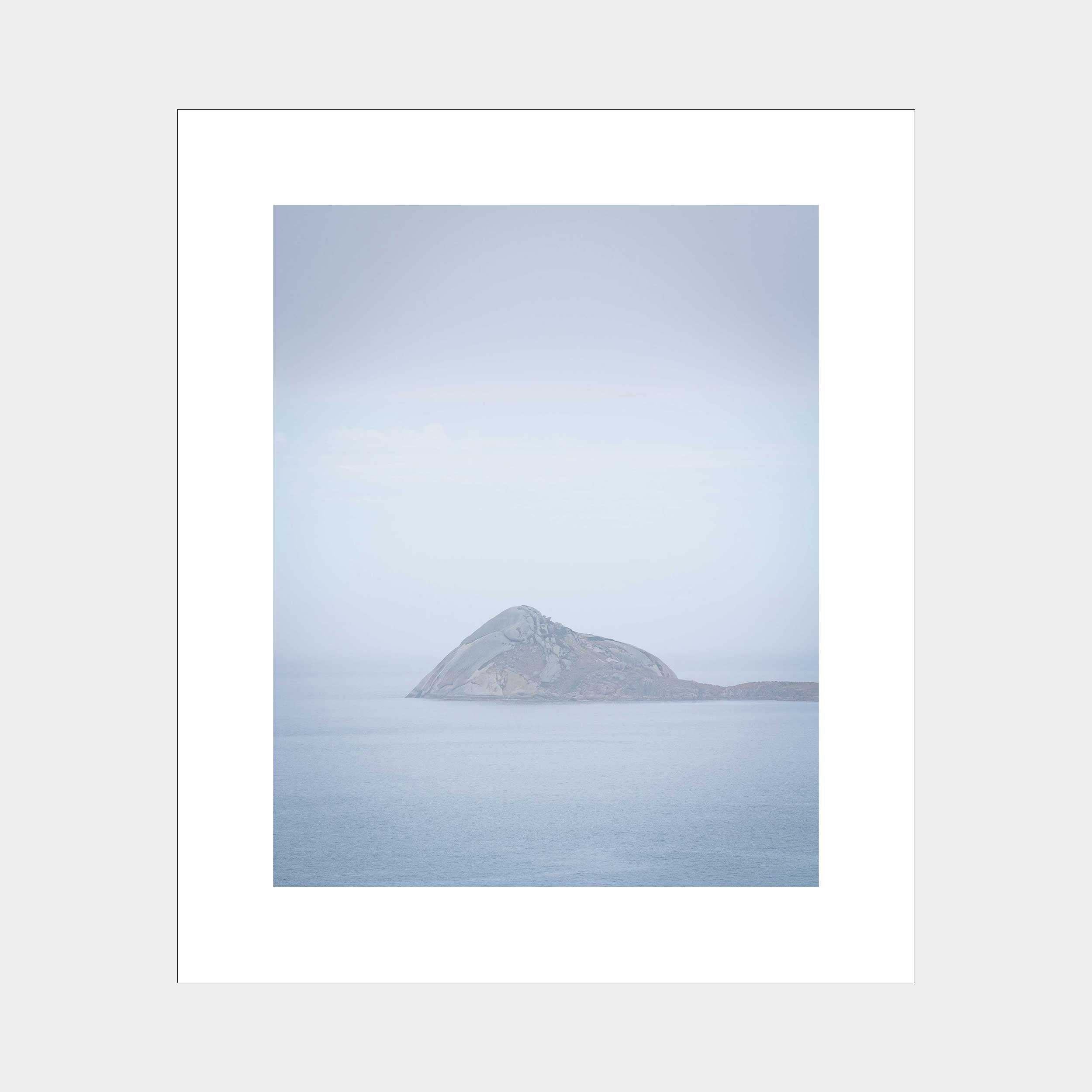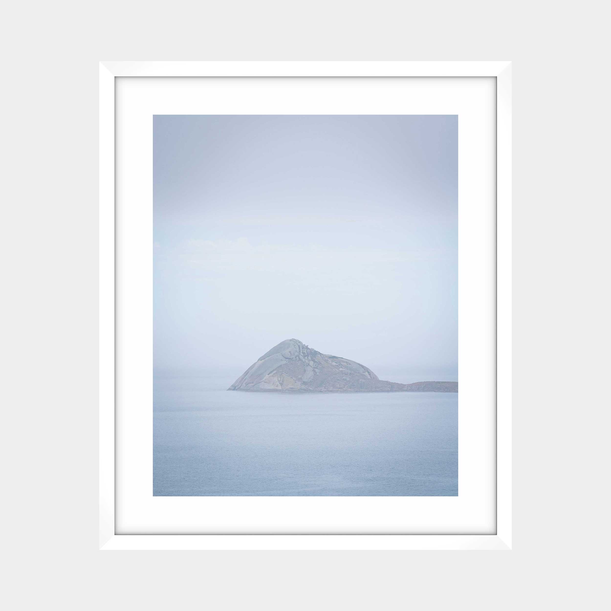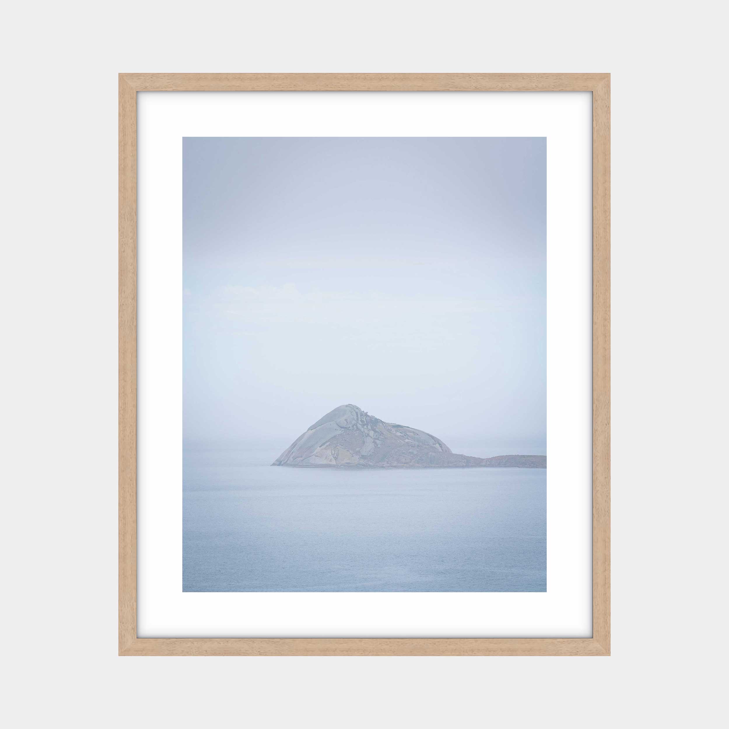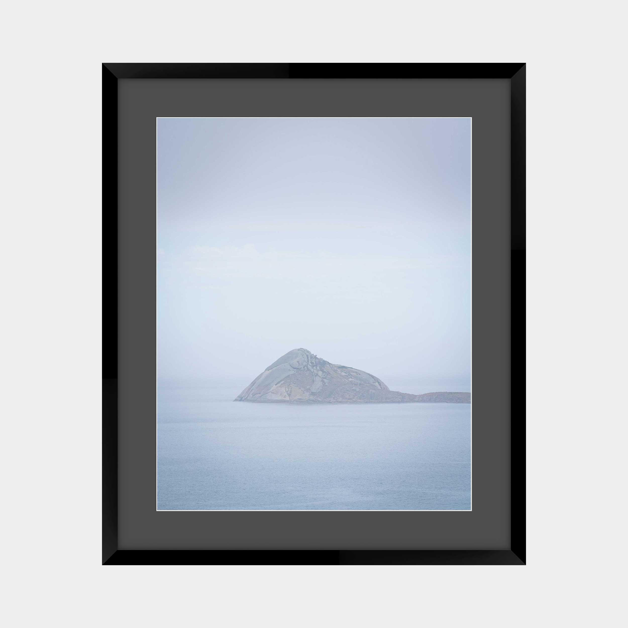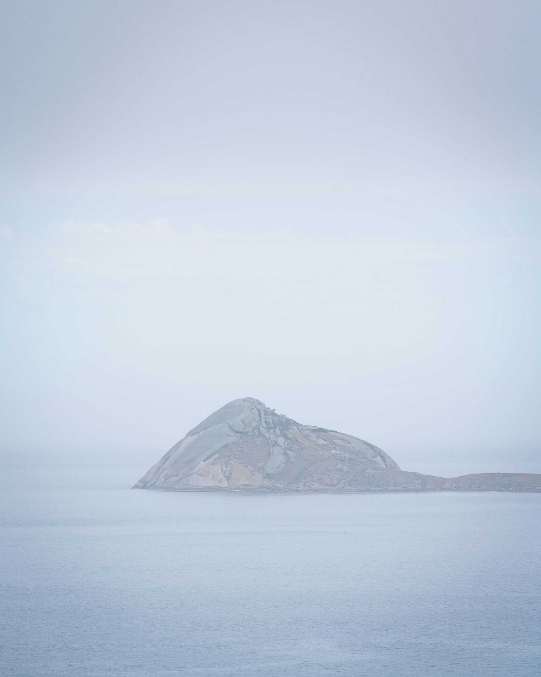 "Promontory's Gentle Giant" captures a captivating, minimalist view of Wilsons Promontory National Park, Victoria, showcasing a majestic granite island rising serenely from the tranquil waters. Under a softly diffused sky, this photograph embodies the profound peace and enduring geological grandeur of 'The Prom's' iconic coastal landscape.