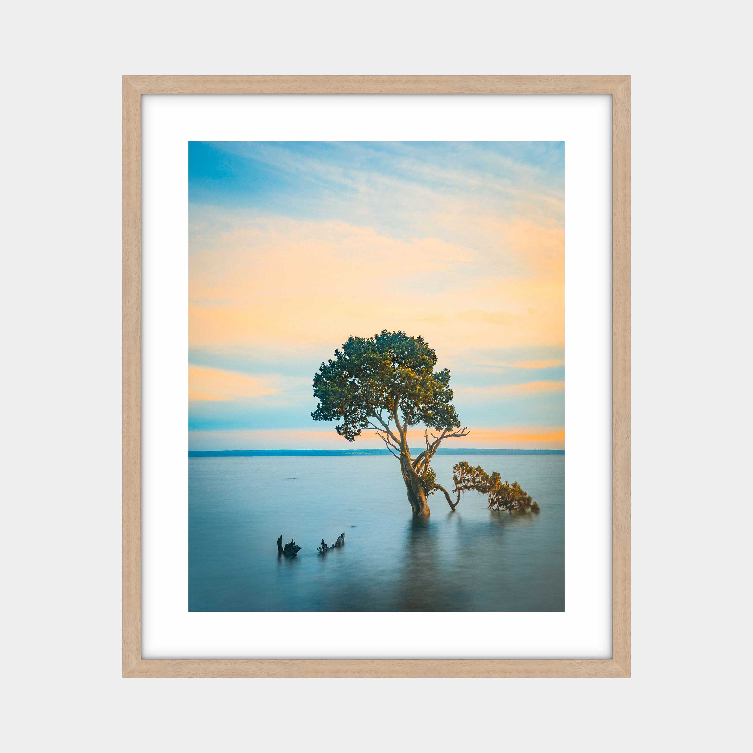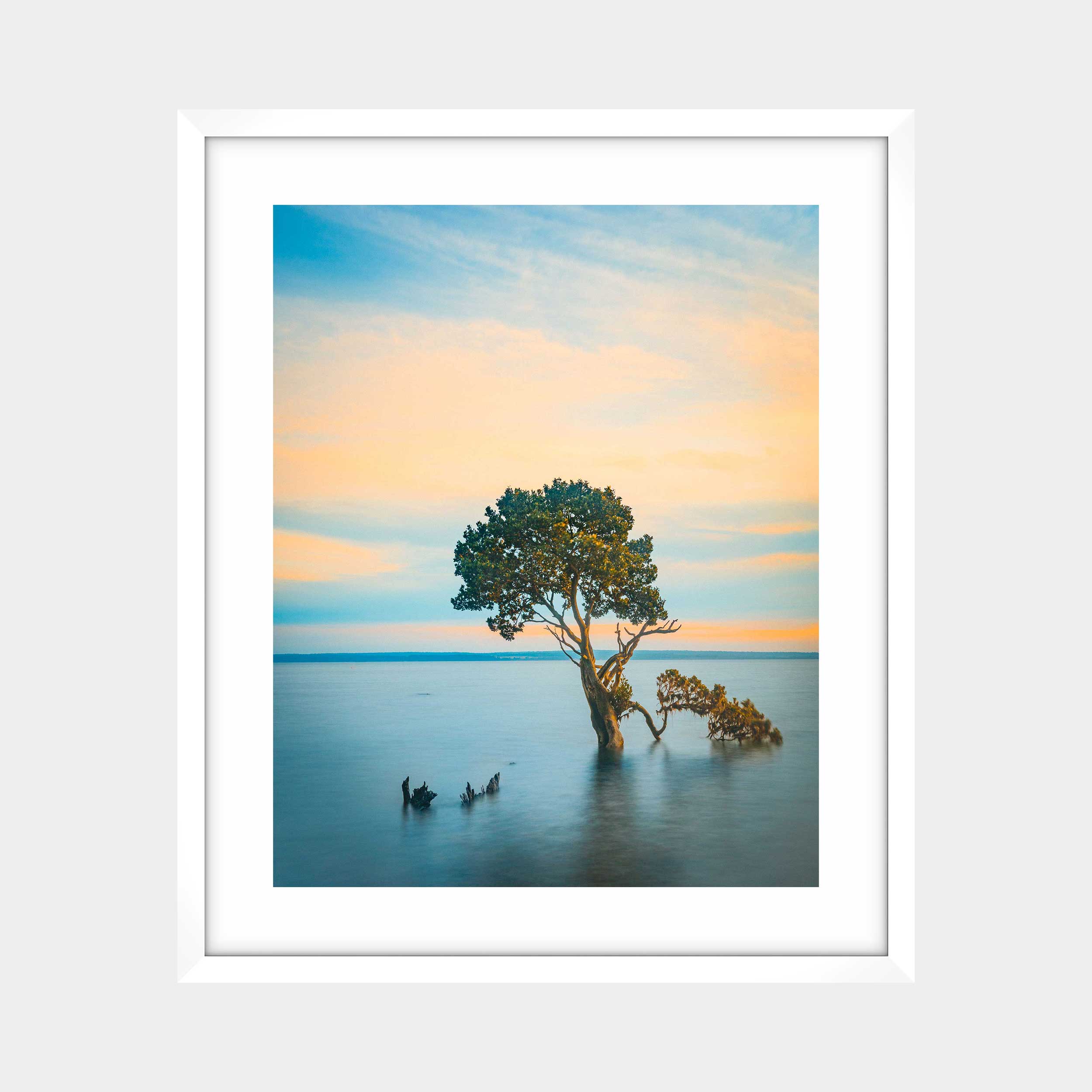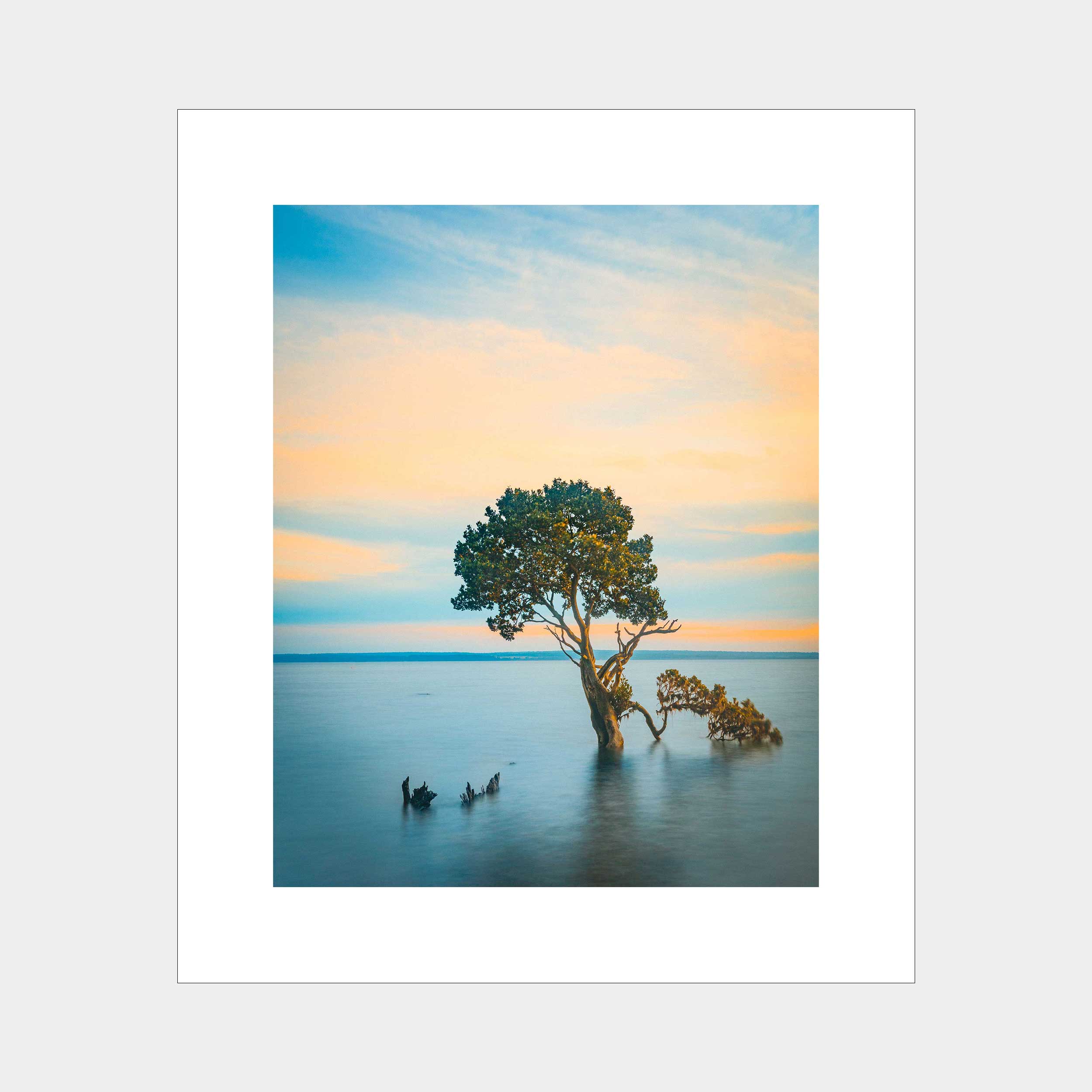 "Tenby's Lone Sentinel" captures the serene, ethereal beauty of a now-lost iconic tree at Tenby Point, Victoria, near Phillip Island. This photograph, taken when the tide and light perfectly aligned, portrays the resilient tree standing in calm, reflective waters under a soft, painterly sky, offering a timeless glimpse of a tranquil coastal moment that sadly no longer exists.
