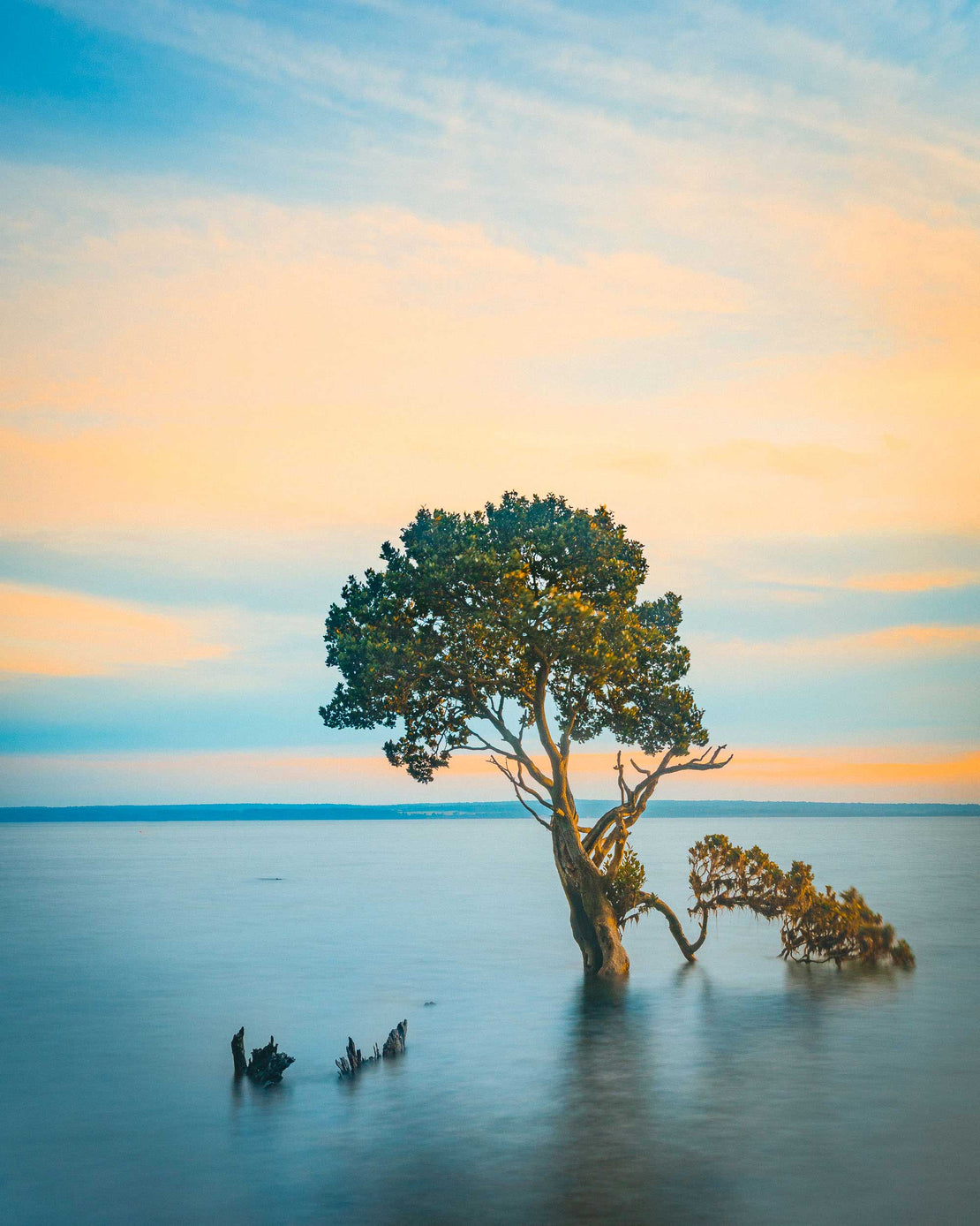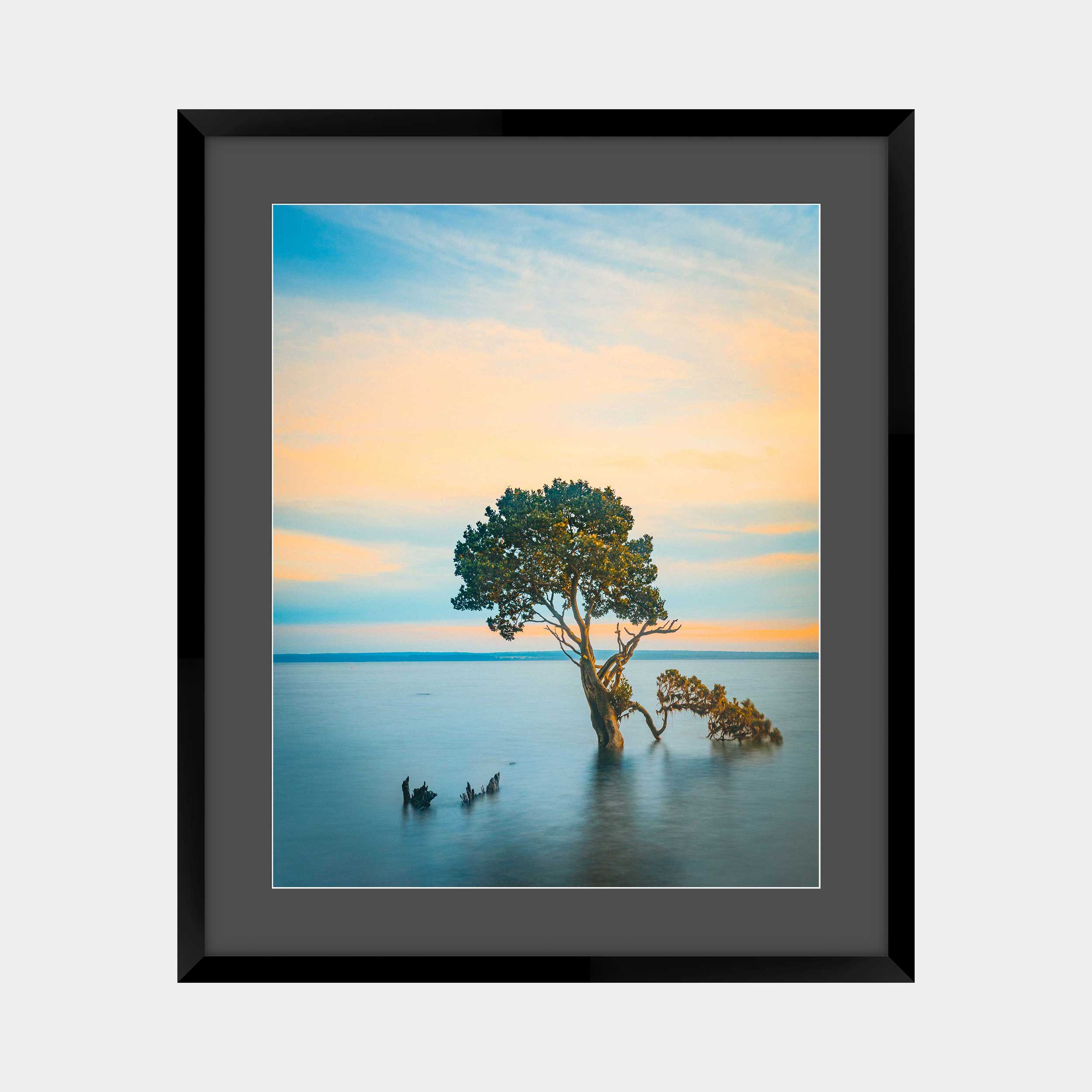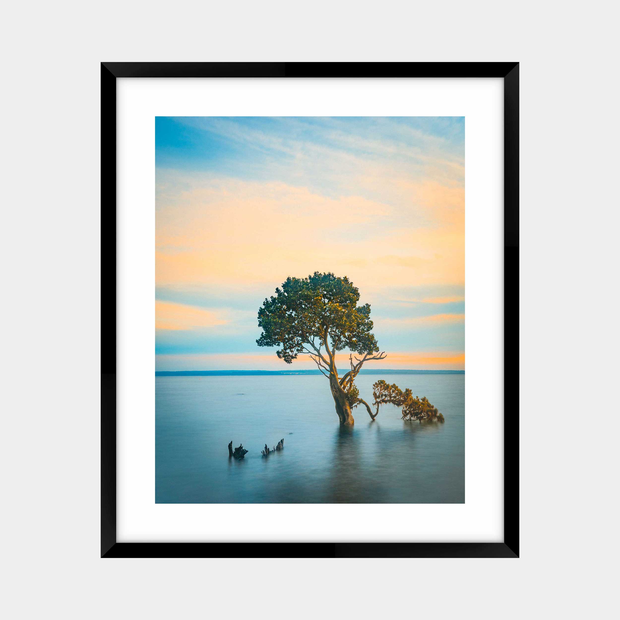 "Tenby's Lone Sentinel" captures the serene, ethereal beauty of a now-lost iconic tree at Tenby Point, Victoria, near Phillip Island. This photograph, taken when the tide and light perfectly aligned, portrays the resilient tree standing in calm, reflective waters under a soft, painterly sky, offering a timeless glimpse of a tranquil coastal moment that sadly no longer exists.
