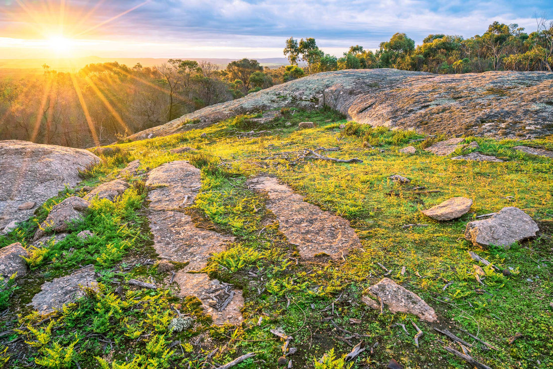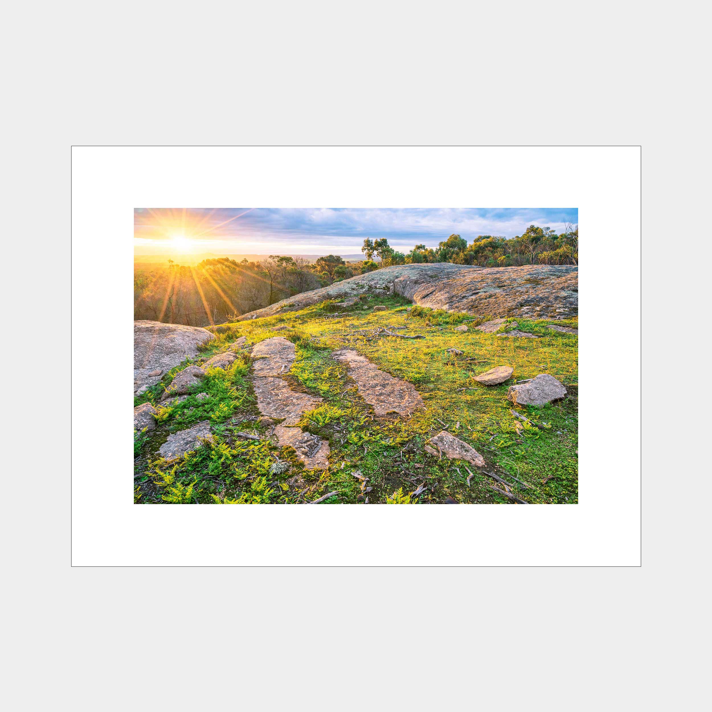 "You Yangs' Golden Granite" captures a unique, intimate landscape within Victoria's You Yangs Regional Park at sunset. This photograph showcases the park's distinct, ancient rock formations and rugged terrain, bathed in the rich, warm glow of the setting sun, revealing a hidden tranquility and textural beauty off the well-worn paths.