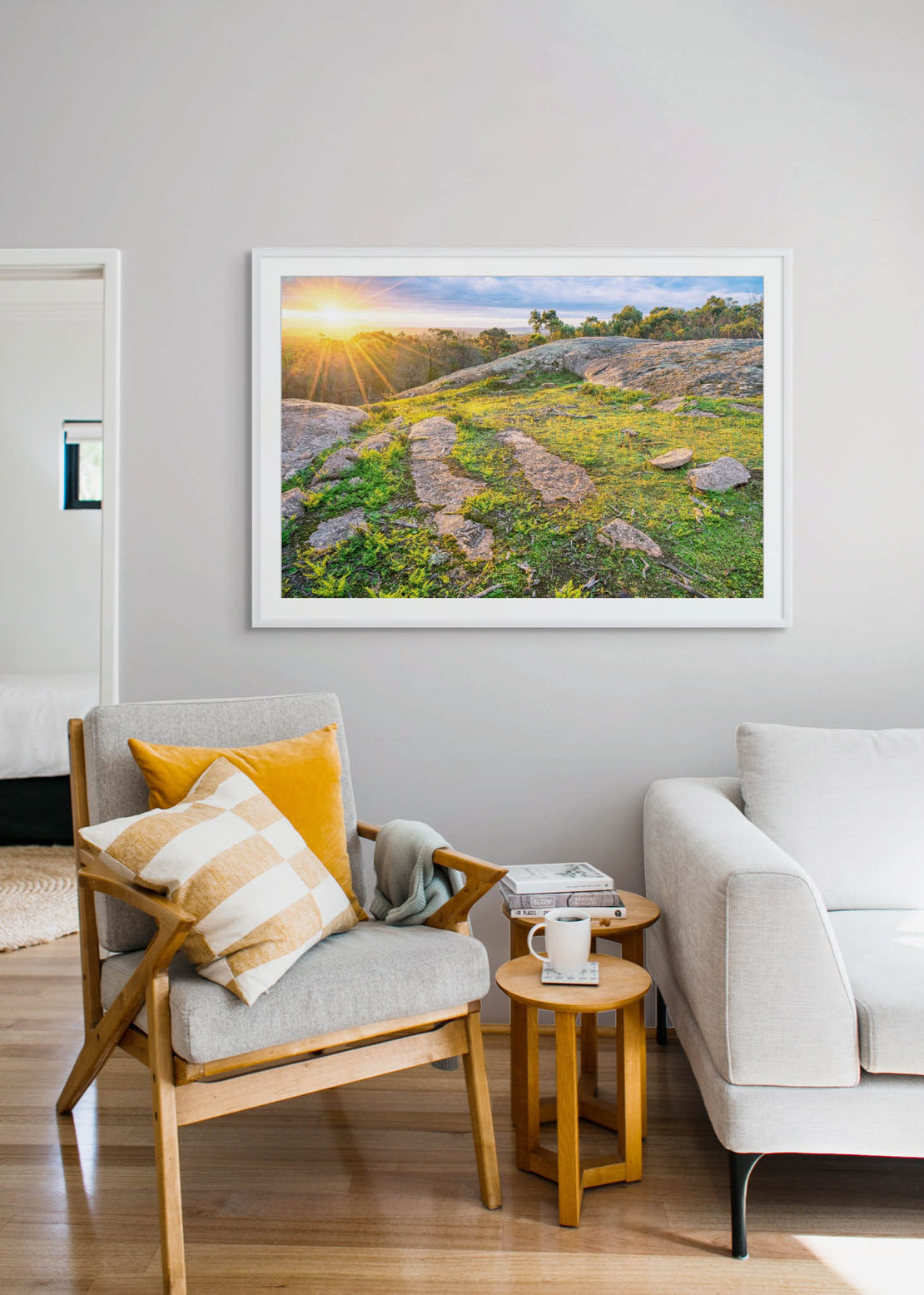 Every piece of art you receive is a testament to quality craftsmanship, born and made right here in Australia. Our premium prints are produced on fine art archival-grade paper, ensuring the vibrant colours of each landscape will stay brilliant for decades. The art is then meticulously framed by an Australian framer with over 35 years of expertise. Each frame is truly a handcrafted masterpiece, made from sustainably sourced, premium timber and finished with UV protection to safeguard your art for years to come.